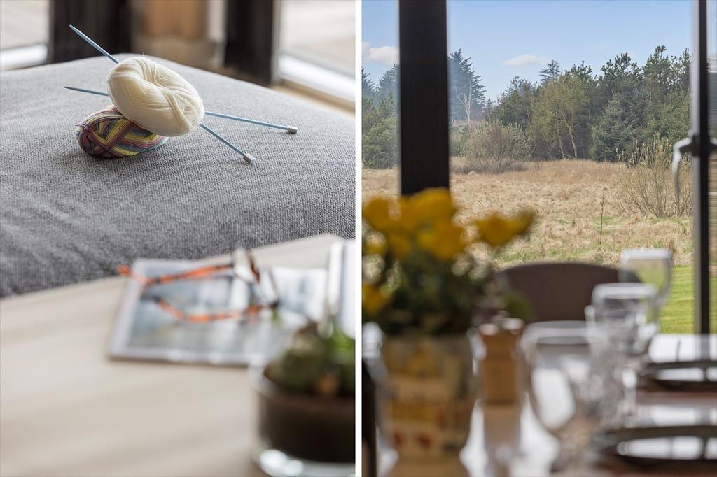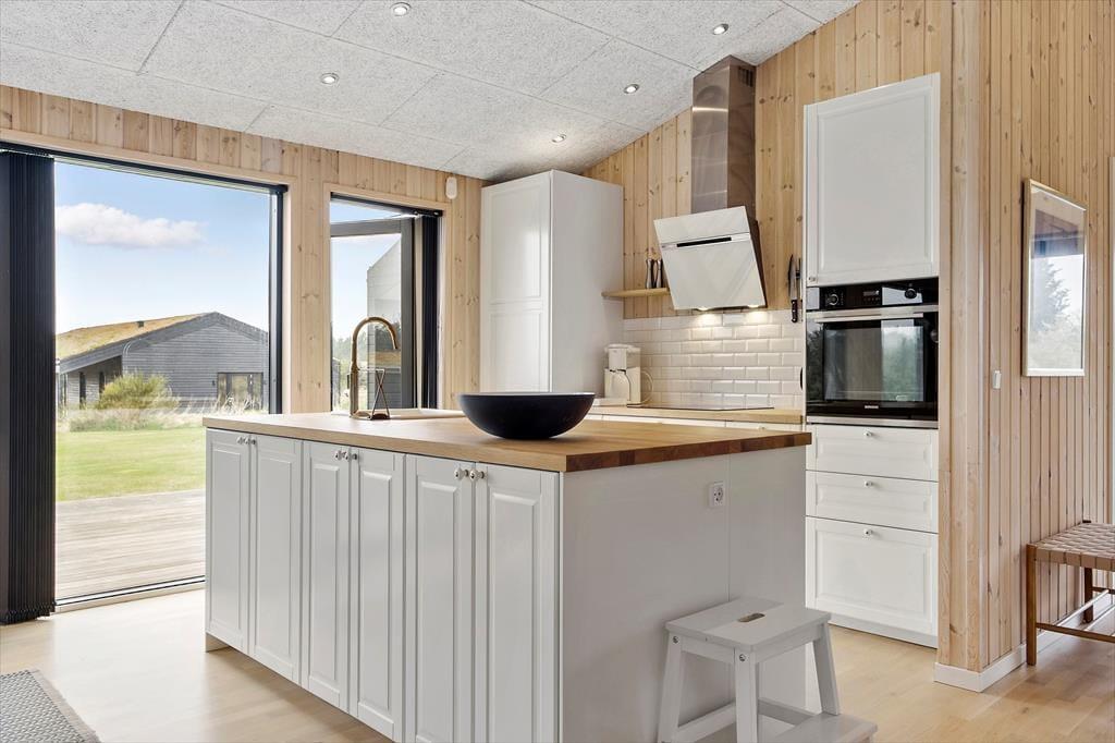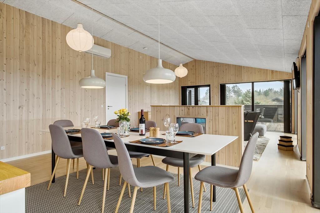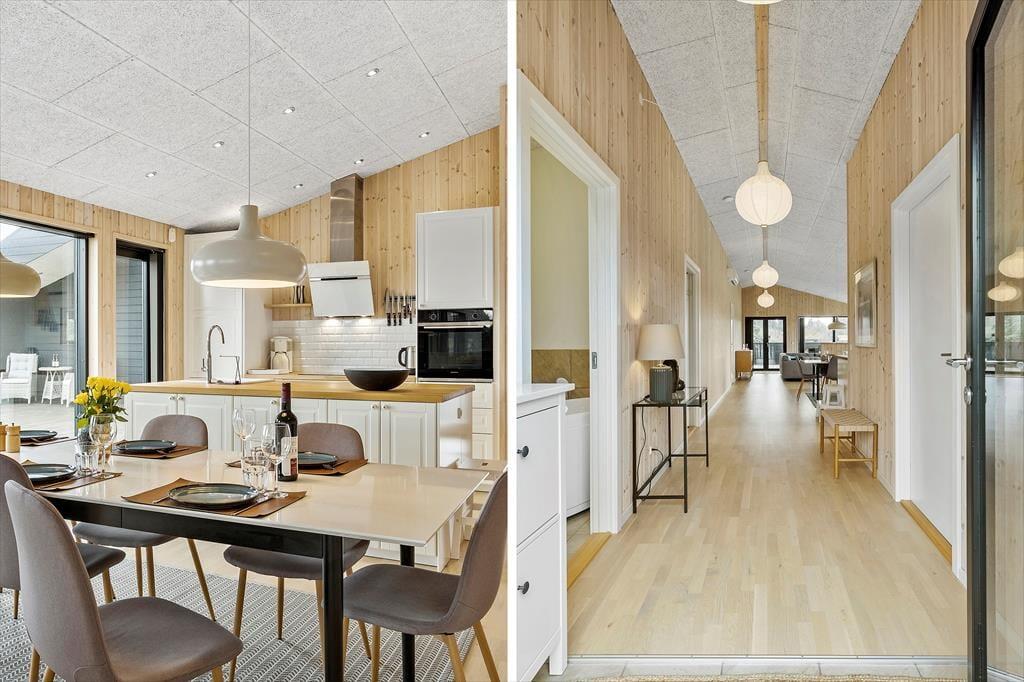 Indenfor mødes I af et lyst og åbent køkken/alrum, hvor det er nemt at samles om måltiderne eller hygge sig i stuen. De store vinduespartier giver et fantastisk lysindfald og udsigt til den omkringliggende natur. Huset er indrettet med fokus på komfort og funktionalitet, hvilket gør det til et ideelt sted at tilbringe ferien.