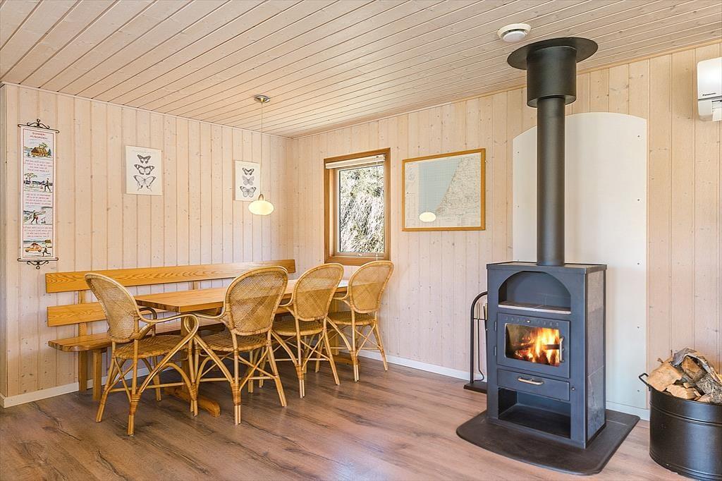 Som du træder ind i sommerhuset, bliver du mødt af et åbent og lyst køkken- og opholdsrum. Her er der god plads til samvær og afslapning, og de store vinduespartier lader solen strømme ind i rummet, så du altid føler dig tættere på naturen udenfor. Det åbne køkken giver mulighed for at tilberede lækre måltider, samtidig med at du kan være en del af samtalerne, mens andre slapper af i den hyggelige stue. Når mørket falder på, kan I tænde op i brændeovnen og skabe en hyggelig og varm stemning – perfekt til lange vinteraftener med familie og venner.