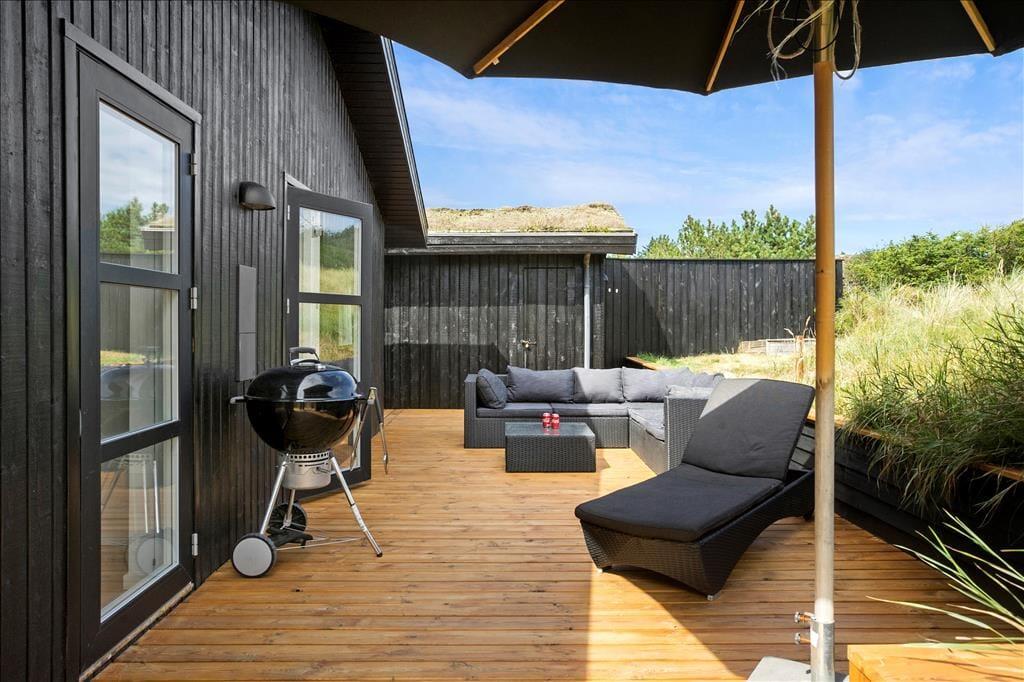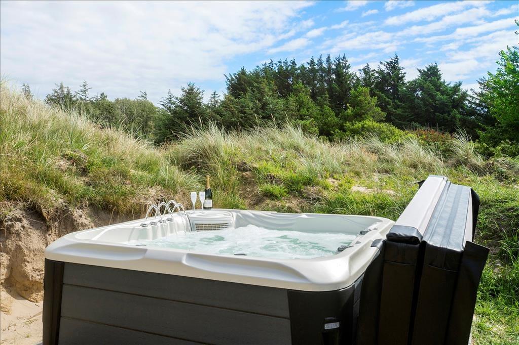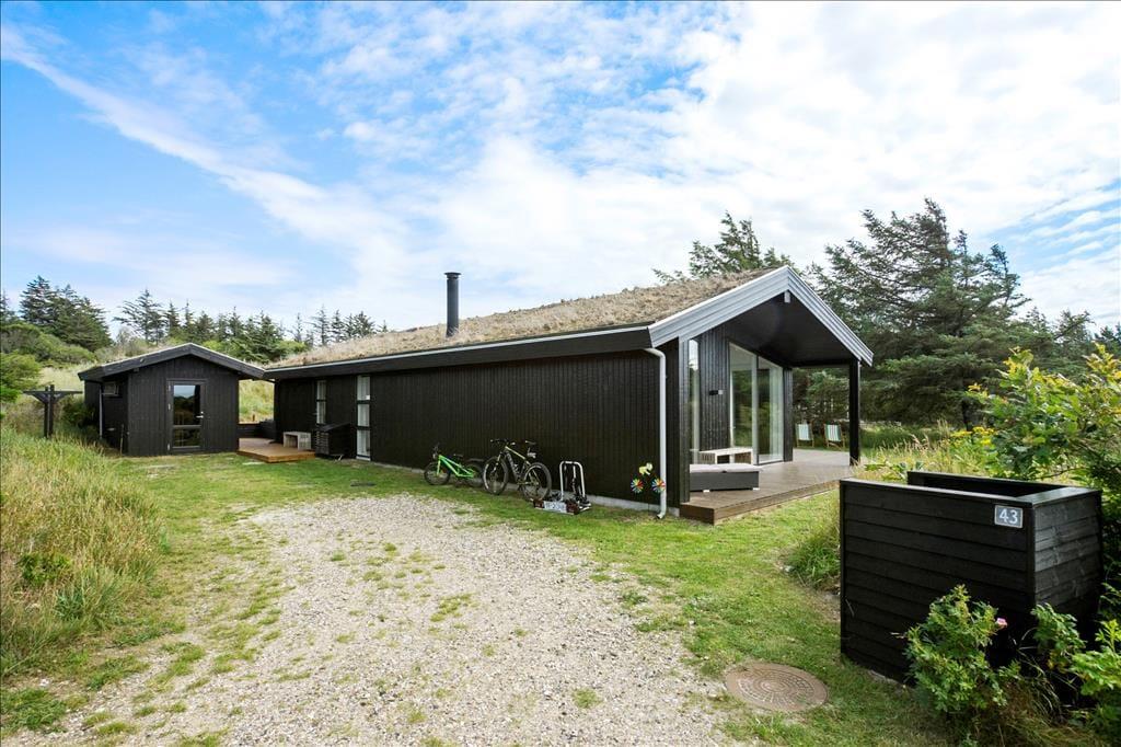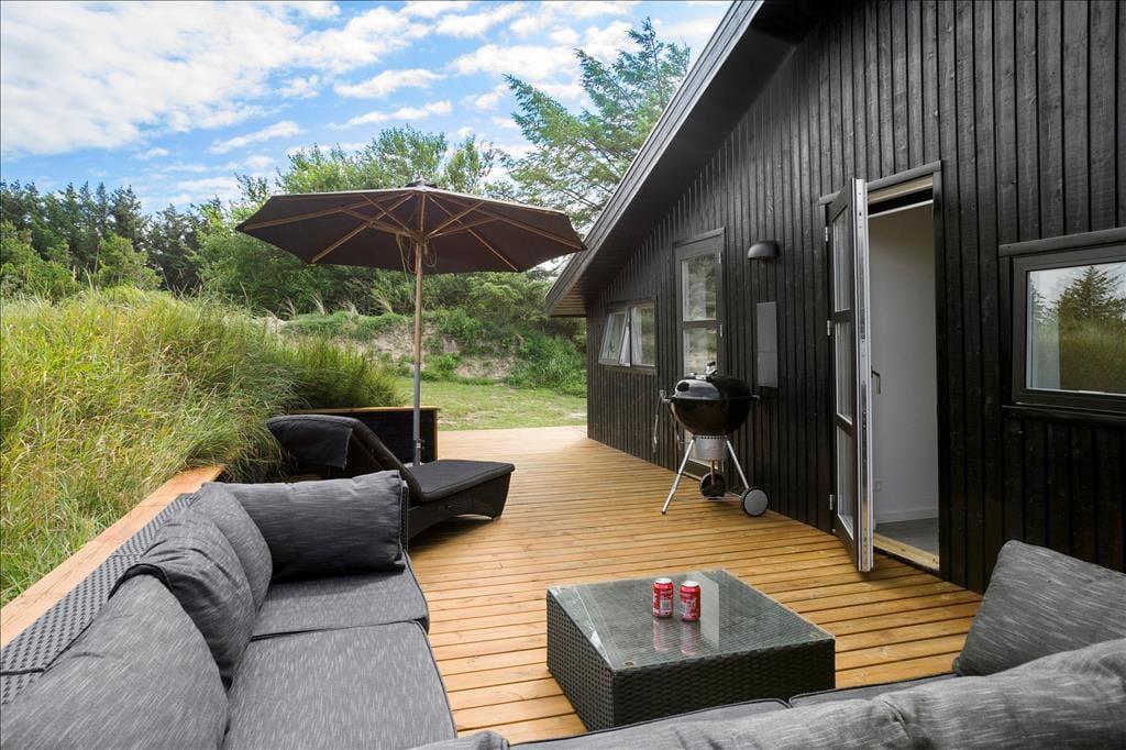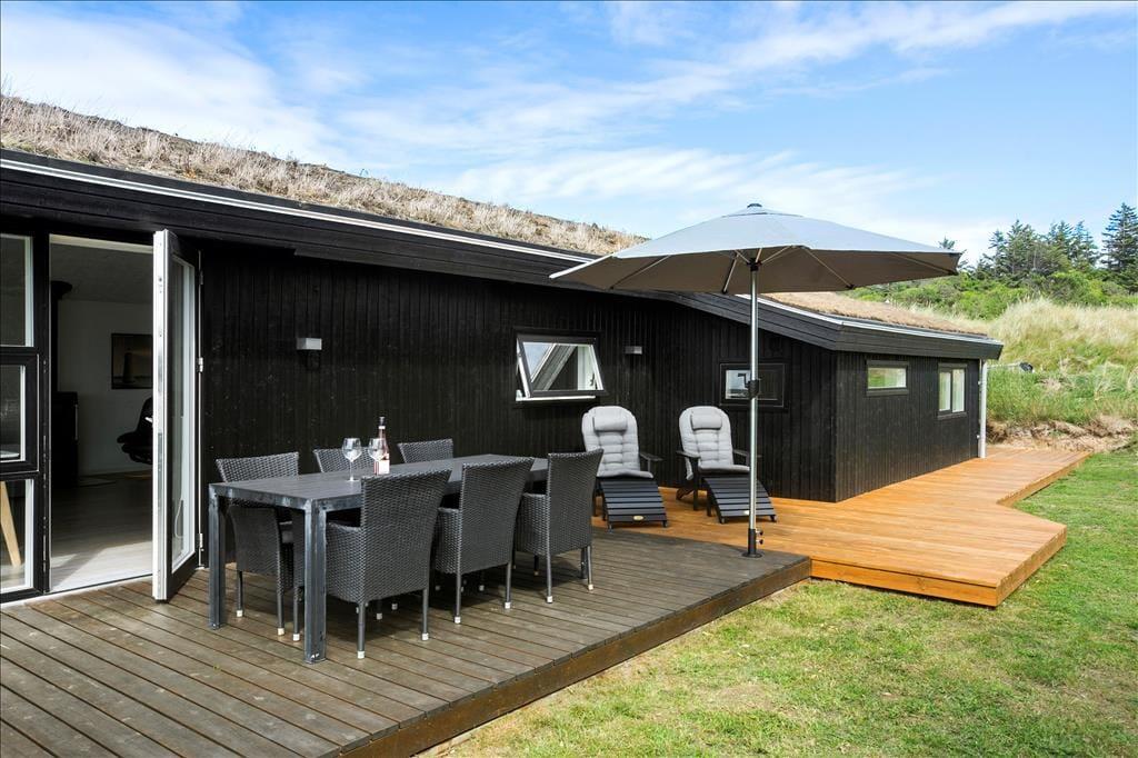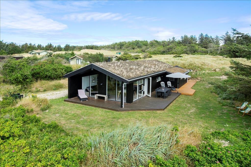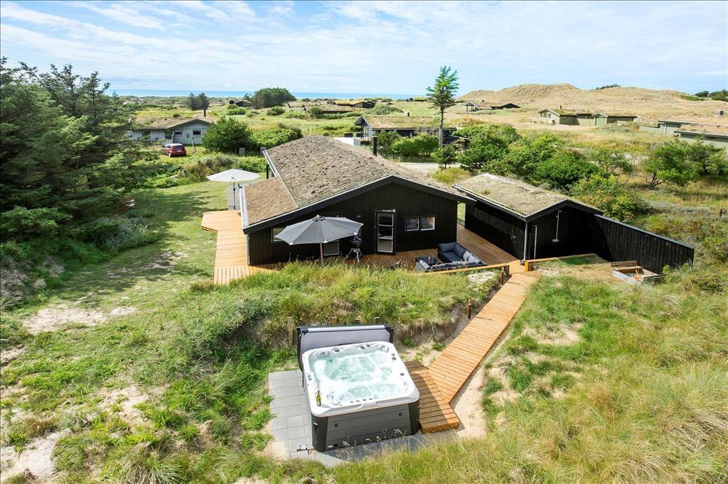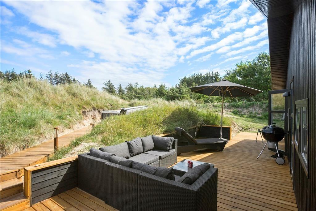 Sommerhuset ligger på en stor naturgrund med hyben, græs, marehalm og små træer. Klittoppene beskytter godt mod Vestenvinden og børnene kan nyde udendørslivet i sandkassen eller med lidt boldspil på græsset. Til huset hører tre terrasser, en overdækket for enden af huset, en åben på den ene langside og endelig en afskærmet del med hyggelig sofagruppe, hvor man kan slappe helt af i fred og ro. Til huset hører også en udendørs spa, hvor man kan sidde helt ugeneret og nyde den skønne natur, som er her ved Vesterhavet.