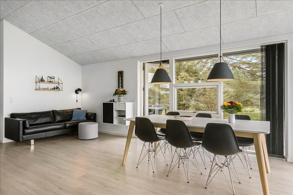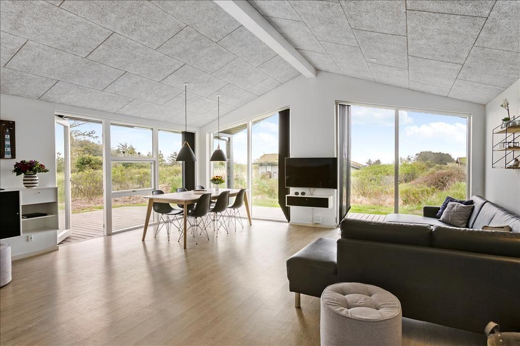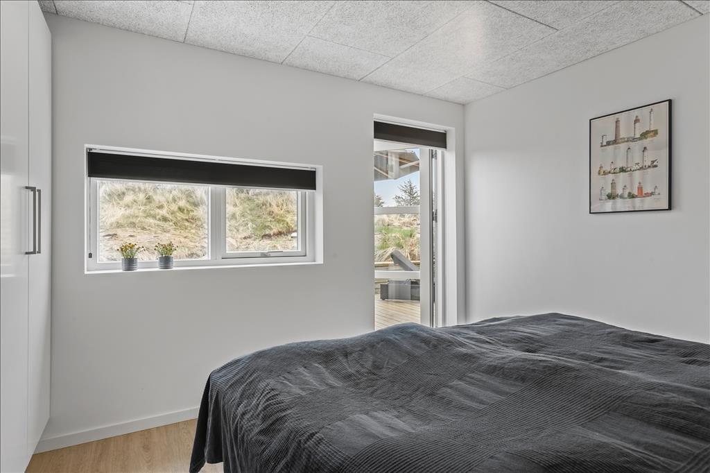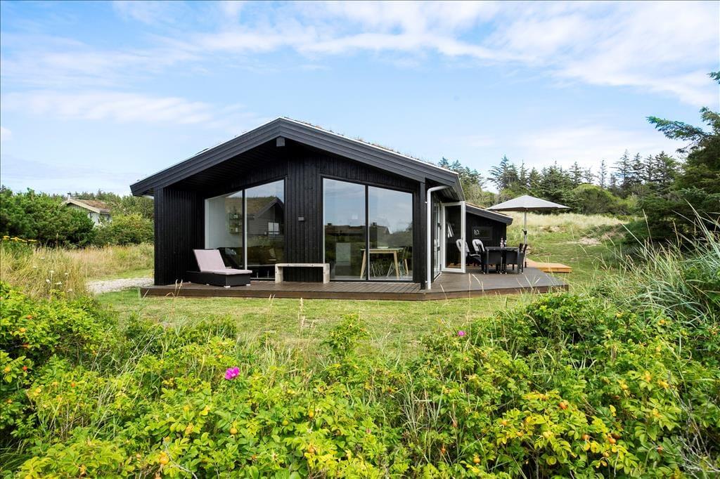 Sommerhuset er oprindeligt opført i 1975, og været igennem en større renovering i 2021, så det i dag fremstår i moderne og tiptop stand. Indretningen er holdt i en flot og afstemt skandinaviske stil med sort, grå og hvid som de dominerende farver. Alt inventar, møbler og senge er af høj kvalitet, og med moderne faciliteter som både vaskemaskine, opvaskemaskine og varmepumpe, bliver ferien ikke nemmere eller mere behagelig. Sommerhuset består af tre værelser, et badeværelse og et stort og åbent opholdsrum med køkken, spisebord og to sofaer. Her samles hele familien til hygge både morgen og aften, om vinteren er det oplagt at tænde op i brændeovnen, mens man om sommeren kan lukke op til terrassen og lade det nordjyske lys og den friske havduft strømme ind; i godt og klart vejr kan man se Vesterhavet, som blot ligger 850 meter væk. Bemærk hurtigt internet - 500/500 mbit fiber!