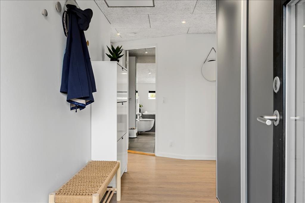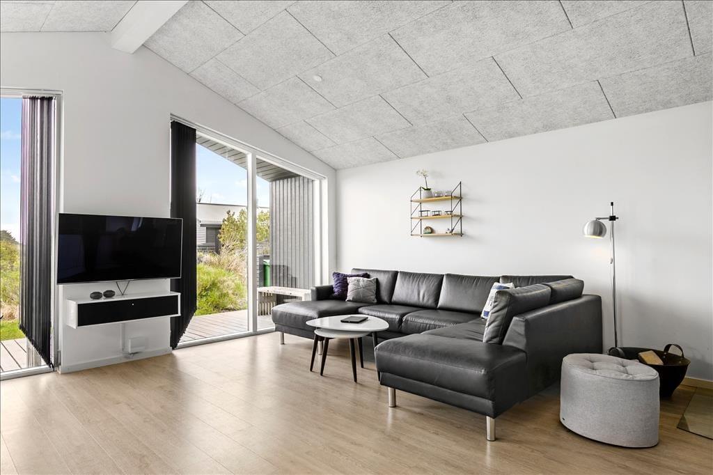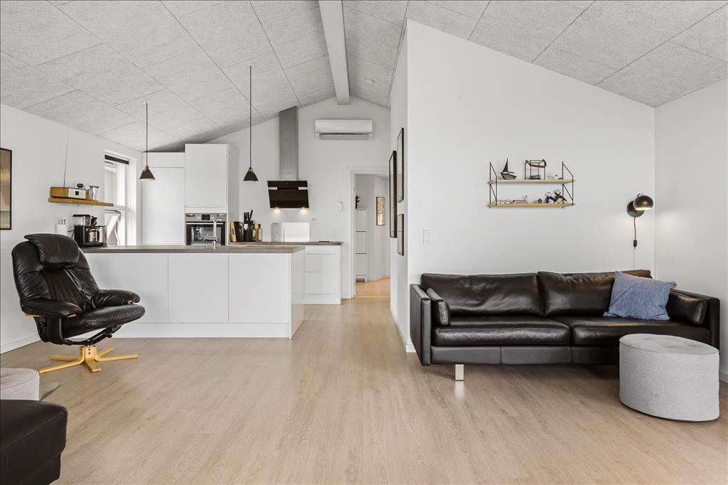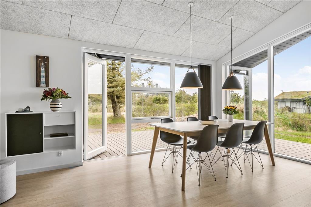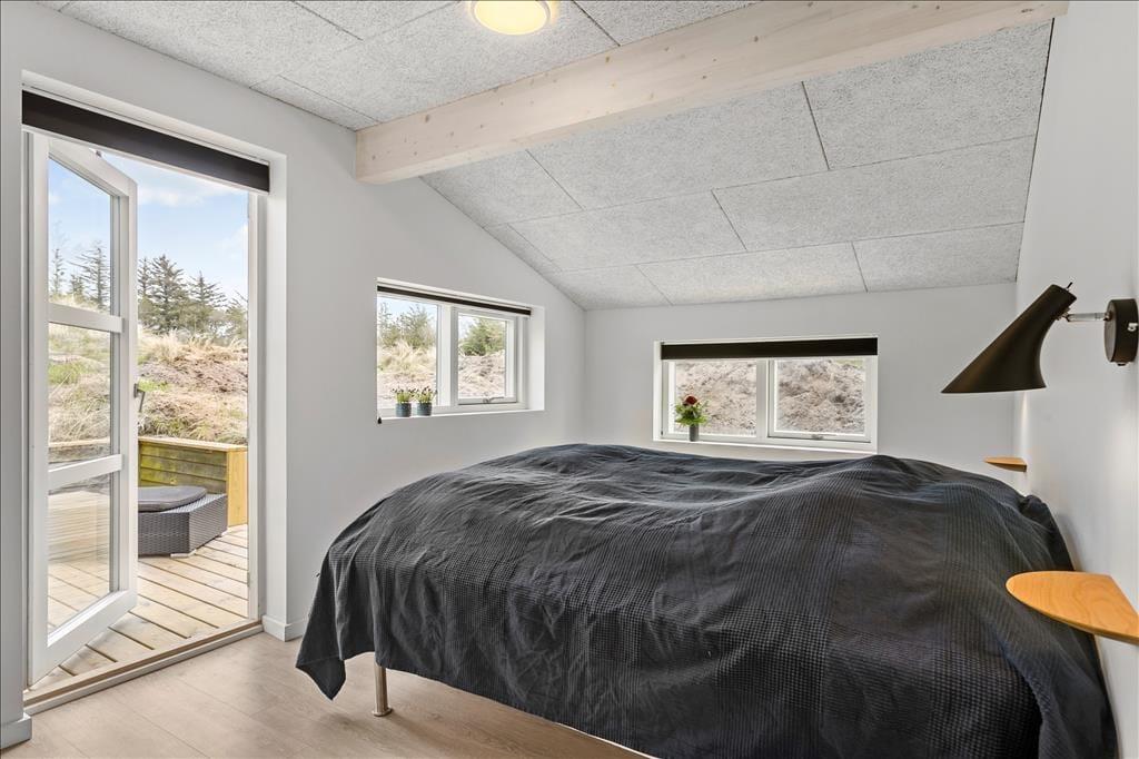 Sommerhuset er oprindeligt opført i 1975, og været igennem en større renovering i 2021, så det i dag fremstår i moderne og tiptop stand. Indretningen er holdt i en flot og afstemt skandinaviske stil med sort, grå og hvid som de dominerende farver. Alt inventar, møbler og senge er af høj kvalitet, og med moderne faciliteter som både vaskemaskine, opvaskemaskine og varmepumpe, bliver ferien ikke nemmere eller mere behagelig. Sommerhuset består af tre værelser, et badeværelse og et stort og åbent opholdsrum med køkken, spisebord og to sofaer. Her samles hele familien til hygge både morgen og aften, om vinteren er det oplagt at tænde op i brændeovnen, mens man om sommeren kan lukke op til terrassen og lade det nordjyske lys og den friske havduft strømme ind; i godt og klart vejr kan man se Vesterhavet, som blot ligger 850 meter væk. Bemærk hurtigt internet - 500/500 mbit fiber!