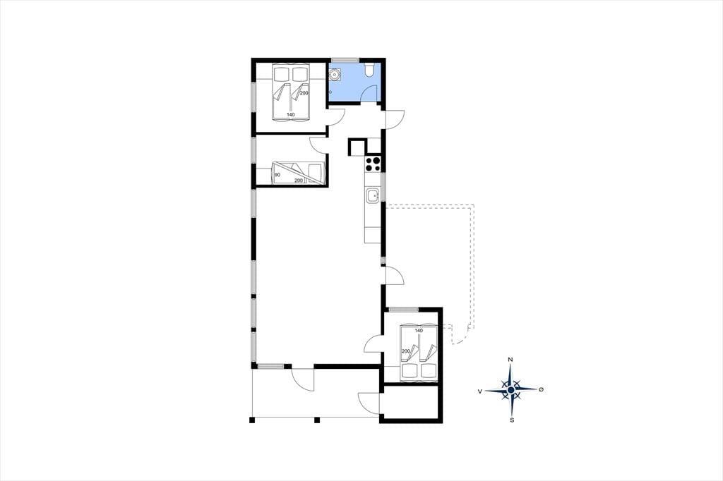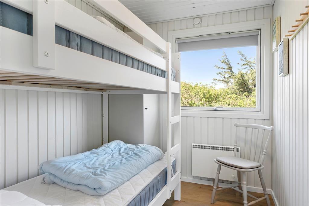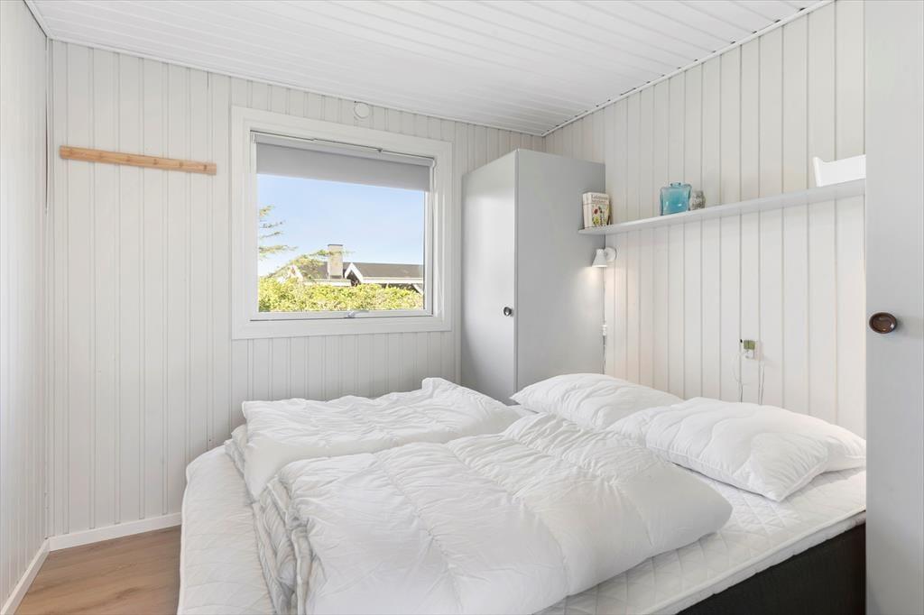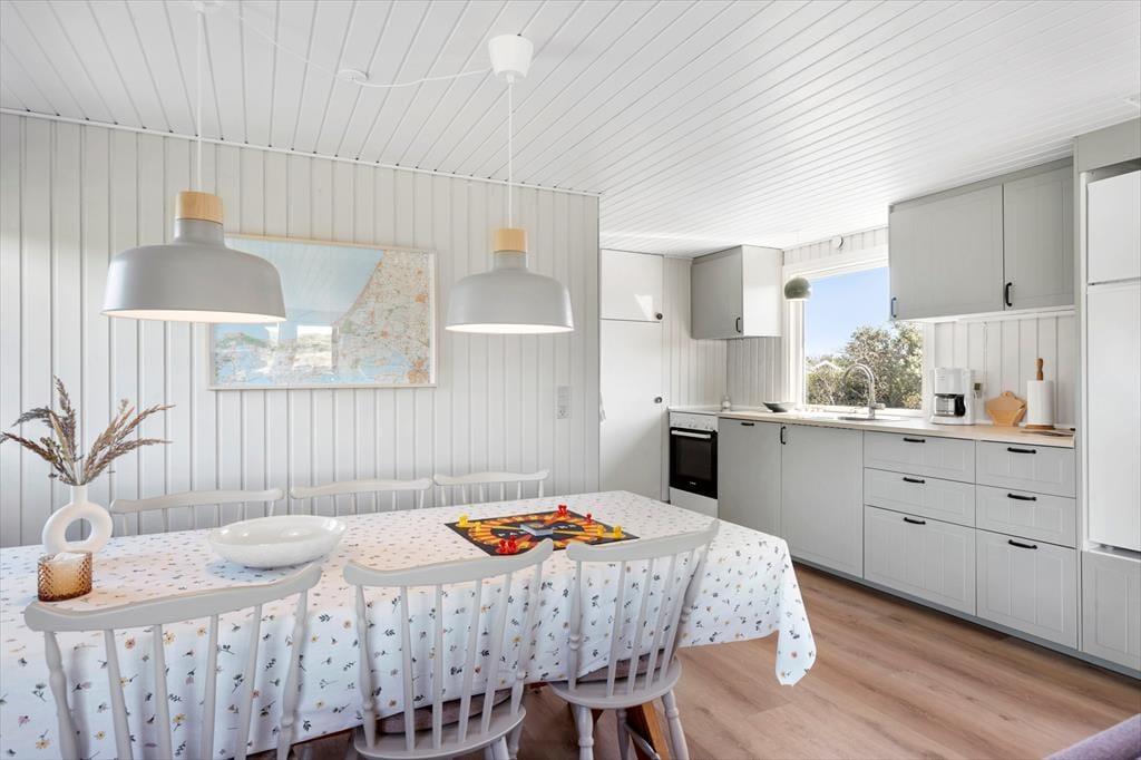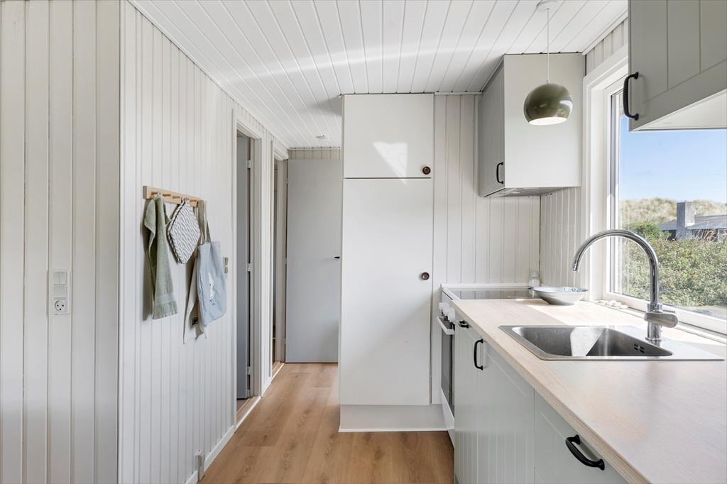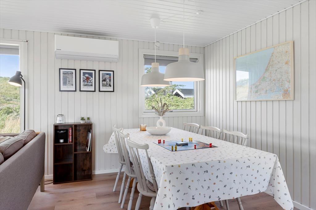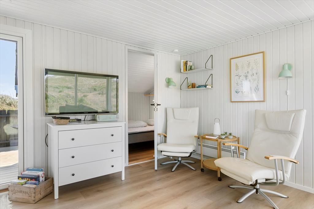 Efter moderniseringen fremstår huset lyst og indbydende overalt inden døre. Planløsningen passer godt til seks personer, for to af de de tre soveværelser er med dobbeltseng og det tredje med en køjeseng. Ved entréen ligger brusebadeværelset, mens køkkenet på velfungerende vis er integreret med stuen. Det betyder, at I sagtens kan være i gang med at lave lasagne eller skylle salat og samtidig have mulighed for at småsnakke med familien om jeres planer for de kommende dage. Efter måltidet er det måske tid til at spille brætspil ved spisebordet eller flade ud i sofaen, hvor I enten kan tænde for fladskærms-tv’et eller ’nøjes’ med at beundre klitlandskabet udenfor stuevinduerne.