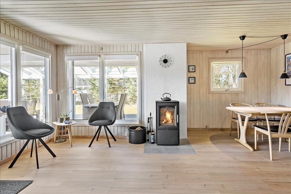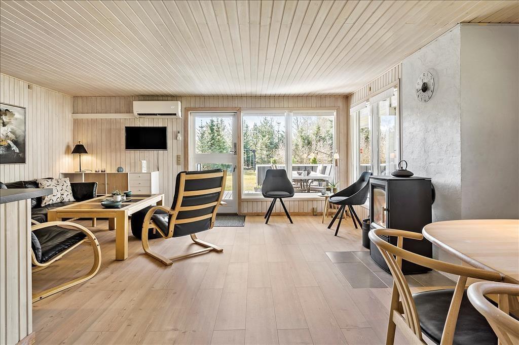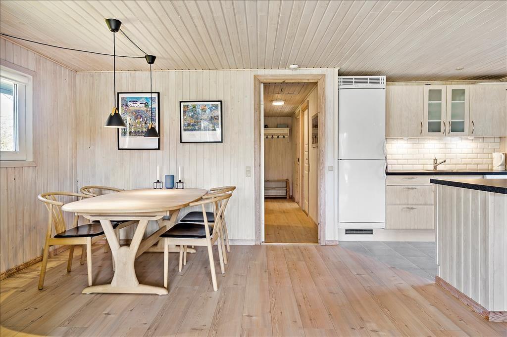 Sommerhuset er opført i 1985 og er i årenes løb blevet godt og grundigt vedligeholdt, så alt stadig i dag er i den skønneste orden. Huset består af fire soveværelser, et badeværelse og et åbent køkken-alrum med stue, hvor hele familien kan samles til måltiderne og hygge foran brændeovnen. De tre soveværelser har hhv. to dobbeltsenge, 2 enkeltsenge, så der er rig mulighed for at dele sig op efter behov, og har man mindre børn med, som skal puttes lidt tidligt, kan man med fordel lukke døren mellem gangen og stuen, så der er ro i begge lejre. Sommerhuset har opvaskemaskine, parabol med en del udenlandske og danske kanaler, og endelig kan man bruge det trådløse internet, hvis men medbringer pc eller tablets hjemmefra. Stuen har store vinduer, som lader det nordjyske lys trænge helt ind i rummet, og hele huset har en varm og hjemlig atmosfære, hvor alle hurtigt vil finde sig til rette. Skønne og velfungerende rammer for familier såvel som for par.