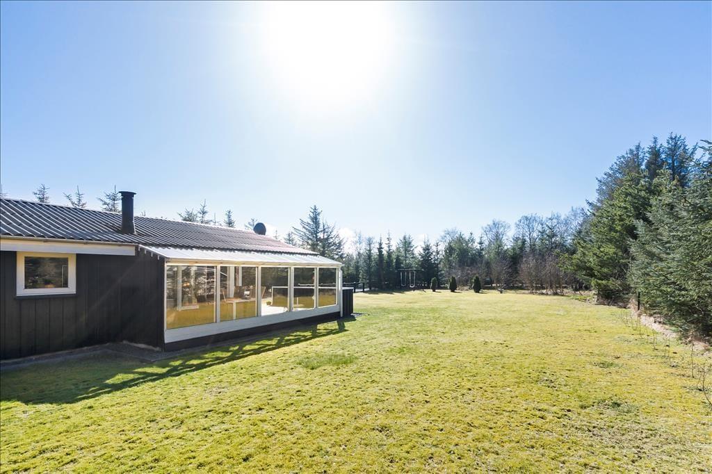 Sommerhuset ligger på en stor grund, godt beskyttet af høje og tætte træer og med en stor græsplæne med masser af plads til at lege tagfat og spille bold. Fra køkkenet er der udgang til en hyggelig terrasse med morgensol, mens man fra stuen kan gå ud på en stor og overdækket terrasse med god plads til at grille, spise og hygge sig om aftenen. Desuden er grunden lukket, så man kan trygt lade børn lege uden fare for at de stikker af på eventyr.