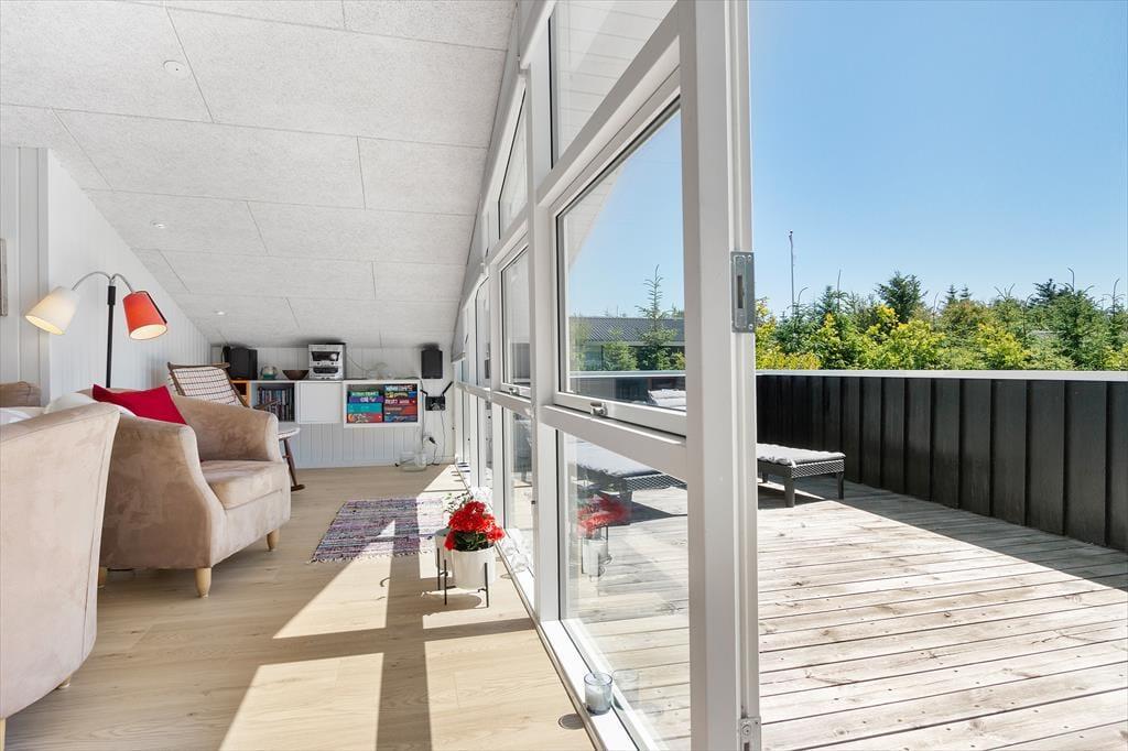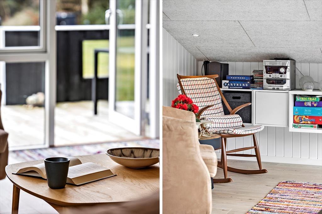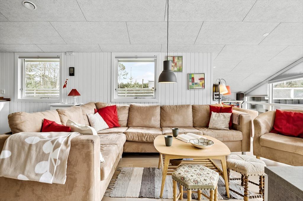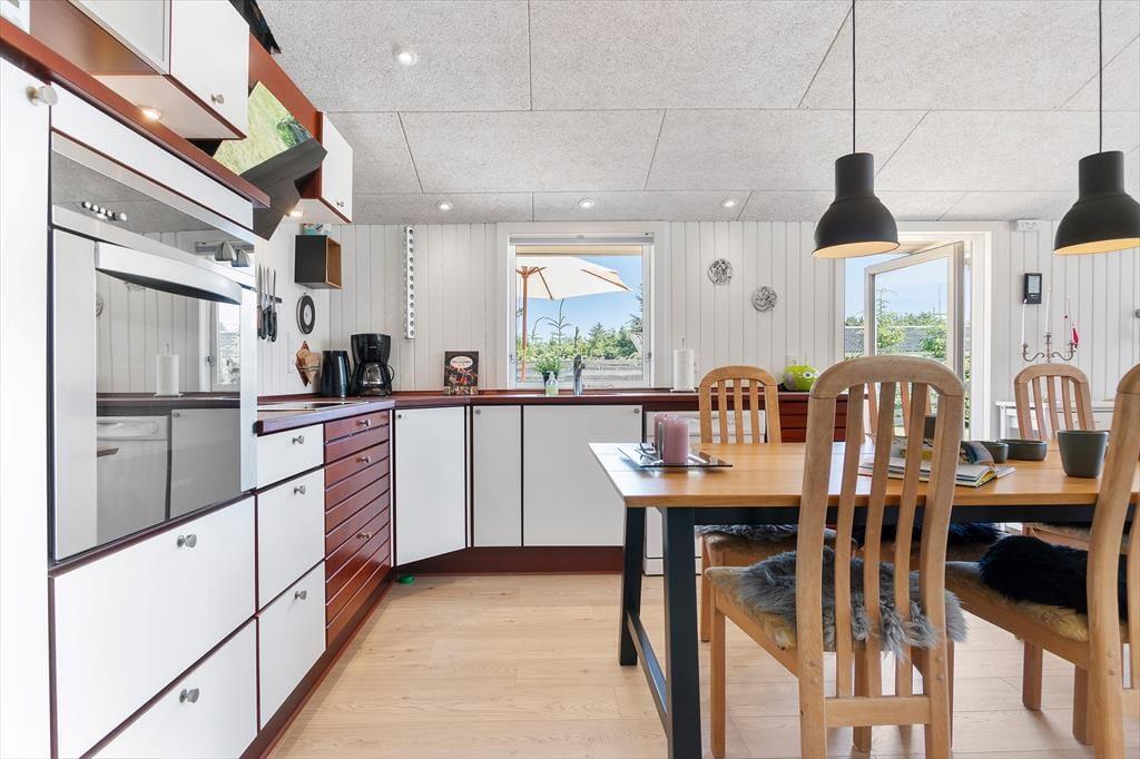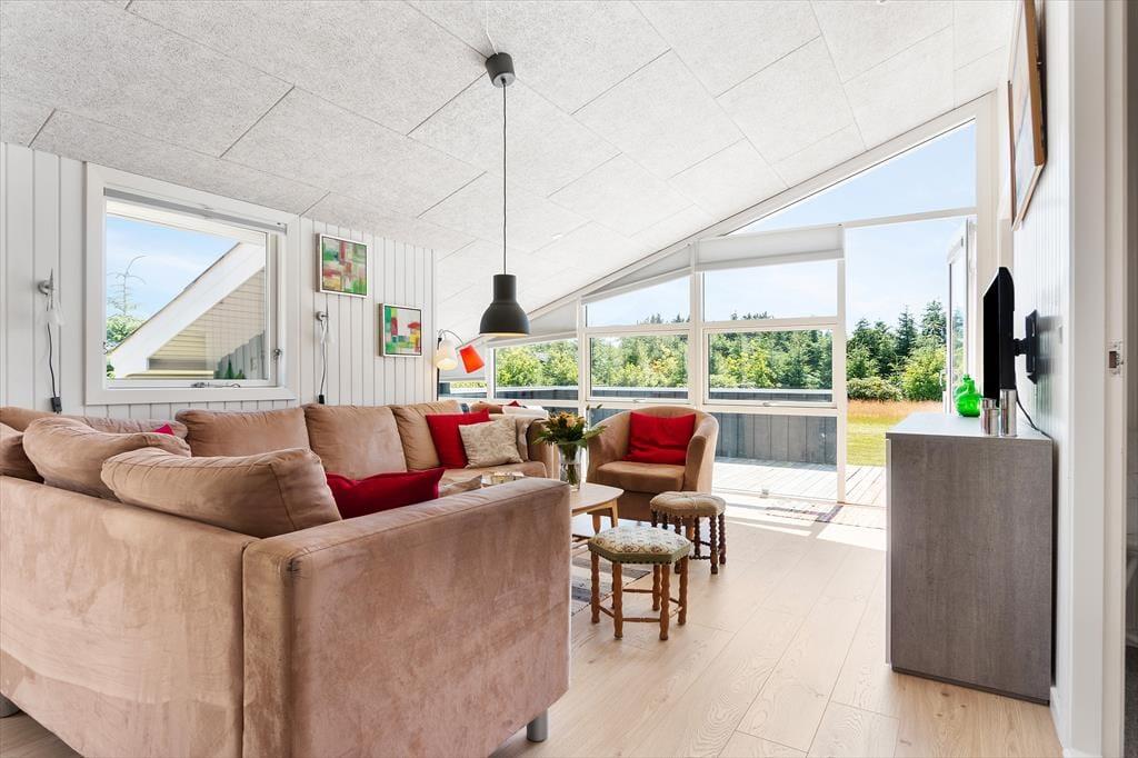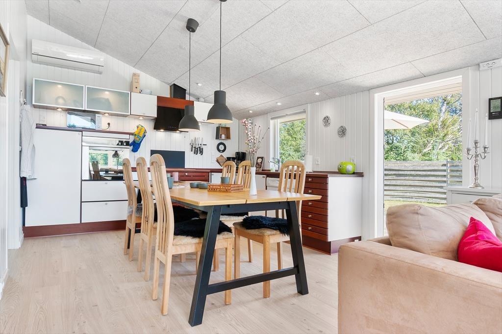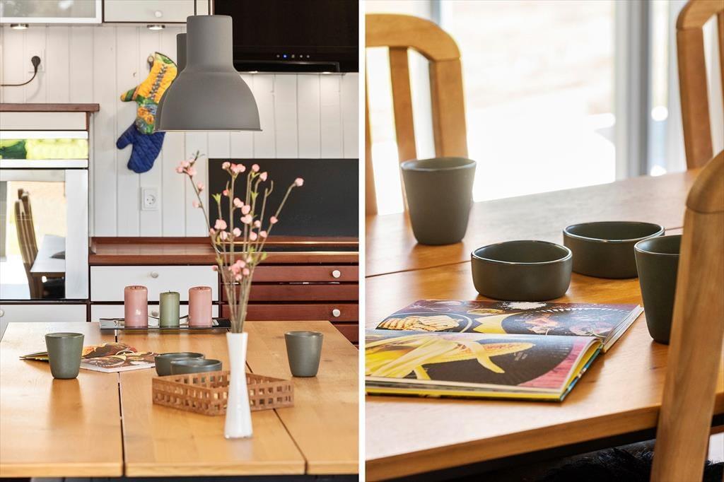 Indenfor mødes du af en lys og rummelig atmosfære, hvor de store vinduespartier mod syd lader solens stråler strømme ind og skaber en dejlig åbenhed. Opholdsrummet er husets hjerte med plads til både afslapning og samvær. Her kan du nyde hyggelige aftener foran brændeovnen, læse en god bog eller samles om spisebordet til fælles måltider. Køkkenet er veludstyret og åbent, så madlavningen bliver en social aktivitet, hvor familien kan være sammen om at tilberede dagens måltider. De lyse farvetoner og det stilfulde møblement skaber en indbydende ramme om feriedagene.