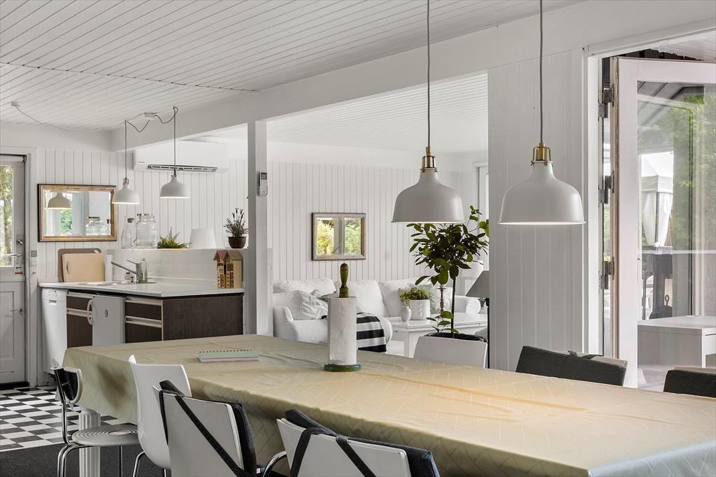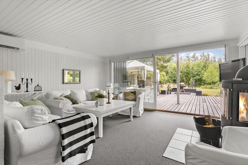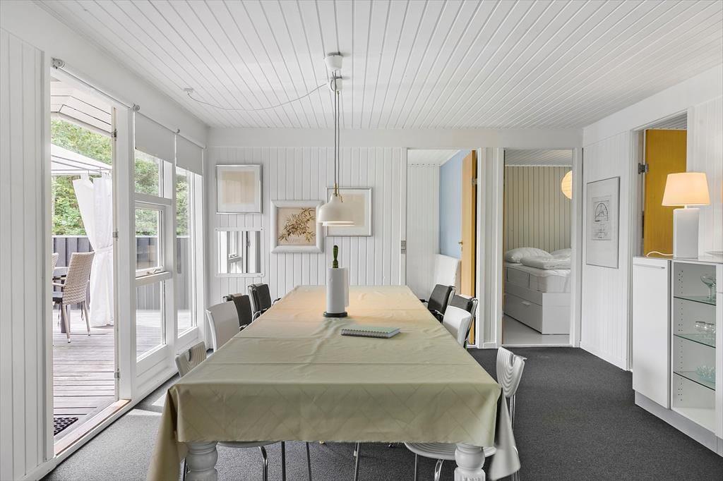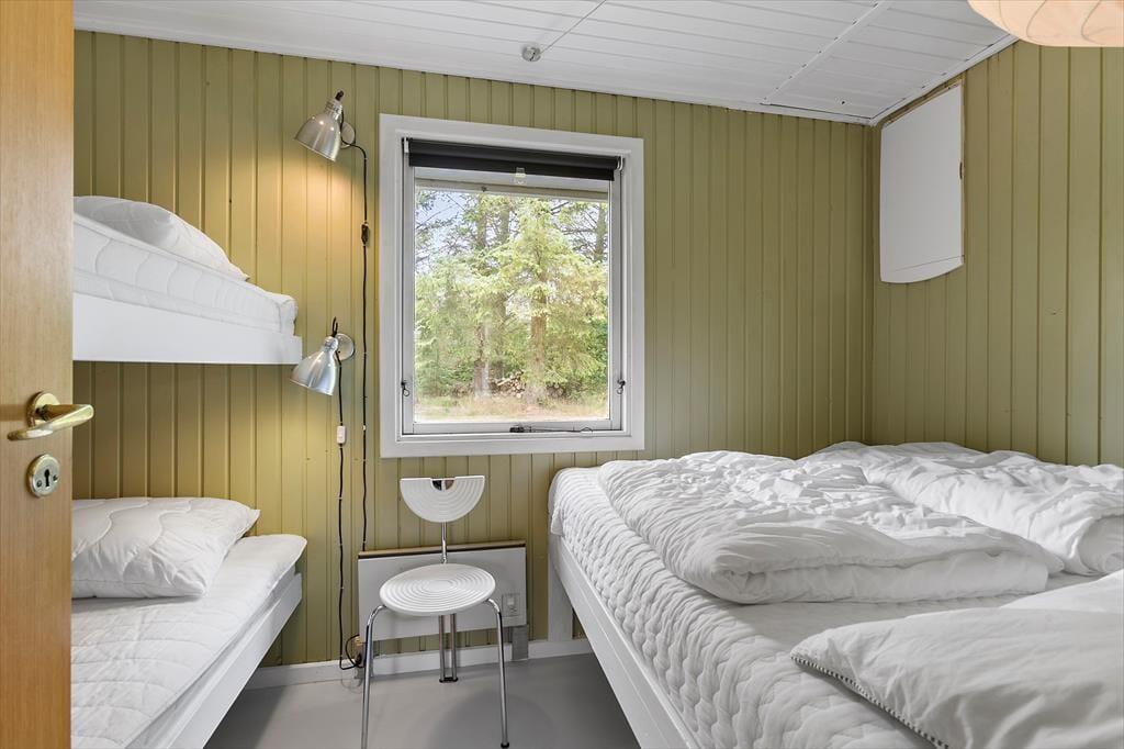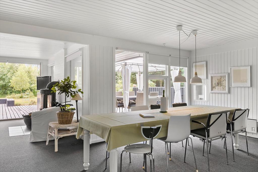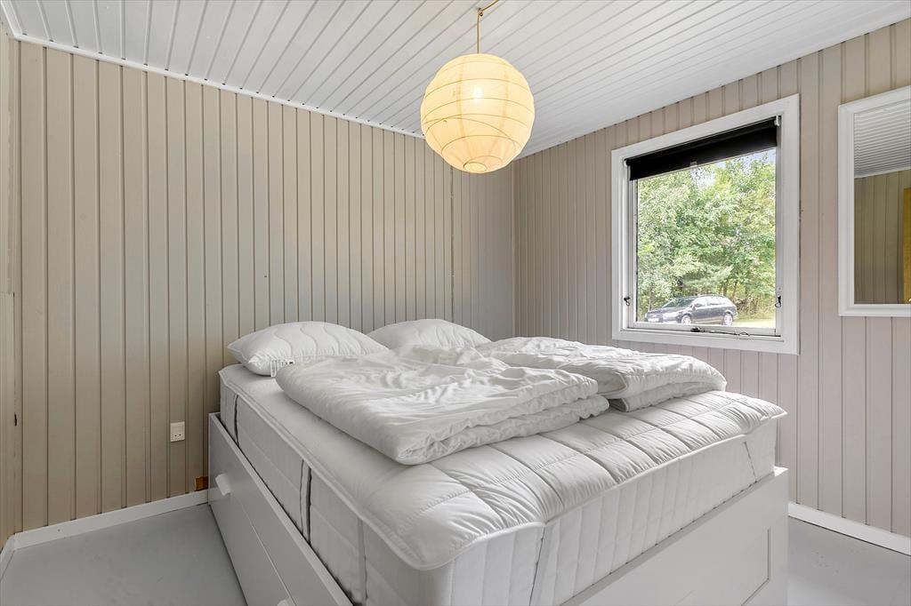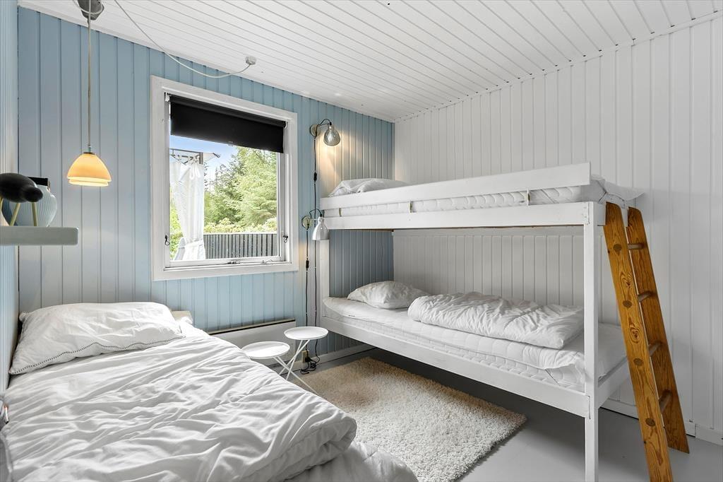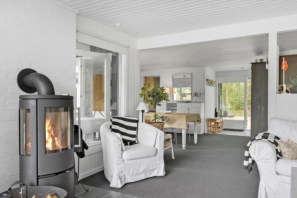 Et lyst og indbydende sommerhus med en dejlig afslappende atmosfære. Her kan hele familien komme ned i gear og nyde ferien. Sommerhuset består af tre værelser, et med dobbeltseng, et med køjer, og et med køjer og enkeltseng. Det store opholdsrum er hyggeligt indrettet med hvidmalede vægge og lyse møbler. Er vejret ikke til at sidde på terrassen om aftenen, er det dejligt at tænde op i brændeovnen og hygge sig med varmen og lyden af det knitrende træ. Badeværelse med bruser. Huset har alt i hårde hvidevarer som opvaskemaskine, vaskemaskine og tørretumbler. Og naturligvis frit internet, så tag endelig PC eller tablet med på ferien. Så kan man holde sig orienteret om de mange muligheder i området. De 4 benene familiemedlemmer er også velkomne, så leder man efter et klassisk sommerhus med høj grad af hygge og god stemning så er man kommet til det helt rigtige sted.