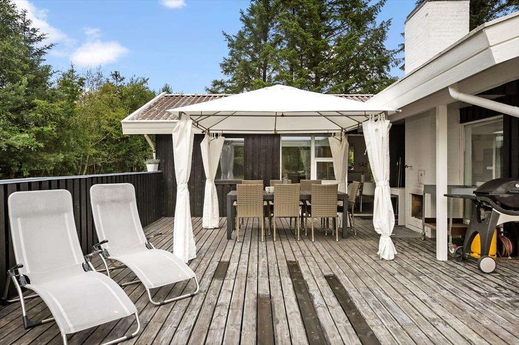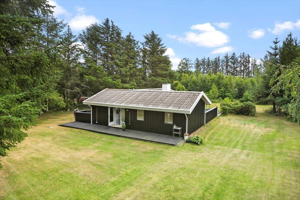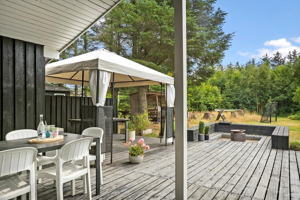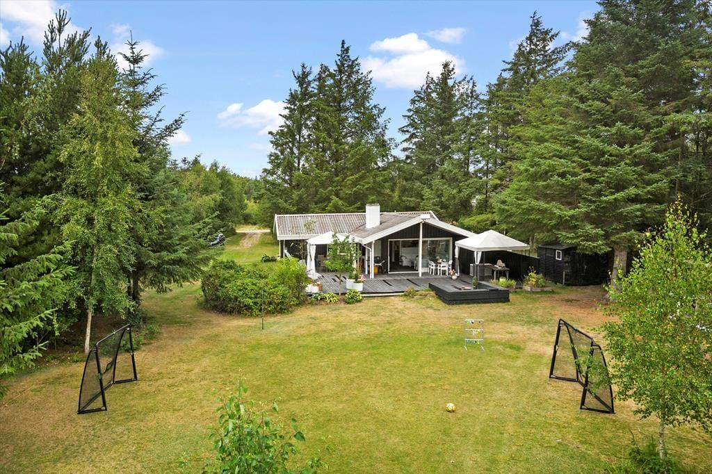 Sommerhuset ligger på stor naturgrund hvor der er alle muligheder for udeliv. Der er god plads til at lege og løbe rundt på den store græsplæne. Der er gynge og sandkasse til de mindste. Grunden er omgivet af høje træer, så det altid er muligt at finde en plads i solen eller en lækrog. Der er en lille bålplads, hvor man kan samles efter en lang oplevelsesrig dag med snobrødsbagning, eller bare sidde og nyde de lange lyse aftener og høre fuglene synge i trætoppene. Havemøbler, og grill er naturligvis til rådighed. Der er flere terrasser ved huset, hvor naturligvis skal fremhæves den store terrasse hvor man kan sidde i fred og ro og nyde udsigten over den store grund og det omkringliggende landskab.