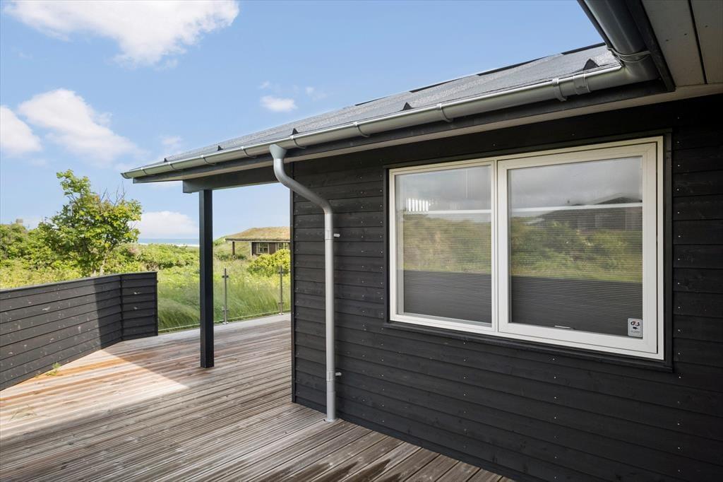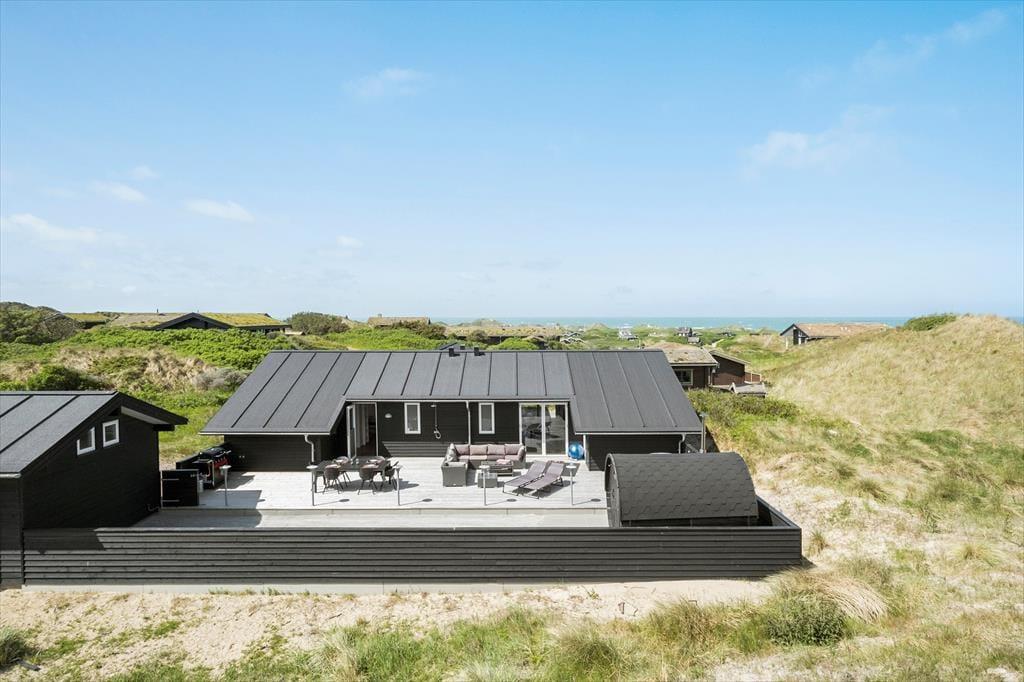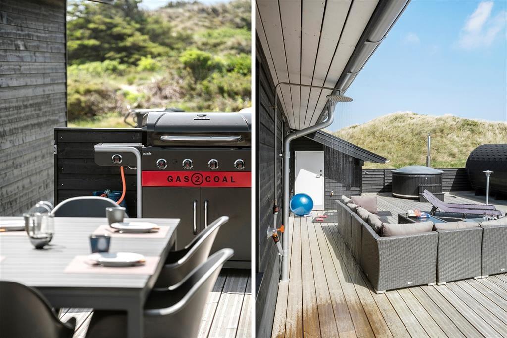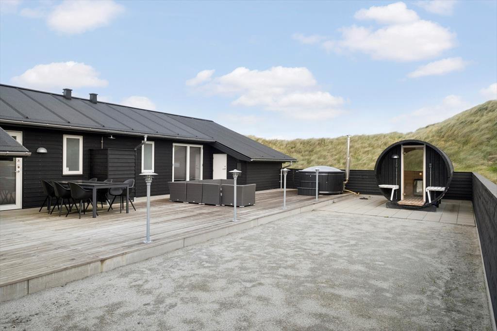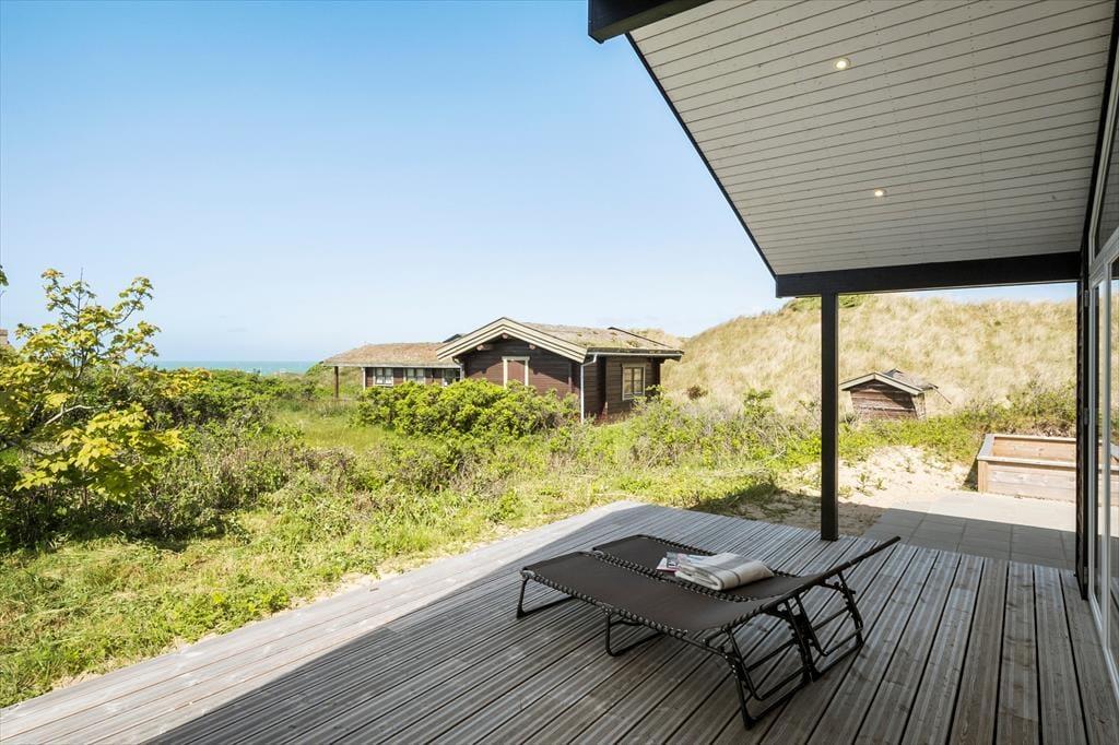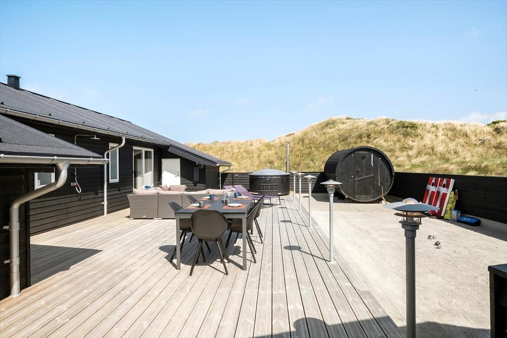 Vest for sommerhuset venter en delvist overdækket træterrasse, hvor I kan nyde driverlivet med udsigt til Vesterhavet, klitterne og duftende hybenbuske. Blandt andet ved solnedgangstid er det skønt at sidde her, men ellers får terrassen skarp konkurrence af det aflukkede opholdsmiljø, der breder sig mod øst. Udover loungemøbler, havebord og liggestole står der et vildmarksbad klar, og der er også en 11x4 meter petanquebane, så I kan hygge jer med at dyste og perfektionere jeres kast.
