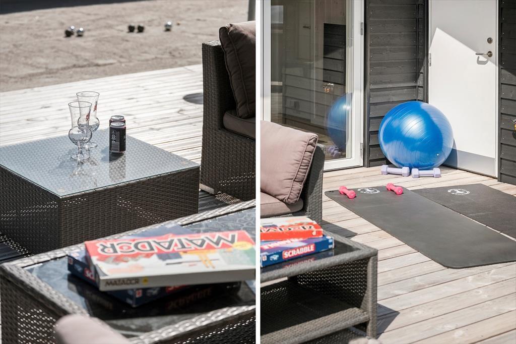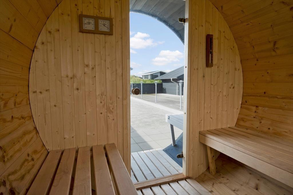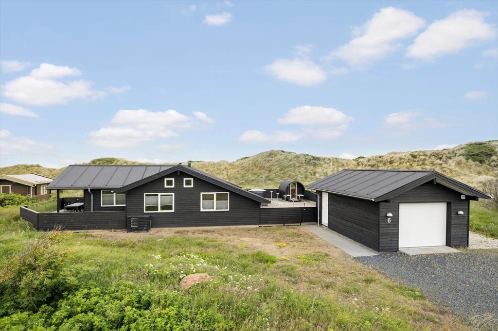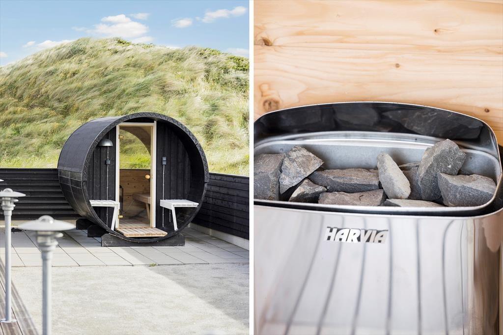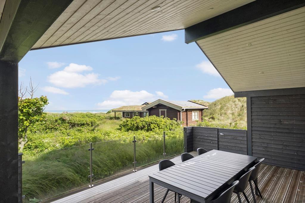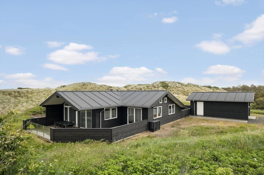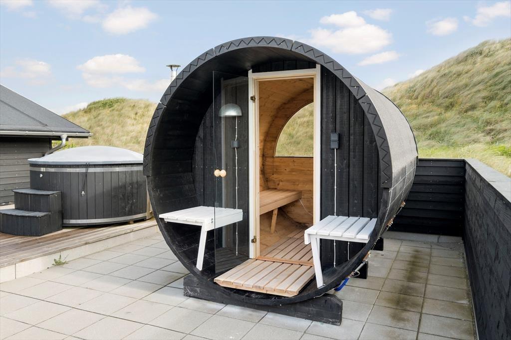 Vest for sommerhuset venter en delvist overdækket træterrasse, hvor I kan nyde driverlivet med udsigt til Vesterhavet, klitterne og duftende hybenbuske. Blandt andet ved solnedgangstid er det skønt at sidde her, men ellers får terrassen skarp konkurrence af det aflukkede opholdsmiljø, der breder sig mod øst. Udover loungemøbler, havebord og liggestole står der et vildmarksbad klar, og der er også en 11x4 meter petanquebane, så I kan hygge jer med at dyste og perfektionere jeres kast.