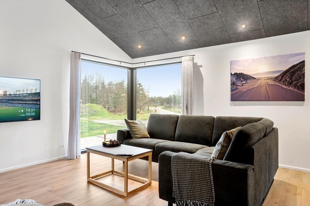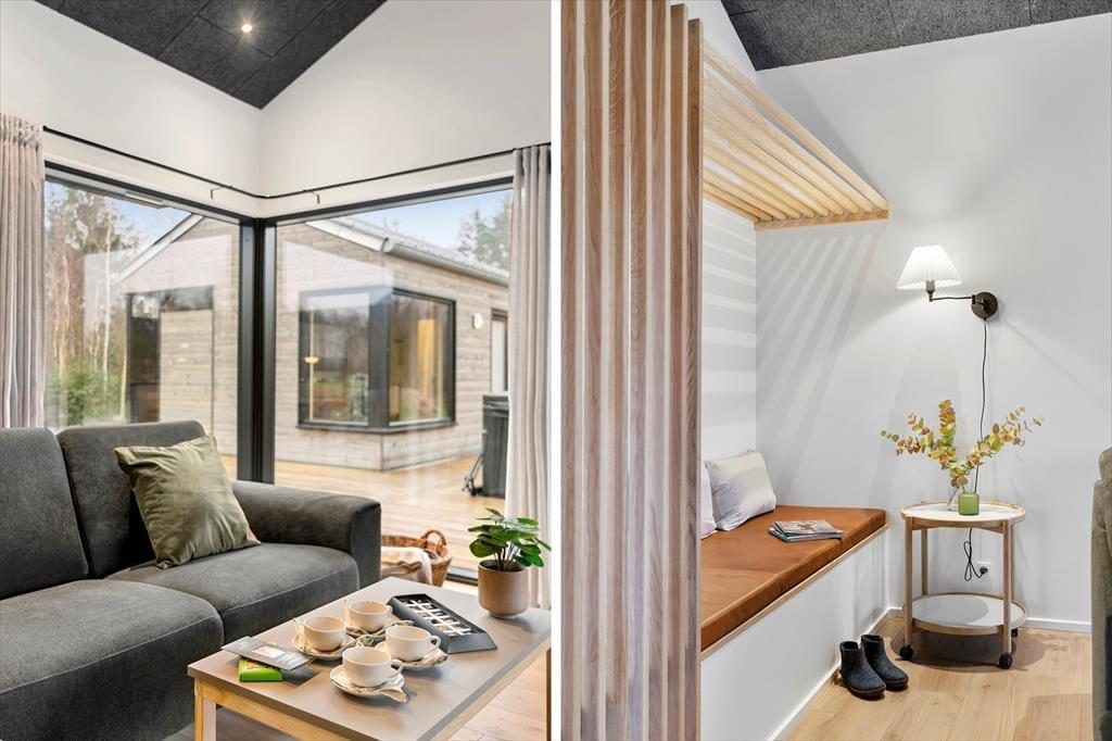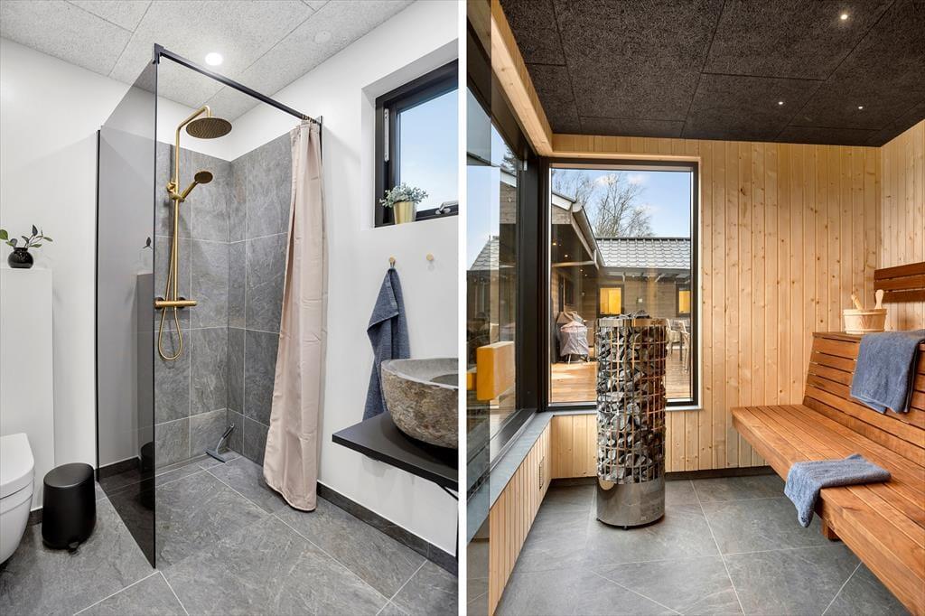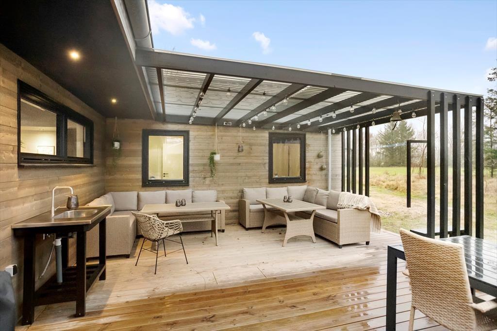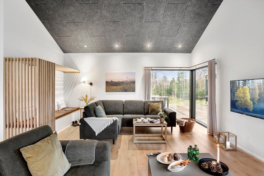 Sommerhusets terrassemiljø er stort og solrigt, og der er mange gode opholdspladser og lækroge at vælge imellem – blandt andet venter der en overdækket terrasse med loungemøbler, der indbyder til mange herlige stunder på de lyse sommeraftener. Terrassens udespa og den tilhørende sauna med panoramavindue er med til at forsøde det udendørs driverliv, og på naturgrunden kan I sågar finde jeres indre spejdere frem og hygge jer ved bålpladsen og i shelteret. Hvis I er mange samlet, er det for øvrigt rart at have god plads til parkering, og der er sågar lader til elbil, hvis du er indehaver af sådan en.