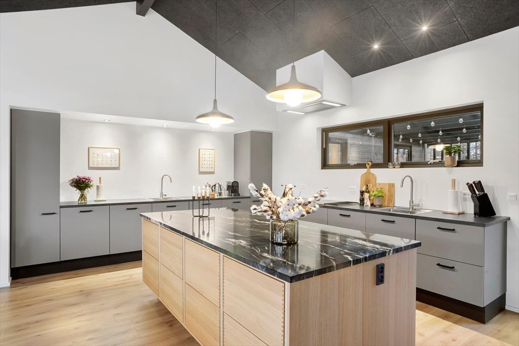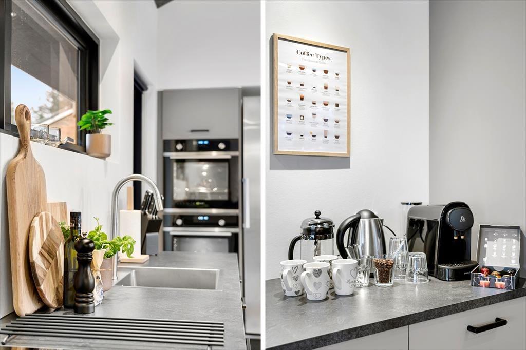 I alt er der plads til 16 voksne og 4 børn i huset, så uanset om du vil fejre din næste runde fødselsdag eller bare vil hygge dig med dine kære, er huset perfekt til formålet. Huset stod færdigt i 2024, og rummene er indrettet med design fra øverste hylde – det kan for eksempel ses i det store kvalitetskøkken, hvor I kan nyde at stå ved den flotte køkkenø og endda har stationer til både cocktails og kaffe. Når I skal lave mad til mange, er det skønt at have to køleskabe, to ovne og to opvaskemaskiner, så I kommer virkelig ikke til at mangle noget. Det gør I heller ikke på de fire badeværelser og otte soveværelser, og selv hemsen er et hit, for den er særdeles stor, så både børn og voksne kan sove komfortabelt heroppe. Den højloftede stue og det store aktivitetsrum er for øvrigt begge herlige steder at hænge ud.