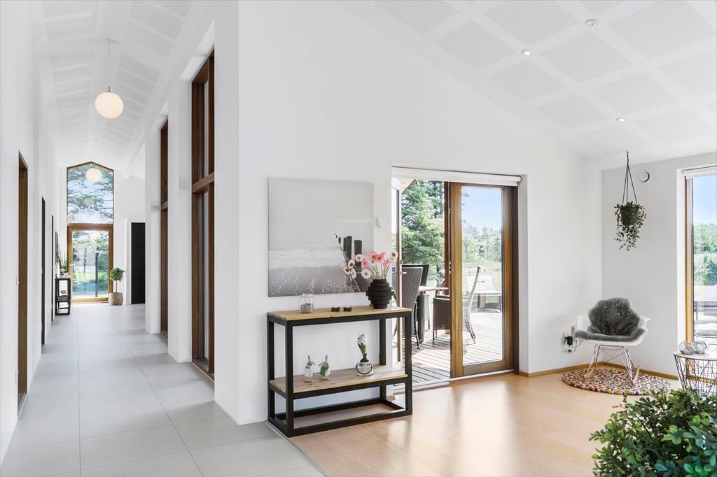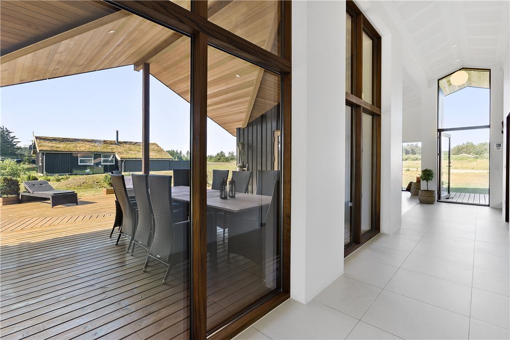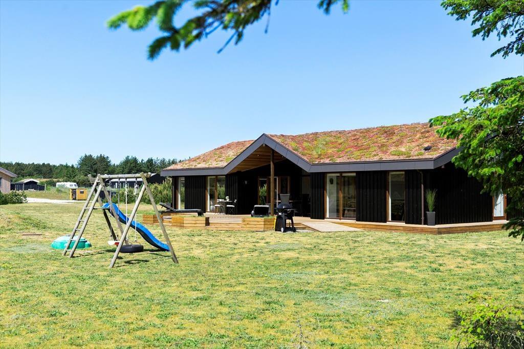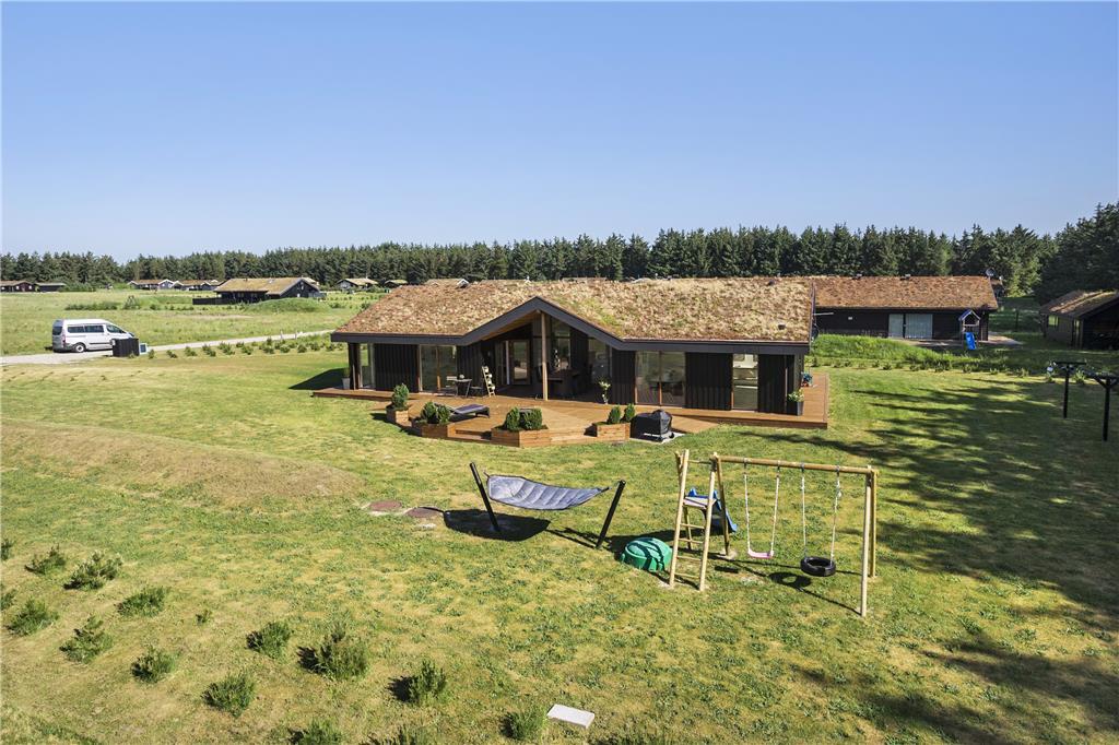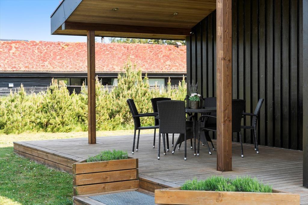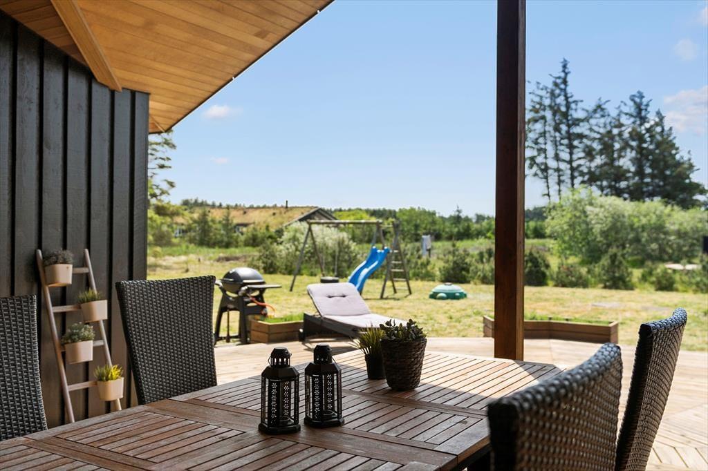 Huset ligger på en fantastisk grund med god plads til at lege og løbe rundt på den store græsplæne. Der er både gynge, sandkasse og legetårn til rådighed for sommerhusets mindste gæster. Fra både stuen og spisestuen er der adgang til den store terrasse, hvoraf en del er overdækket. Her kan man virkelig nyde dagens første kop kaffe i morgensolen. Eller nyde de lange lyse sommeraftenener med grillmad og et godt glas vin mens man nyder aftensolen. Liggestole, grill og havemøbler er naturligvis til rådighed. På den anden side af huset forefindes ligeledes en overdækket terrasse. Grunden er omgivet af høje træer på den ene side. Så leder man efter et sommerhus af høj klasse der oser af hygge, og god stemning er man kommet til det helt rette sted.