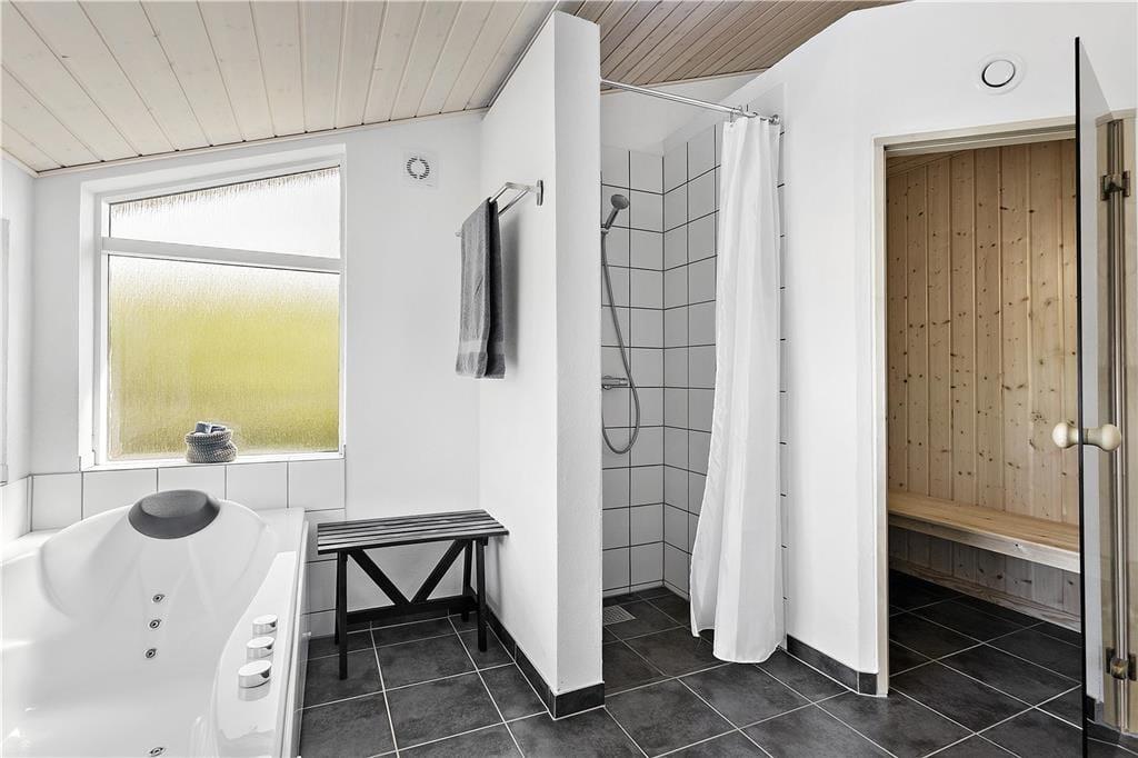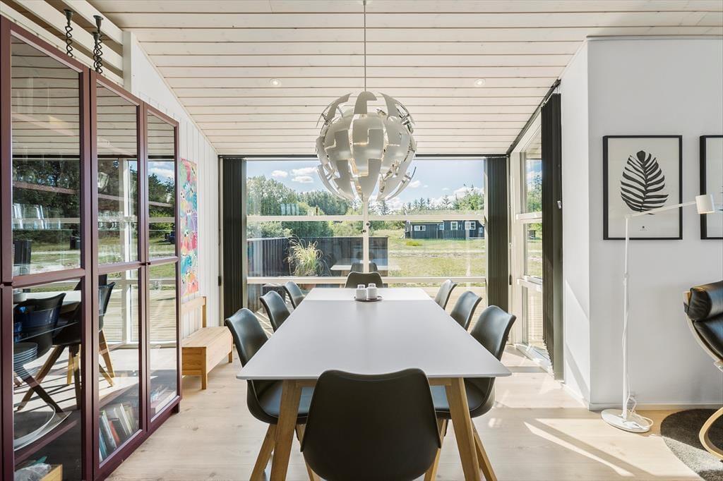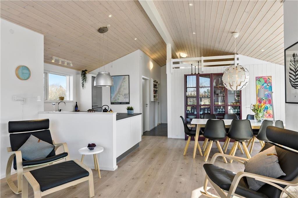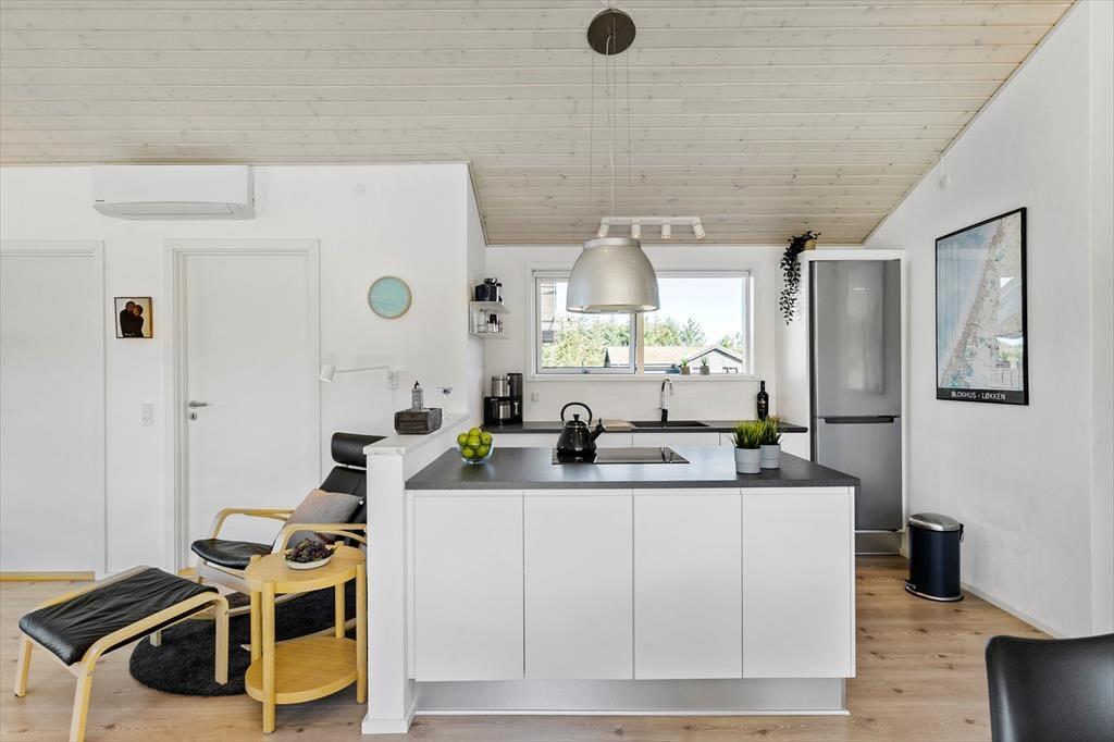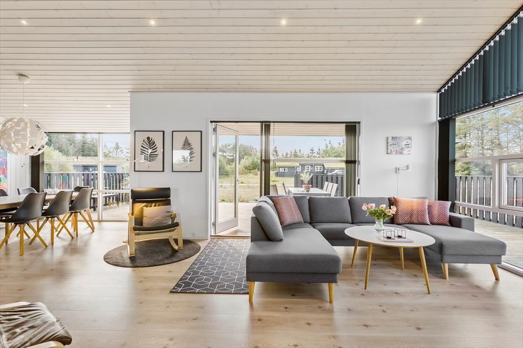 Overalt i huset oser det af behagelig komfort og god stil. Stuen er ud i et med køkkenet, og her er der alt i moderne bekvemmeligheder og hårde hvidevarer. I stuen er der store vinduespartier og loft til kip. Dette lader masser af det skønne nordjyske lys ind. Fra stuen er der ligeledes udgang til den ene af husets dejlige terrasser. Der er entre så man har mulighed for at hænge sit overtøj og stille skoene fra sig efter oplevelsesture inden man går ind i huset. Derudover er der fordelingsgang hvor der er adgang til husets dejlige badeværelse, der ligesom resten af huset er indrettet i smagfuld stil med sans for detaljer og komfort. Her er der både spabad og sauna. Så der er rig mulighed for at slappe af efter en oplevelsesrig dag, og nyde varmen i saunaen eller slappe af i spabadet. Fra fordelingsgangen er der ligeledes adgang til de 2 af husets soverum med gode komfortable senge. Fra stuen er der adgang til husets tredje soverum ligeledes med god komfortabel dobbeltseng. Et virkeligt skønt sommerhus til en vellykket ferie for hele familien eller par der ønsker at tilbringe ferien sammen. Et perfekt valg på alle tider af året.