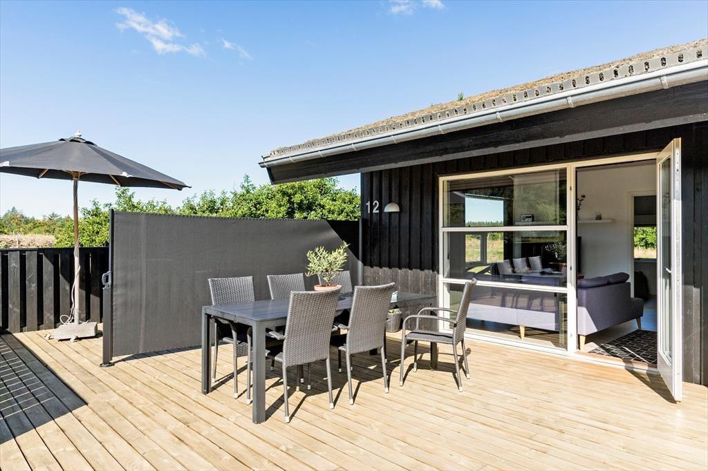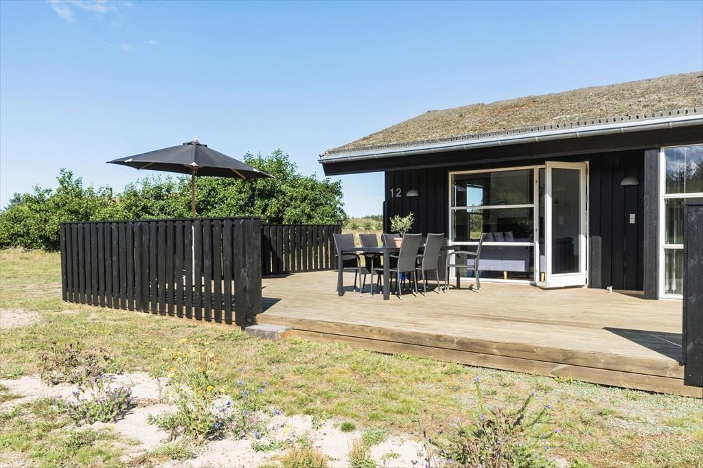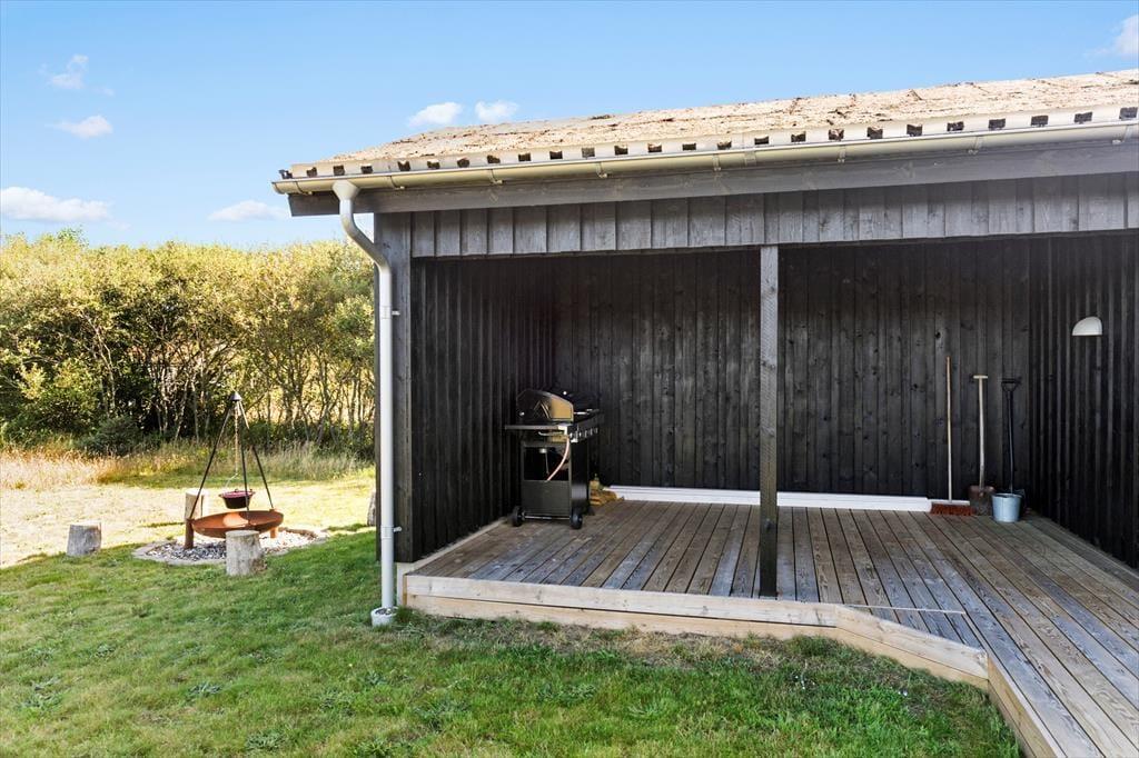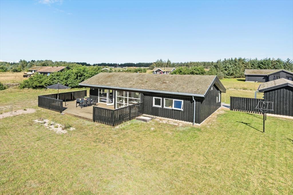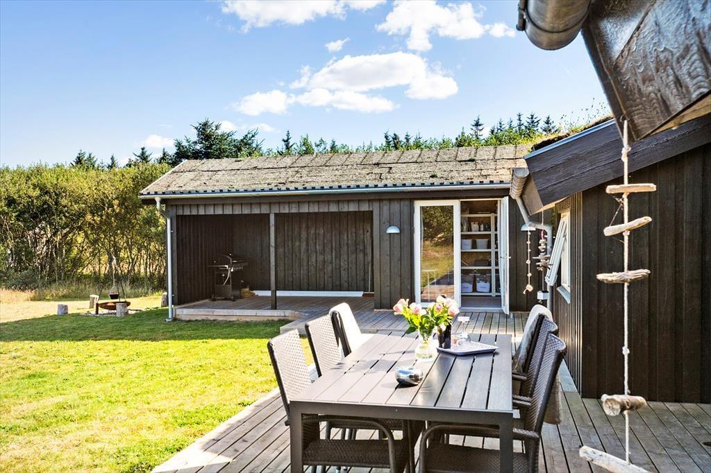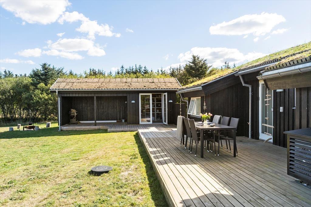 Huset er beliggende på dejlig åben naturgrund hvor der er masser af plads og højt til himlen. Der er dejlige træterrasser på de tre af husets sider. Så man kan sidde om morgenen med en kop kaffe, eller nyde de lange lune sommeraftener med et glas vin og grillmad. Havemøbler, grill, parasol og liggestole er naturligvis til rådighed. På den store plæne er der rig mulighed for leg og boldspil. Her kan børn og barnlige sjæle boltre sig.