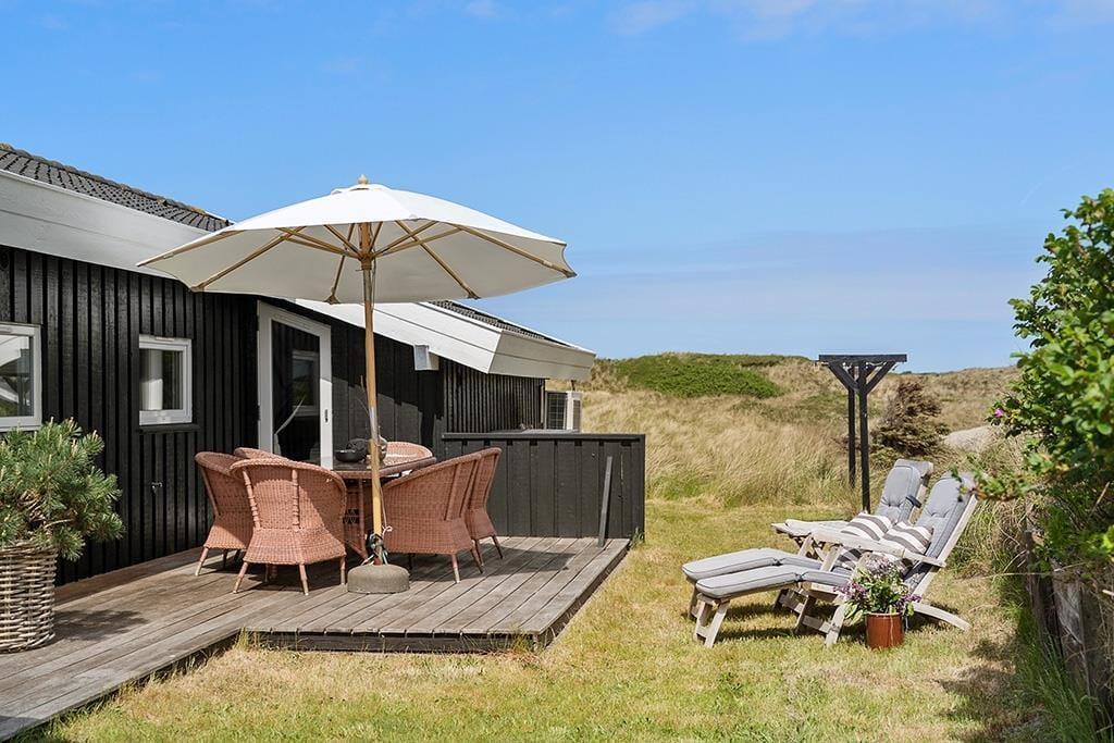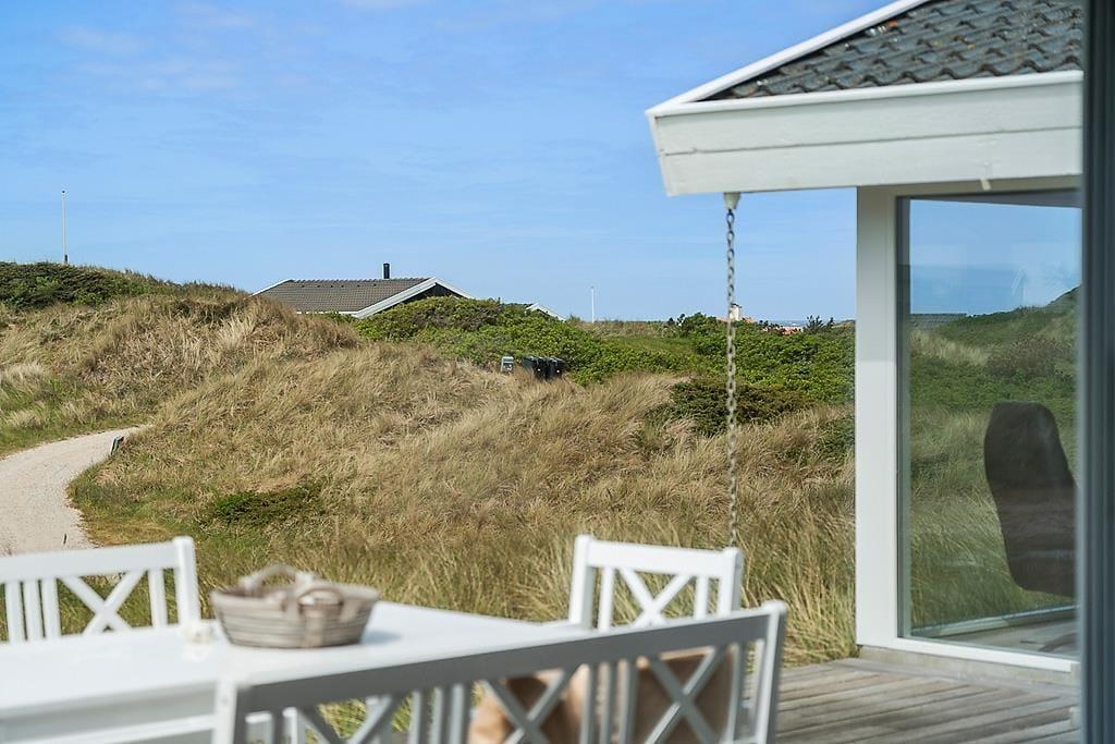 De udendørs omgivelser er også fortrinlige. Foran sommerhuset ligger en stor, vestvendt terrasse, hvorfra I kan nyde synet af bløde klitter og bølgende marehalm – og måske ligefrem se havet i horisonten. Kommer vinden fra vest kan I sætte jer om på den østvendte terrasse, som er endnu en dejlig opholdsplads med gode havemøbler og liggestole.