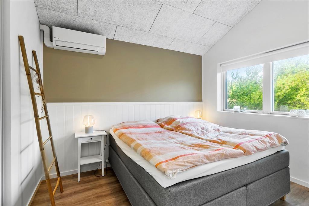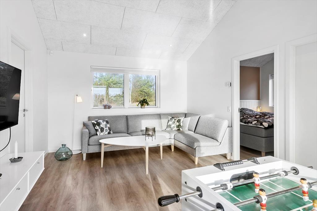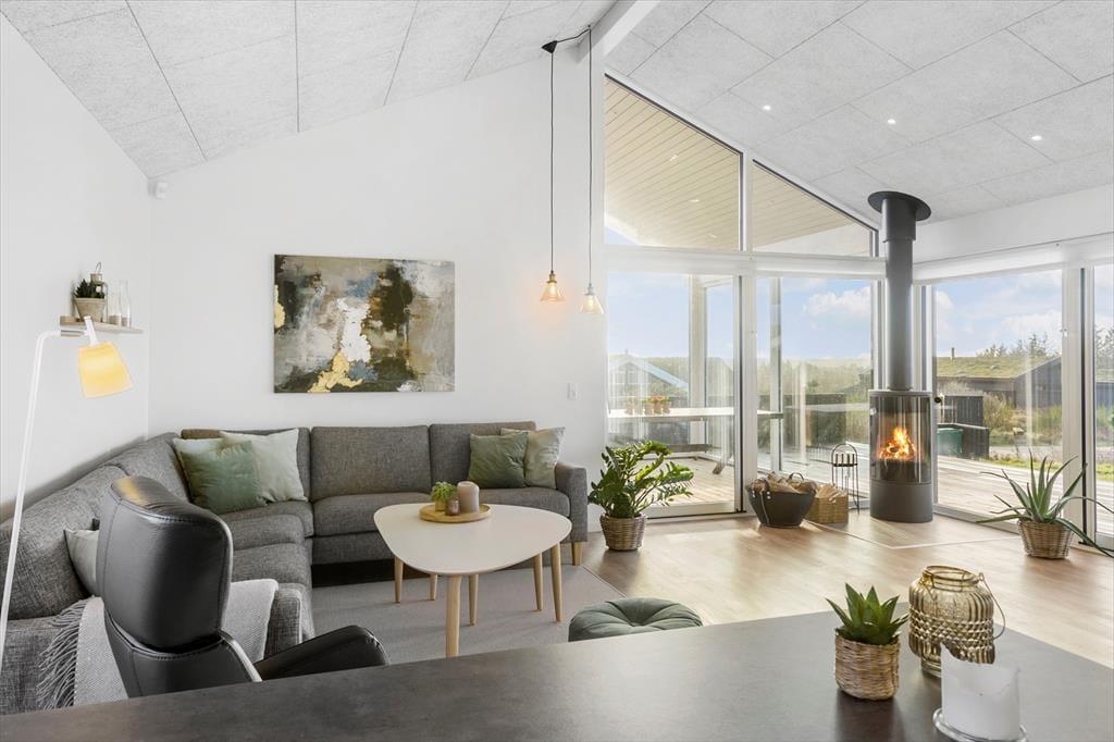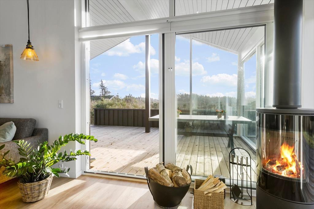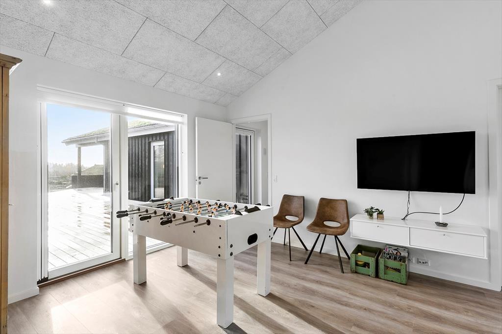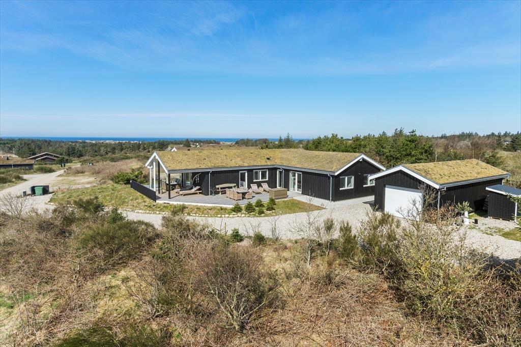 Det 150 m2 store sommerhus er opført i 2021 i ordentlige kvalitetsmaterialer. Man har heller ikke gået på kompromis med indretningen, for den er lys og lækker med komfortable møbler af stilfuldt design. Derfor kan I straks føle jer godt til rette i de indbydende rum, der består af fire soveværelser, to badeværelser, et aktivitetsrum og en stue med integreret køkken. Soveværelserne er smart fordelt i to afdelinger, så huset kan oplagt deles af to familier – og på praktisk vis kan dobbeltsengene på to af værelserne laves om til enkeltsenge, hvis det foretrækkes. I aktivitetsrummet kan et slag bordfodbold få jer op i omdrejninger, hvis ikke I hellere vil slappe af med en god film i sofaen. Afslapningsstunderne kan også i den flotte stue, der byder på brændeovn, gennemstrømmende lysindfald og udsigt til Vesterhavet, og hvis I skal flade helt ud, er det skønt med et karbad på det største badeværelse.