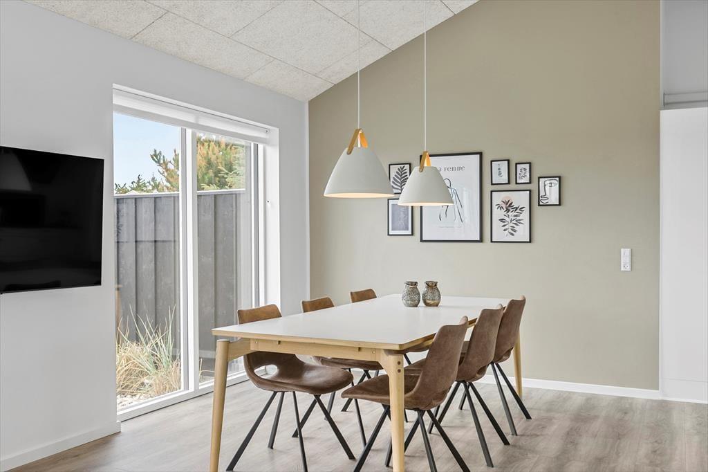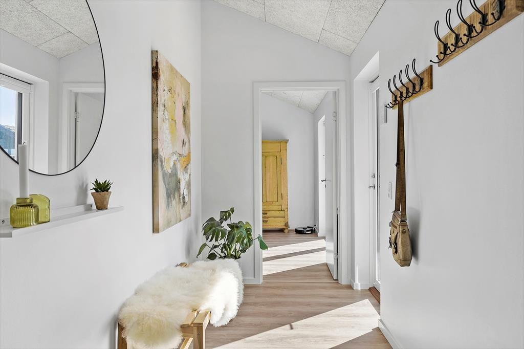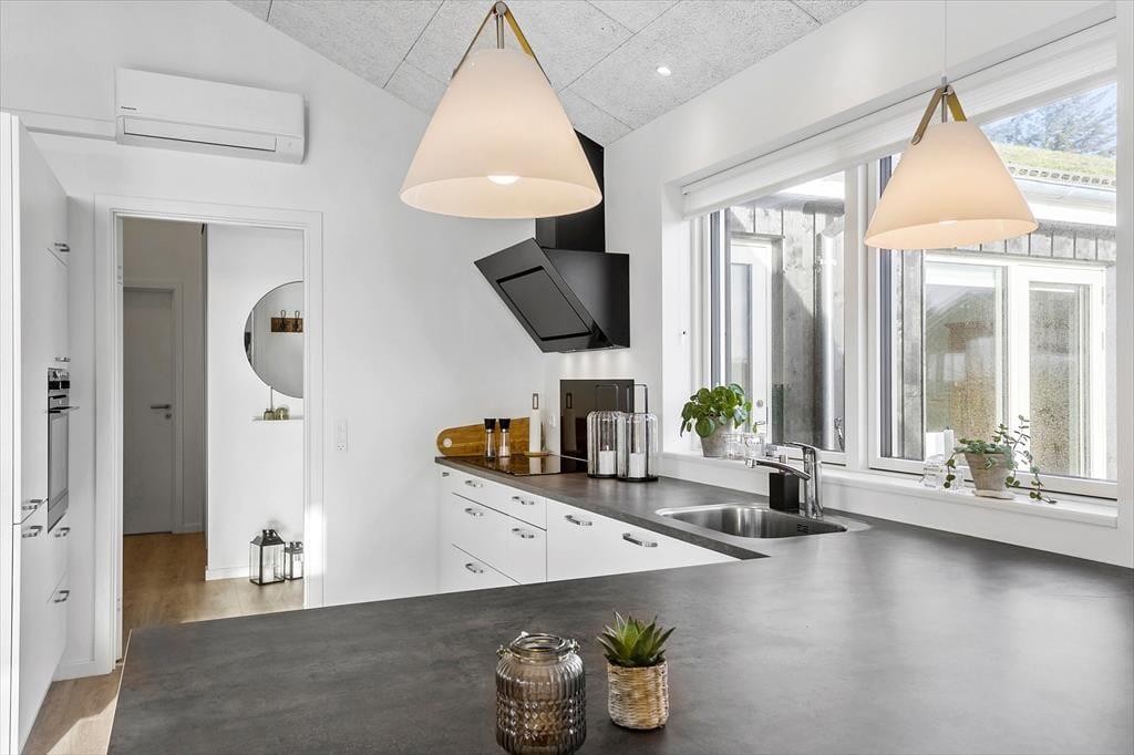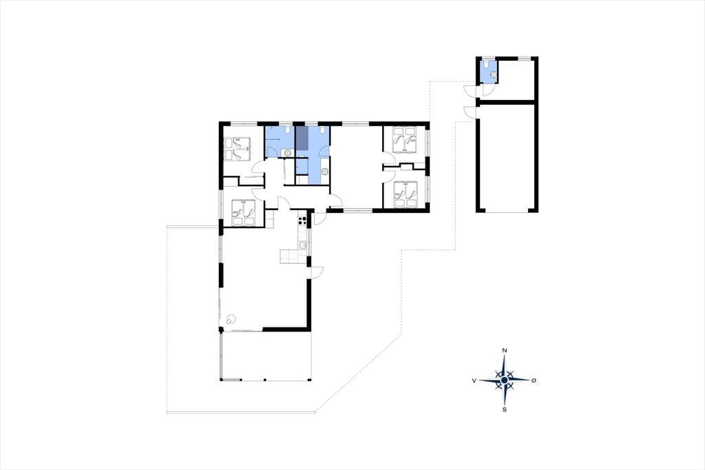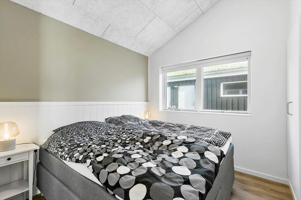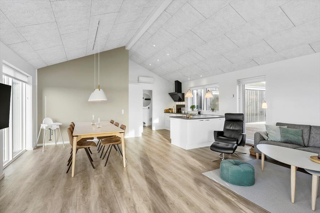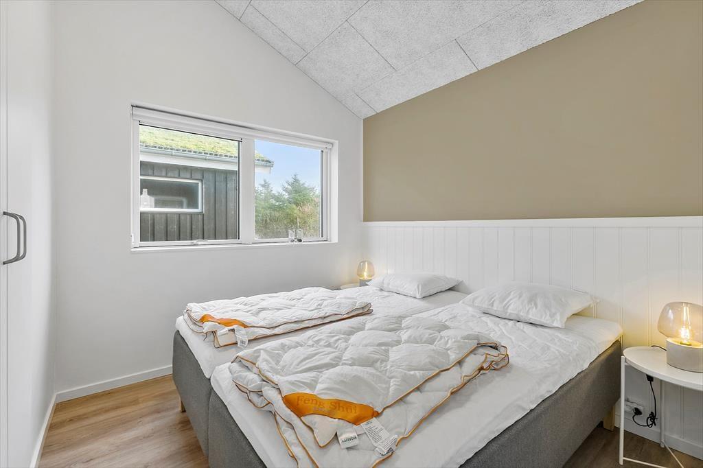 Det 150 m2 store sommerhus er opført i 2021 i ordentlige kvalitetsmaterialer. Man har heller ikke gået på kompromis med indretningen, for den er lys og lækker med komfortable møbler af stilfuldt design. Derfor kan I straks føle jer godt til rette i de indbydende rum, der består af fire soveværelser, to badeværelser, et aktivitetsrum og en stue med integreret køkken. Soveværelserne er smart fordelt i to afdelinger, så huset kan oplagt deles af to familier – og på praktisk vis kan dobbeltsengene på to af værelserne laves om til enkeltsenge, hvis det foretrækkes. I aktivitetsrummet kan et slag bordfodbold få jer op i omdrejninger, hvis ikke I hellere vil slappe af med en god film i sofaen. Afslapningsstunderne kan også i den flotte stue, der byder på brændeovn, gennemstrømmende lysindfald og udsigt til Vesterhavet, og hvis I skal flade helt ud, er det skønt med et karbad på det største badeværelse.