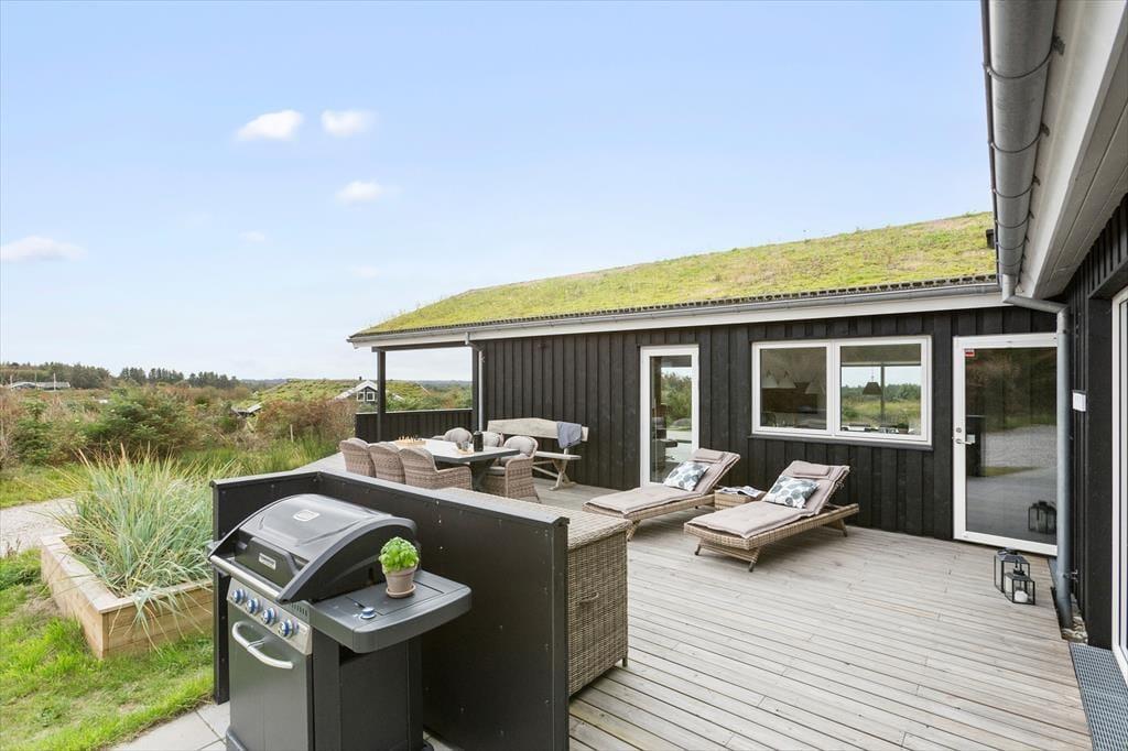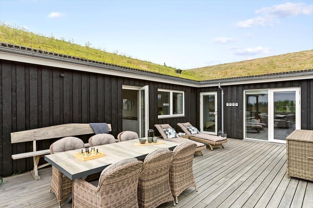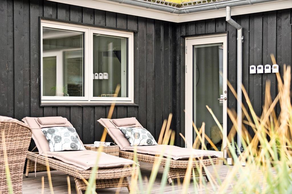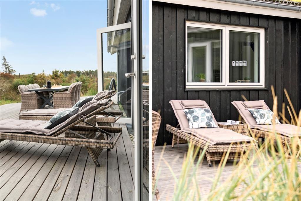 Vesterhavet og Saltums flotte naturomgivelserne kan også nydes, når I sidder ude i det fri. Et stort terrassemiljø breder sig rundt om sommerhuset, og her er der både åbne og overdækkede områder at vælge imellem. Det overdækkede område har endda glasafskærmning, så her kan I sidde helt i læ– og med havudsigten i behold.