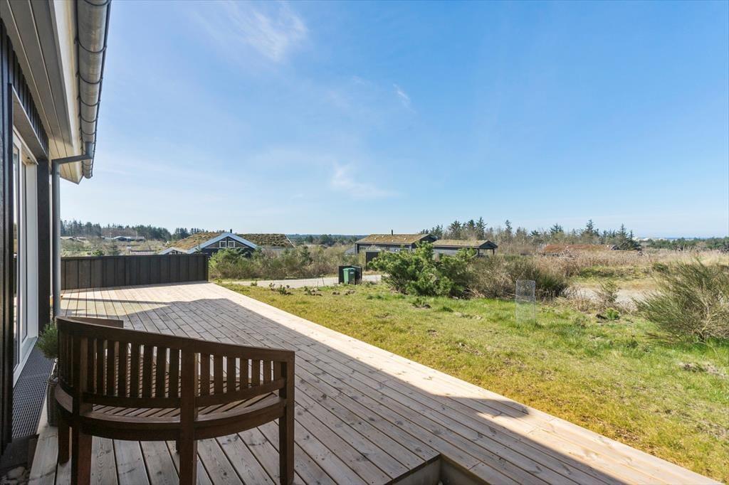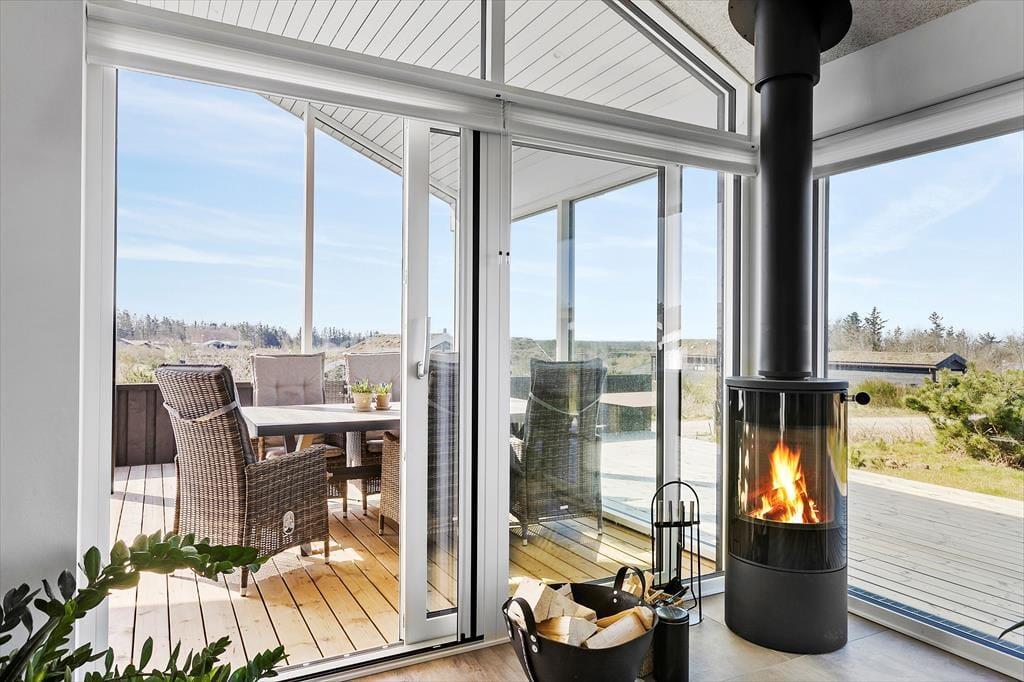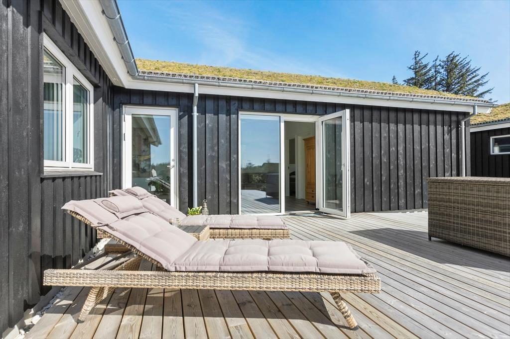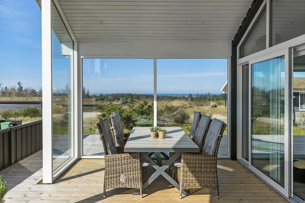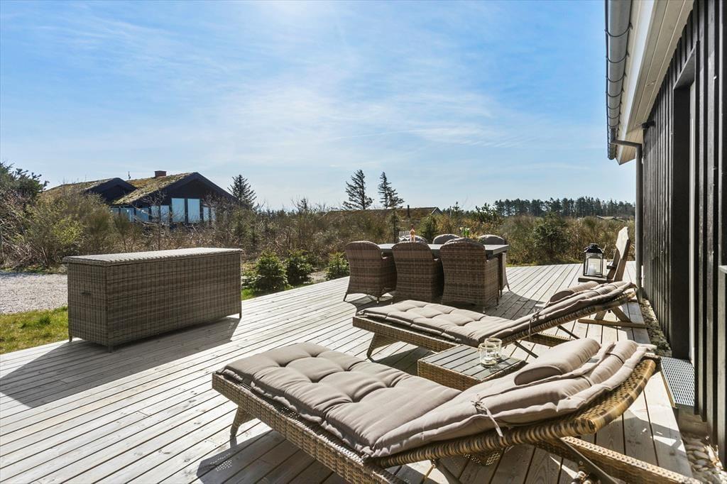 Vesterhavet og Saltums flotte naturomgivelserne kan også nydes, når I sidder ude i det fri. Et stort terrassemiljø breder sig rundt om sommerhuset, og her er der både åbne og overdækkede områder at vælge imellem. Det overdækkede område har endda glasafskærmning, så her kan I sidde helt i læ– og med havudsigten i behold.