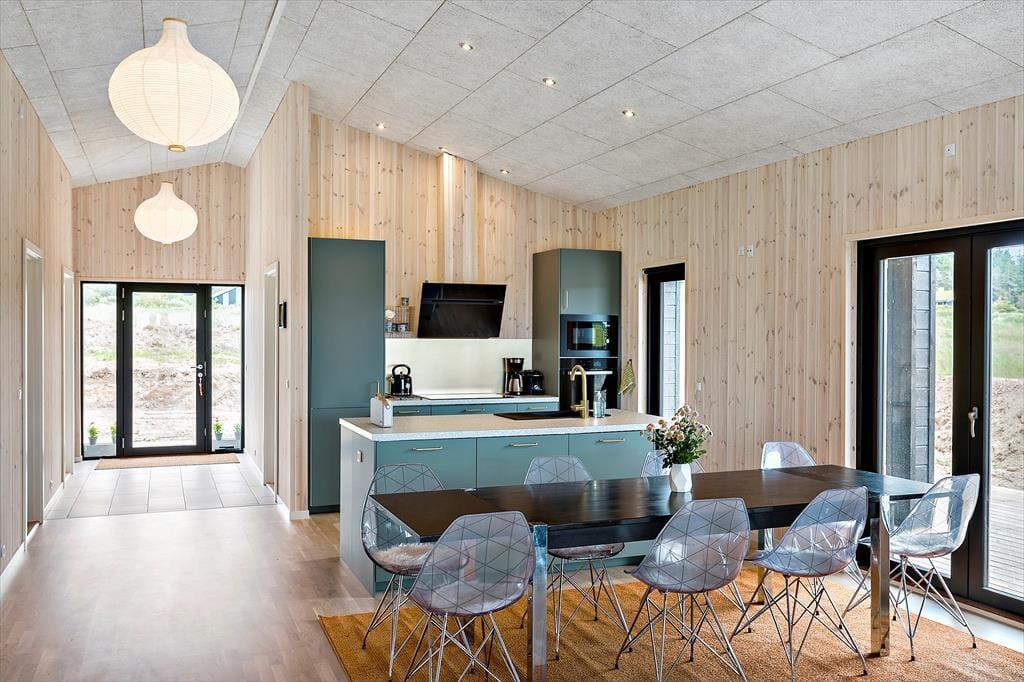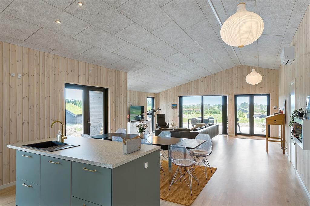 Der blev lagt sidste hånd på det 150 m2 store sommerhus så sent som i 2022, så I kan forvente, at alt bare spiller. Hvis I kan lide at kokkerere, kan I allerede nu begynde at glæde jer til at stå i det flotte og veludstyrede køkken – det er bare noget andet at lave mad, når det er ferietid, og alting kan foregå i et langsommere tempo. Køkkenet ligger som del af et stort opholdsrum, der er udstyret med spisebord og en skøn sofaafdeling, og takket være de mange vinduer kan I nyde det smukke lysindfald og den fine udsigt uanset, hvor I er. I stuen er der stort fladskærms-tv med Chromecast, så I kan slappe af med en film eller jeres yndlingsserie – med mindre I foretrækker en tilbagelænet pause i spabadet i stedet. Spabadet står på det største af husets to badeværelser, der ligger godt fordelt i huset, præcis ligesom de fire gode soveværelser.