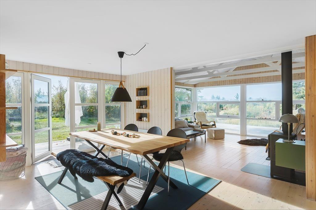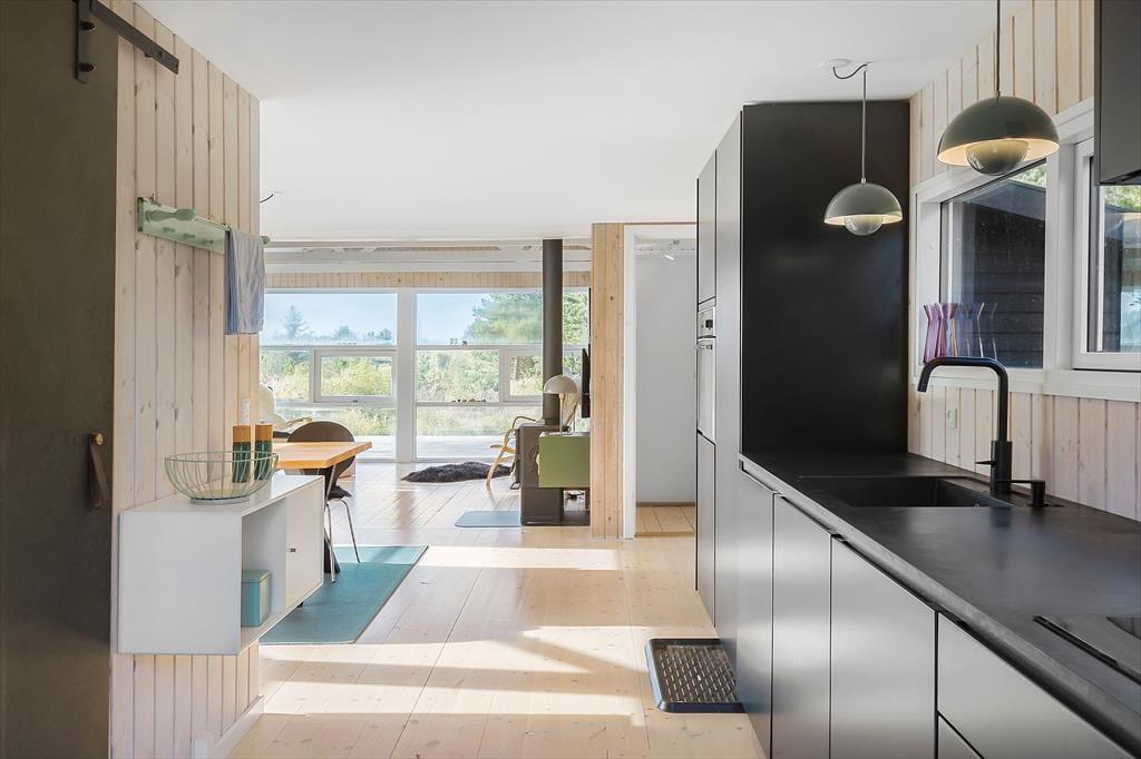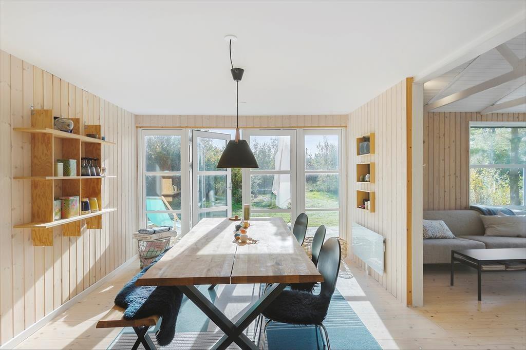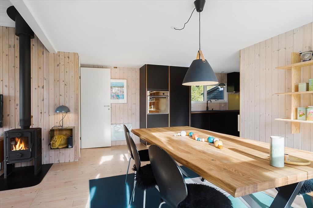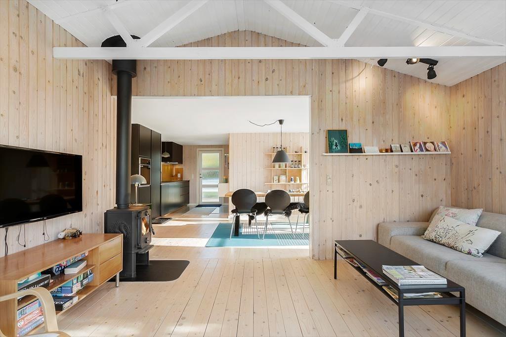 Det 82 m2 store hus har ligget her i Saltums grønne landskab siden 1961. I 2021 blev det renoveret og efterfølgende indrettet på gennemført vis, så husets indre fremstår hyggeligt og indbydende. Blandt andet er der kommet et flot, nyt køkken i opholdsafdelingen, der består af stue og køkken-alrum i åben forbindelse. En klassisk brændeovn er med til at skrue op for hyggestemningen og temperaturen, og rummets store vinduespartier giver jer mulighed for at kigge ud det naturskønne område, når I slapper af inden døre. Planløsningen byder for øvrigt på et badeværelse og to soveværelser, der er udstyret med henholdsvis en dobbeltseng og to enkeltsenge, så huset egner sig fint til fire personer.