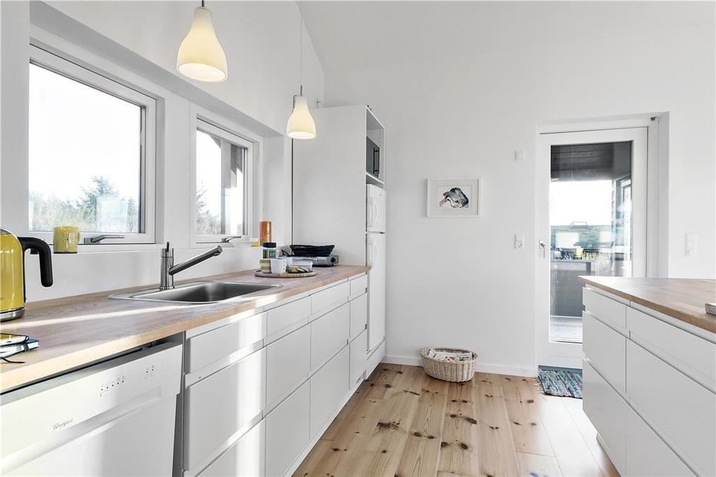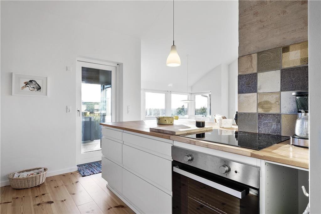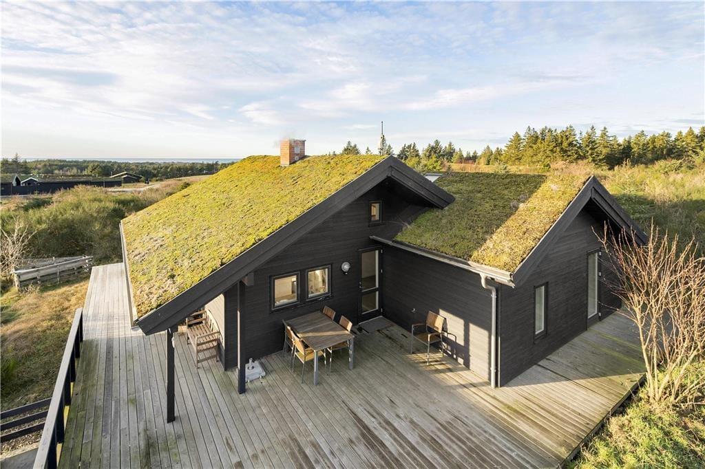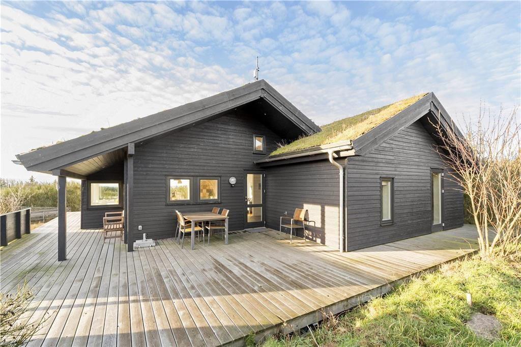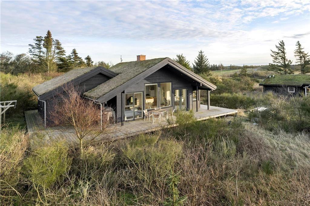 Huset er et moderne ét af slagsen fra 2014, men med grønt tag og sort træfacade afsløres det allerede udefra, at stilen er ganske klassisk. Inden døre er der ligeledes fundet en fornem balance mellem stilrent design og hyggelige detaljer, der alt i alt skaber en original sommerhusstemning. For eksempel giver køkkenafdelingen jer en lækker arbejdsstation, når der skal kokkereres, mens stuens pejseindsats bidrager med varme og atmosfære, hvis I tænder op om aftenen. Og uanset tidspunktet på dagen har I en forrygende udsigt over smuk natur – endda med Vesterhavet i horisonten takket være husets høje beliggenhed. Foruden husets opholdsstue med integreret køkkenafdeling byder huset på et badeværelse og tre gode værelser med i alt seks sengepladser