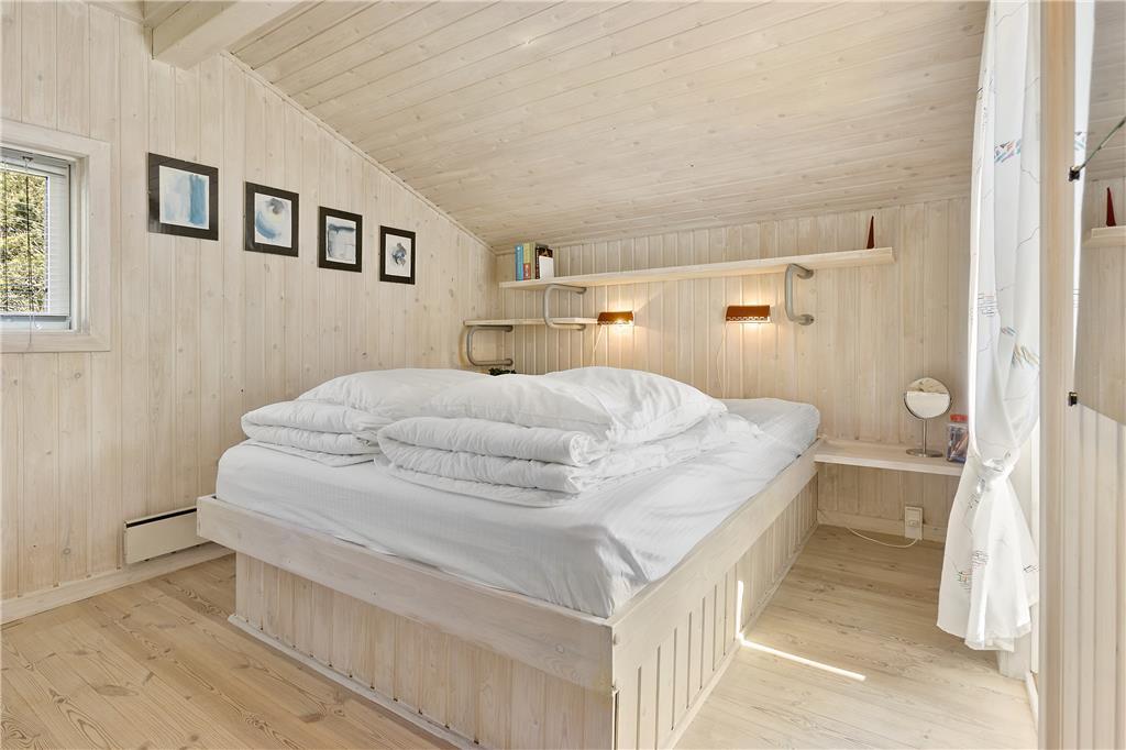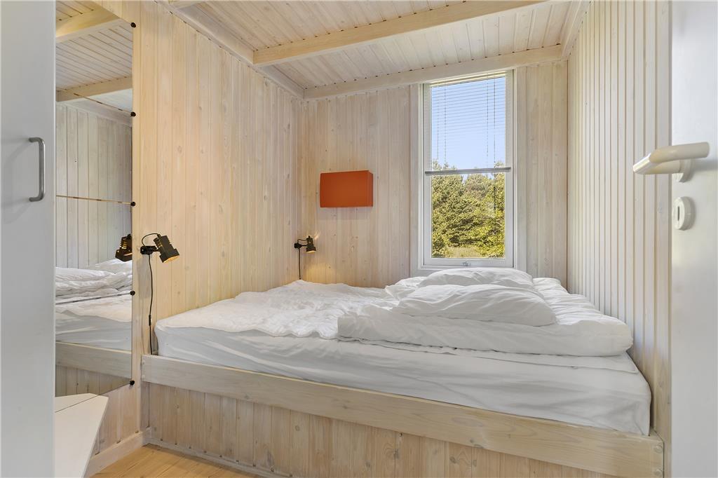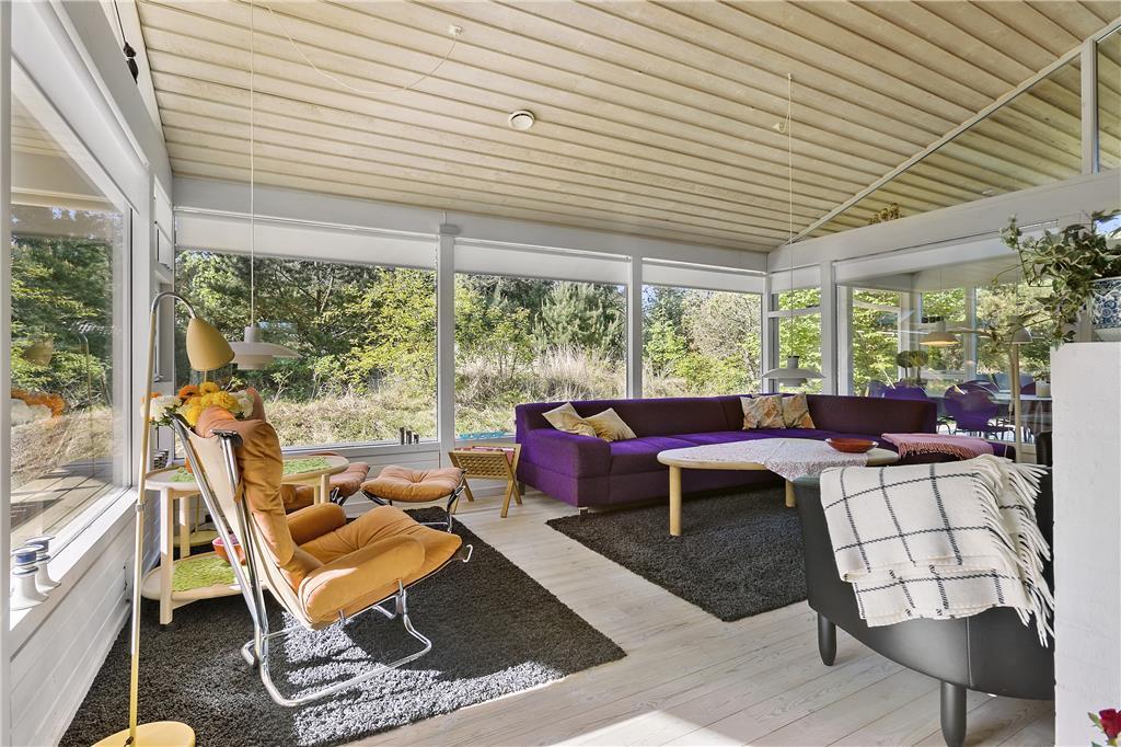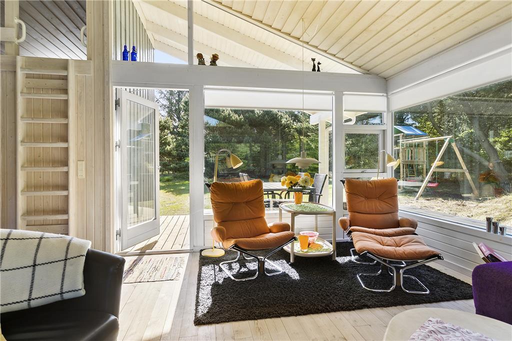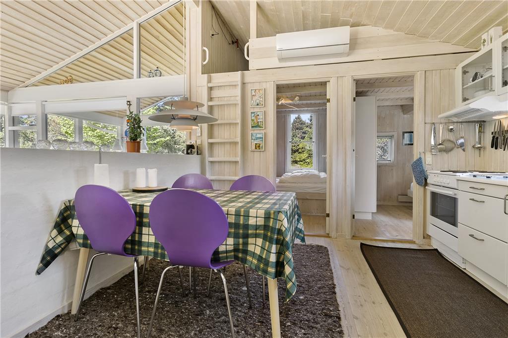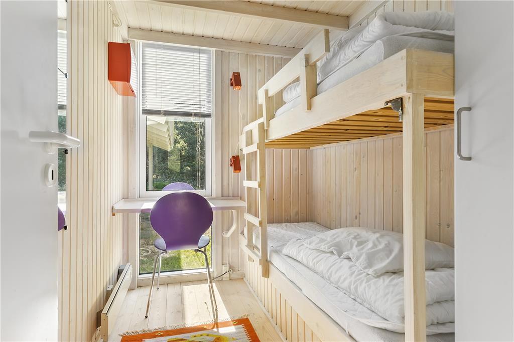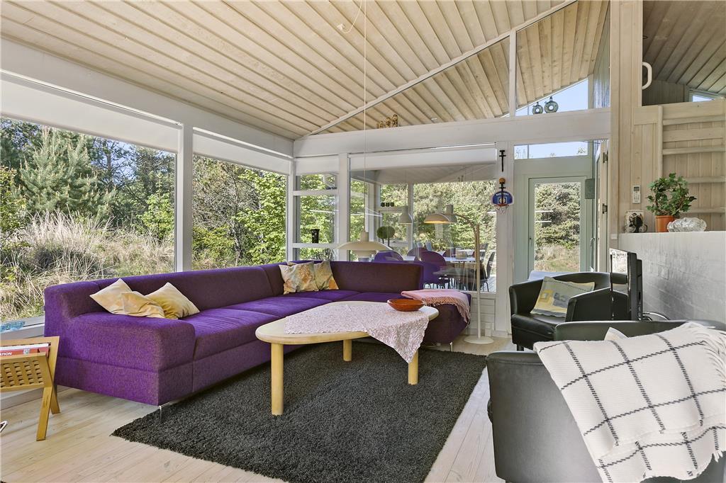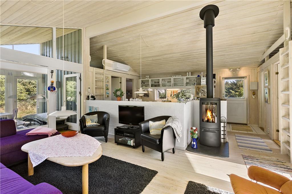 Sommerhuset har to soverum med dobbeltsenge samt et soverum med køjesenge. Sommerhuset udlejes til 6 personer. Rigtigt hyggeligt opholdsrum med bl.a. brændeovn og fladskærms-TV med mulighed for Apple TV og Chromecast. Der er store panoramavinduer hele vejen rundt, så der er godt kig til naturen og godt lysindfald i huset. Opholdsrummet ligger i åben forbindelse med det veludstyrede køkken. Godt badeværelse med spabad. Her mangler du ikke noget, og alt er særdeles velholdt. Alt er indrettet med stor kærlighed og omtanke.