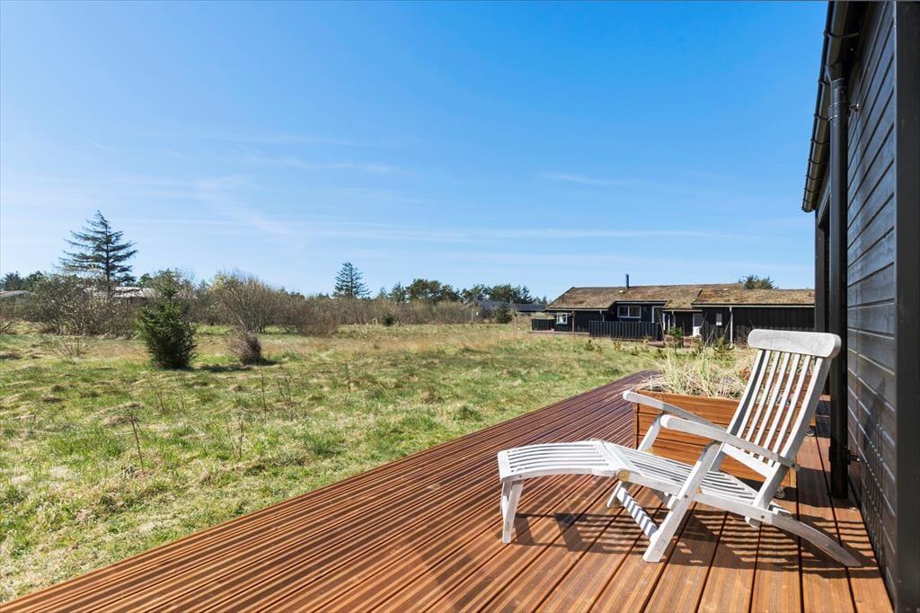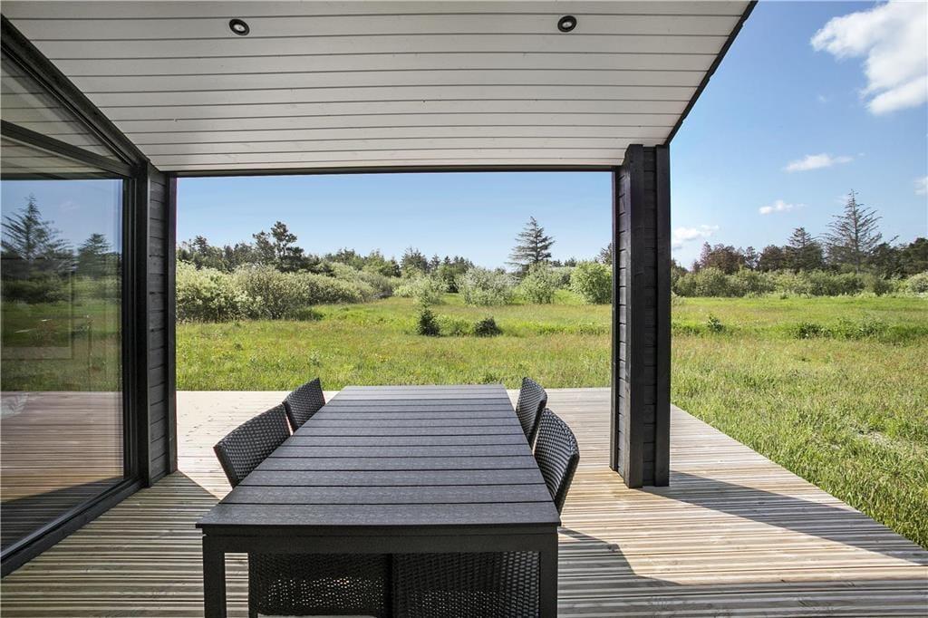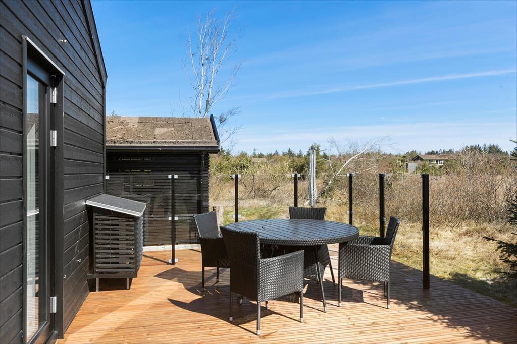 Udsigten og de fredsommelige omgivelser bliver naturligvis ikke ringere af, at I rykker jer udenfor under åben himmel. Fra træterrassen, der går hele vejen rundt om huset og er delvist overdækket, kan I skue ud over nåletræer, lave buskadser og åbne områder. Huset er det sidste på den lukkede vej, og til den ene side er jeres nabo endda et fredet areal. Måske tripper råvildt forbi, men meget mere sker her ikke – så det er med andre ord et oplagt sted at komme helt ned i tempo.
