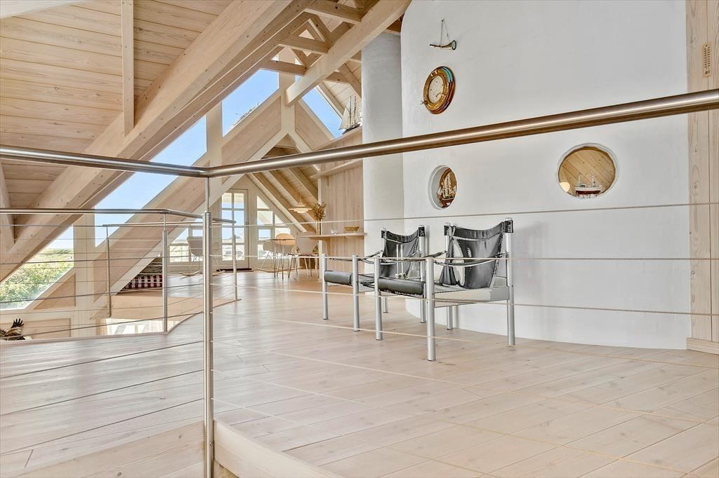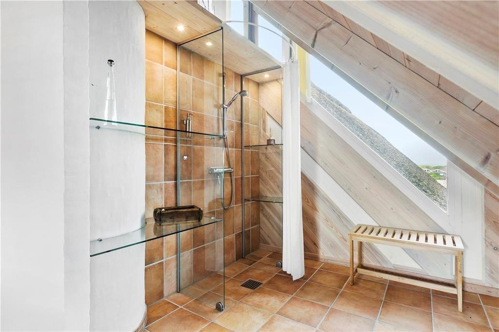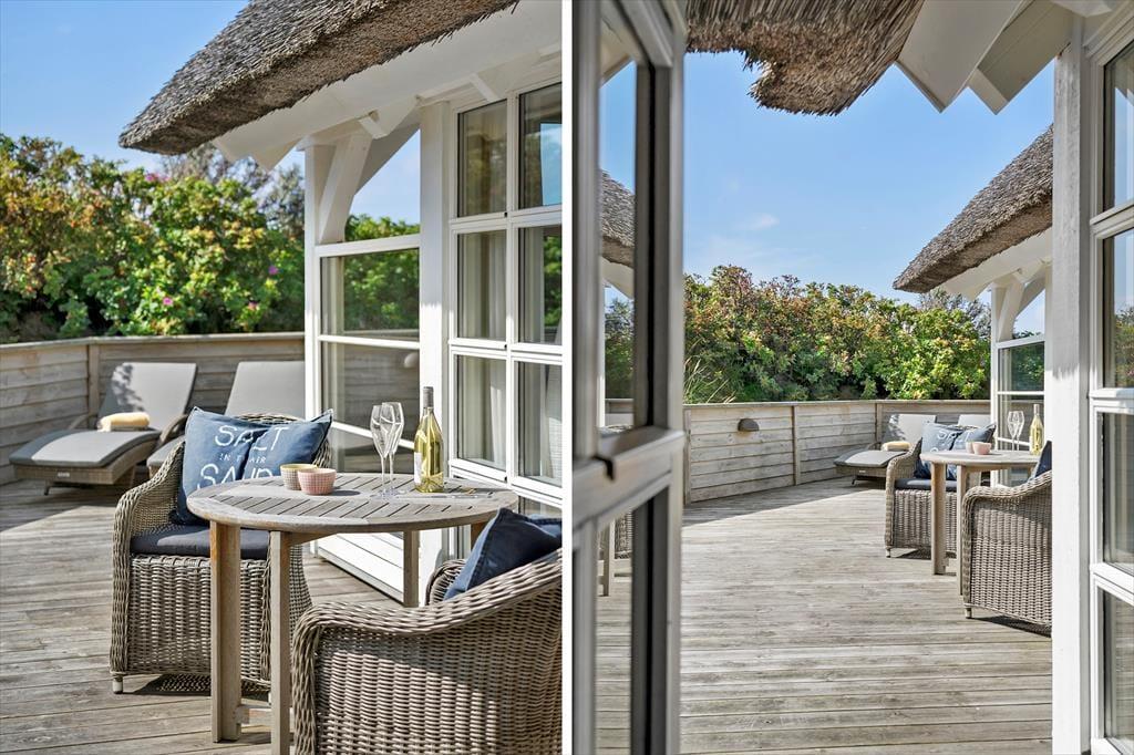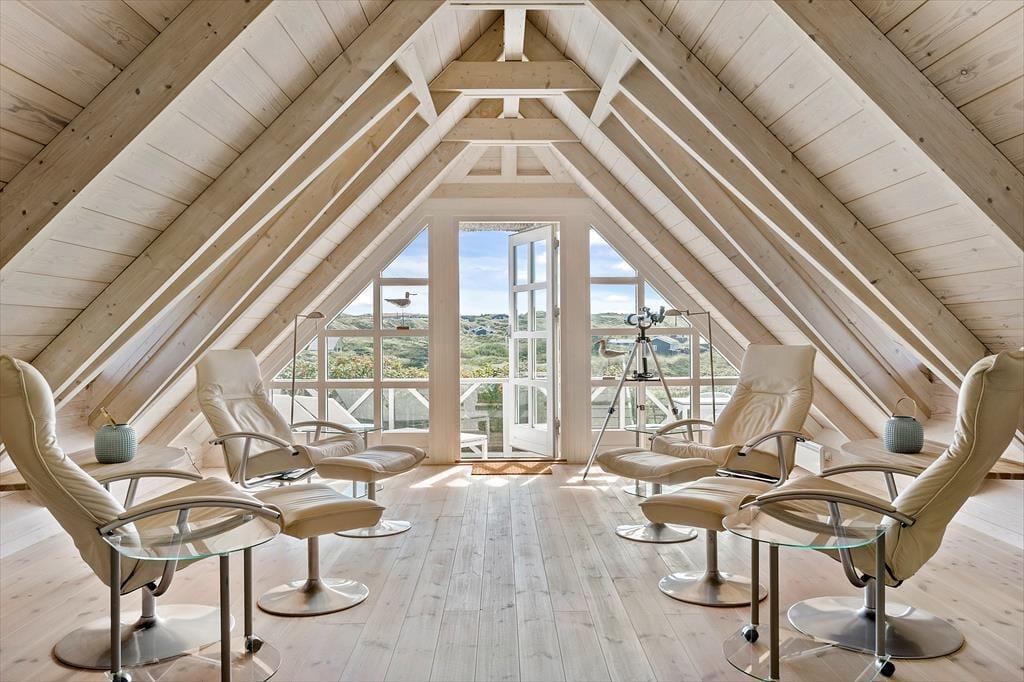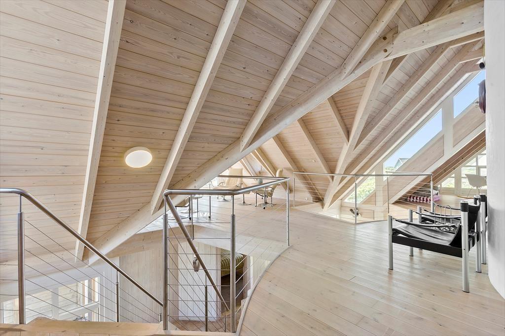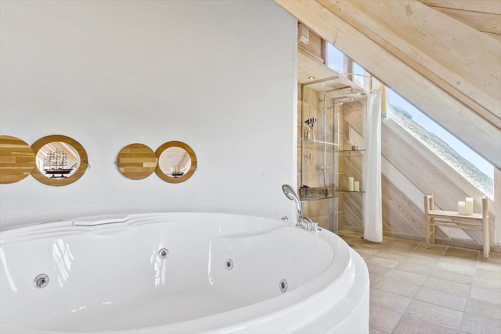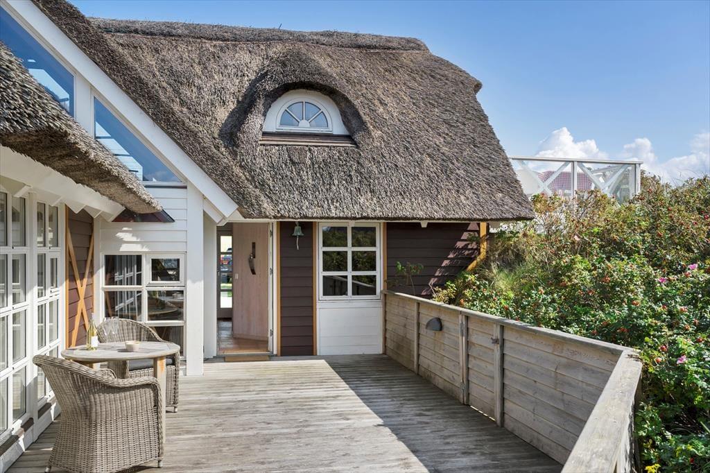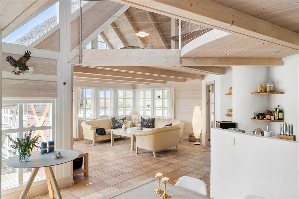 Set udefra får man allerede fornemmelsen af, at dette hus er i absolut topklasse. Med mørk træbeklædning, idyllisk stråtag i flere niveauer og sprossede vinduespartier vendt mod vandet har arkitekterne fundet et udtryk, der passer perfekt ind i de flotte naturomgivelser. Indendørs kan I brede jer på hele 198 m2, og også her er der valgt en stil, der balancerer flot mellem det klassiske og moderne. Fordelt på to plan har I tre soveværelser til rådighed foruden to lækre badeværelser, som begge er udstyret med spabad. En sauna ligger desuden i forbindelse med stueplanets badeværelse, så I kan blive varmet igennem efter en dukkert eller en blæsevejrsgåtur langs Vesterhavet. I stueplan ligger også et stort og herligt opholdsrum med integreret stue og køkken-alrum. Herfra er der åben forbindelse op til førstesalens stuemiljø, så der er god kontakt mellem etagerne – og det har naturligvis også betydning for lysindfaldet og den luftige rumfornemmelse. Rummene er indrettet med mange hyggekroge og komfortable opholdspladser, så det er op til jer, om I vil sidde nær brændeovnen, bænke jer omkring spisebordet eller nyde udsigten til Vesterhavet og de marehalmsklædte klitter fra førstesalens udsigtspost.