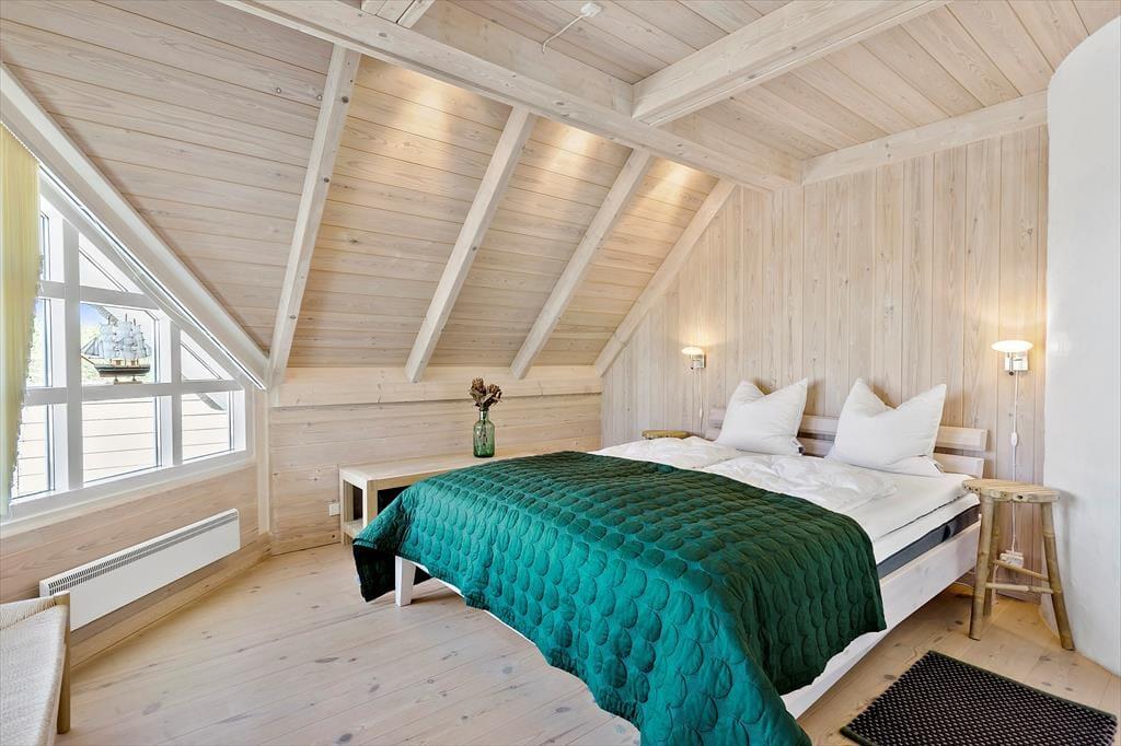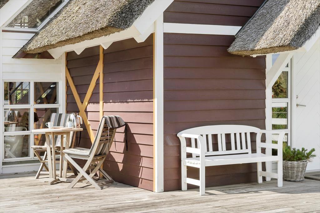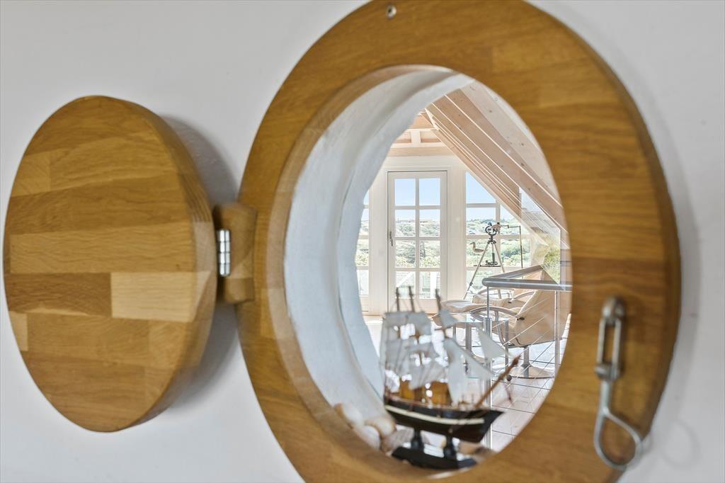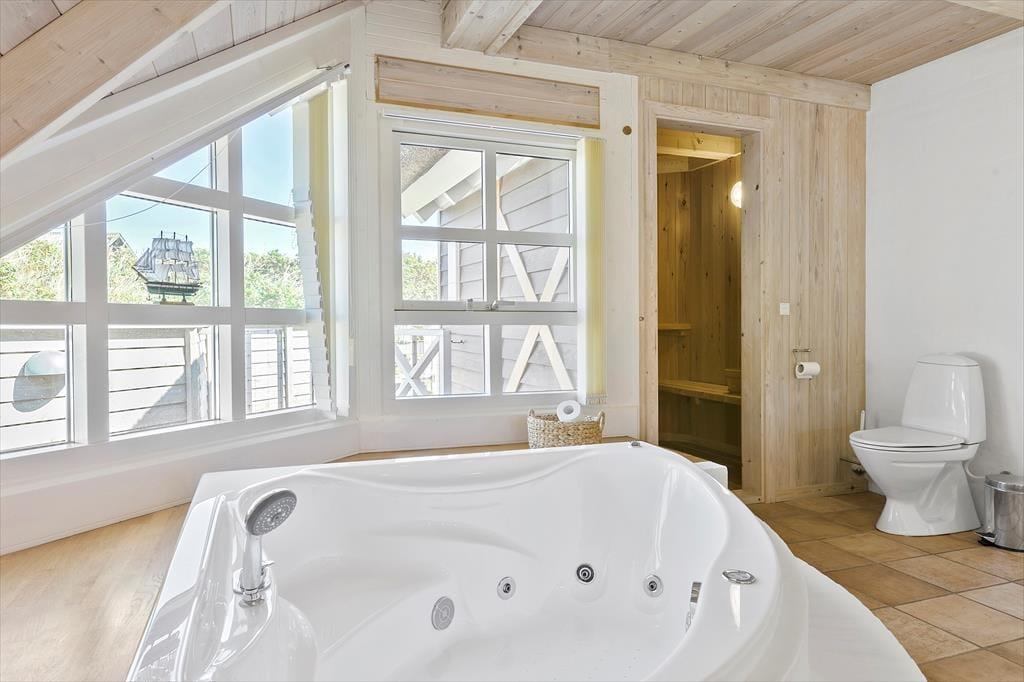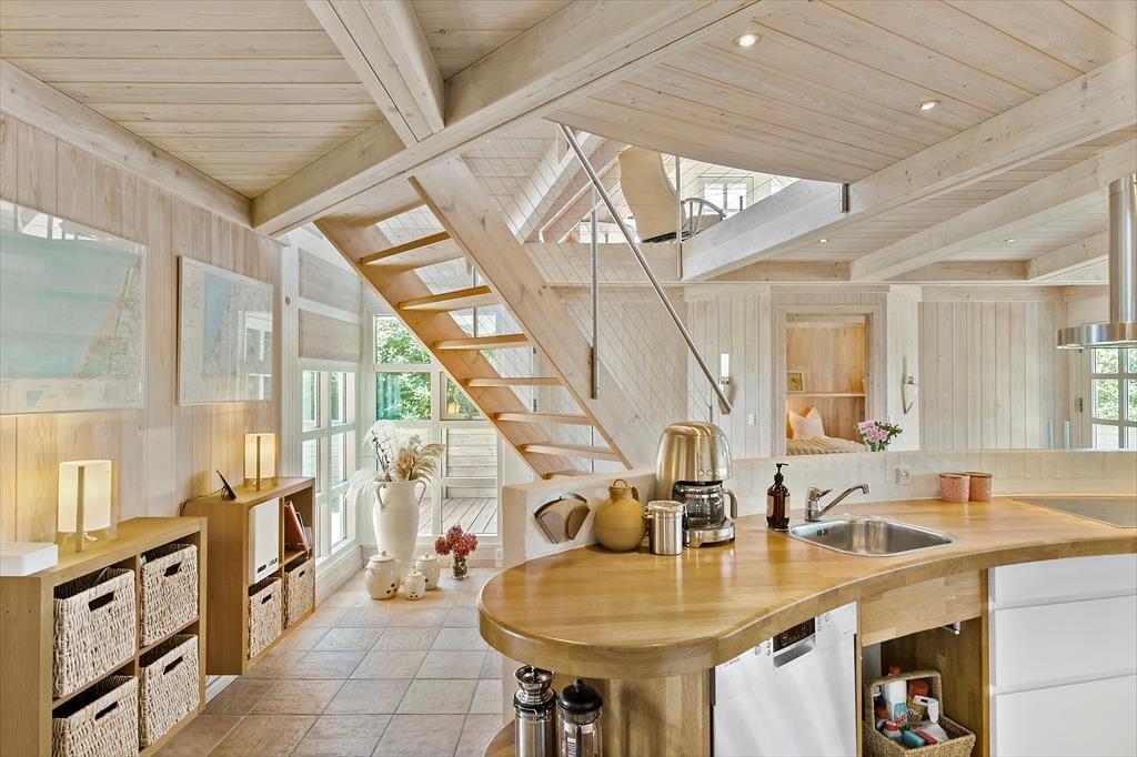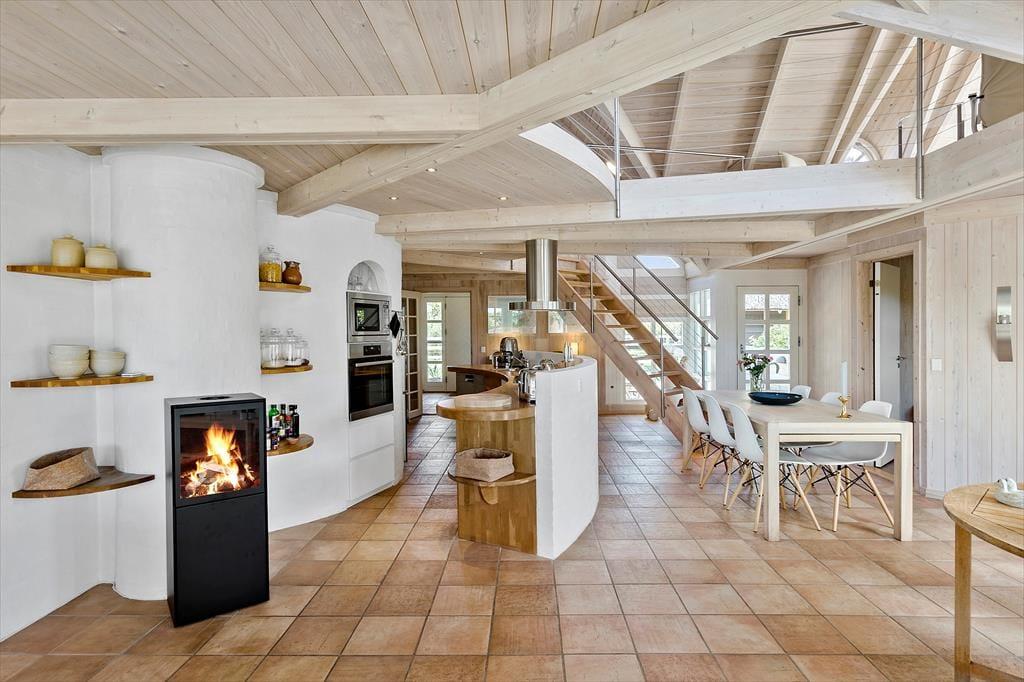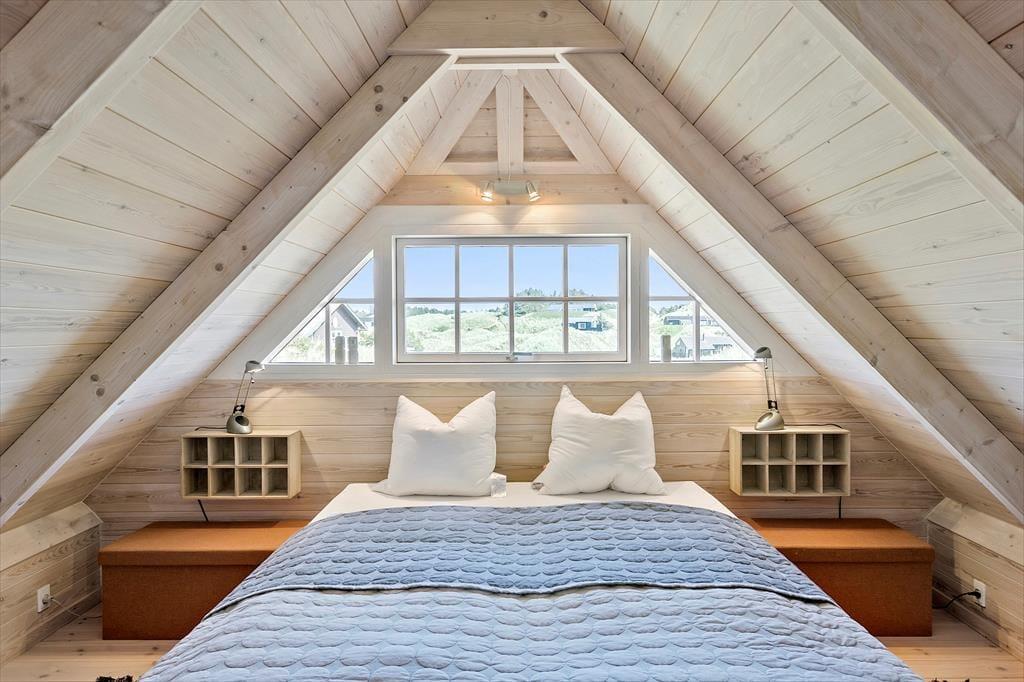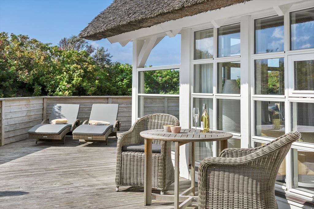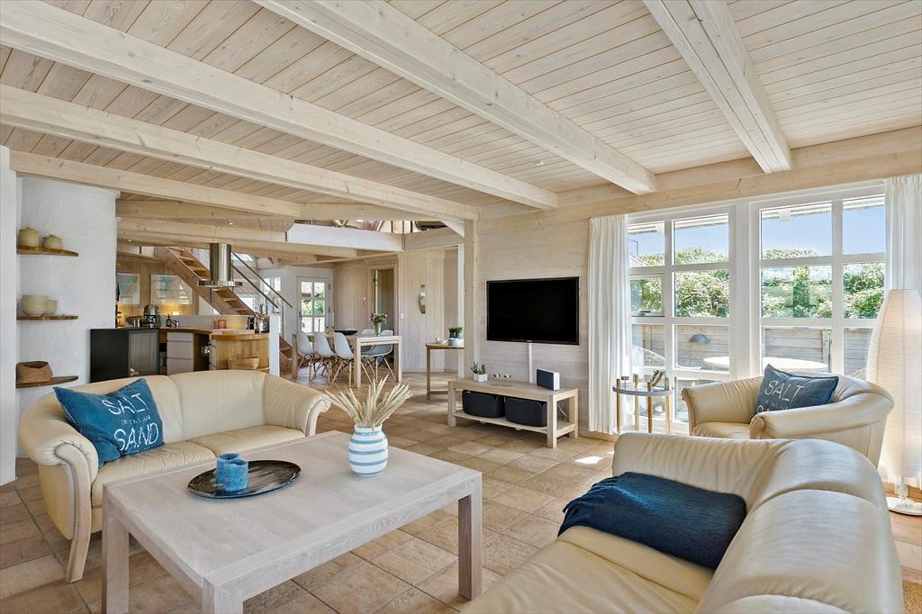 Set udefra får man allerede fornemmelsen af, at dette hus er i absolut topklasse. Med mørk træbeklædning, idyllisk stråtag i flere niveauer og sprossede vinduespartier vendt mod vandet har arkitekterne fundet et udtryk, der passer perfekt ind i de flotte naturomgivelser. Indendørs kan I brede jer på hele 198 m2, og også her er der valgt en stil, der balancerer flot mellem det klassiske og moderne. Fordelt på to plan har I tre soveværelser til rådighed foruden to lækre badeværelser, som begge er udstyret med spabad. En sauna ligger desuden i forbindelse med stueplanets badeværelse, så I kan blive varmet igennem efter en dukkert eller en blæsevejrsgåtur langs Vesterhavet. I stueplan ligger også et stort og herligt opholdsrum med integreret stue og køkken-alrum. Herfra er der åben forbindelse op til førstesalens stuemiljø, så der er god kontakt mellem etagerne – og det har naturligvis også betydning for lysindfaldet og den luftige rumfornemmelse. Rummene er indrettet med mange hyggekroge og komfortable opholdspladser, så det er op til jer, om I vil sidde nær brændeovnen, bænke jer omkring spisebordet eller nyde udsigten til Vesterhavet og de marehalmsklædte klitter fra førstesalens udsigtspost.