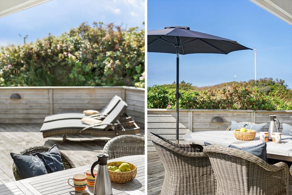 Den flotte udsigt kan også nydes ude i det fri fra førstesalens to altaner, hvoraf den ene er overdækket. På terrassen er der også et overdækket areal, hvis I har brug for lidt skygge, og ellers er der mange dejlige solkroge at vælge imellem, for den lukkede træterrasse smyger sig stort set hele vejen rundt om huset. Terrassemiljøet er desuden helt afskærmet af plankeværk, mens græsarealet ved garagen er lukket af med stakit.