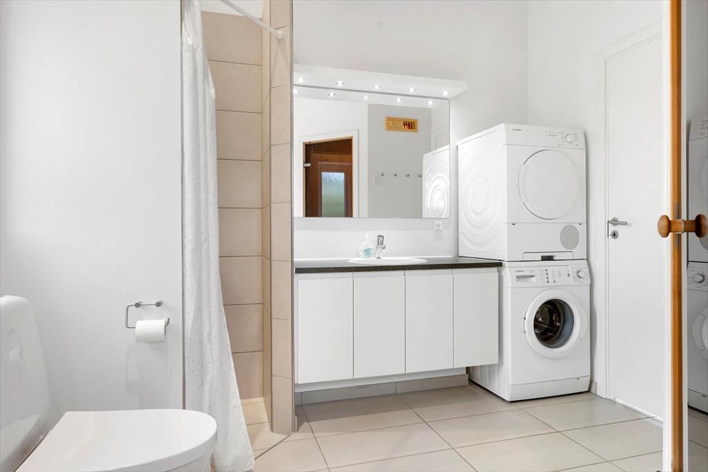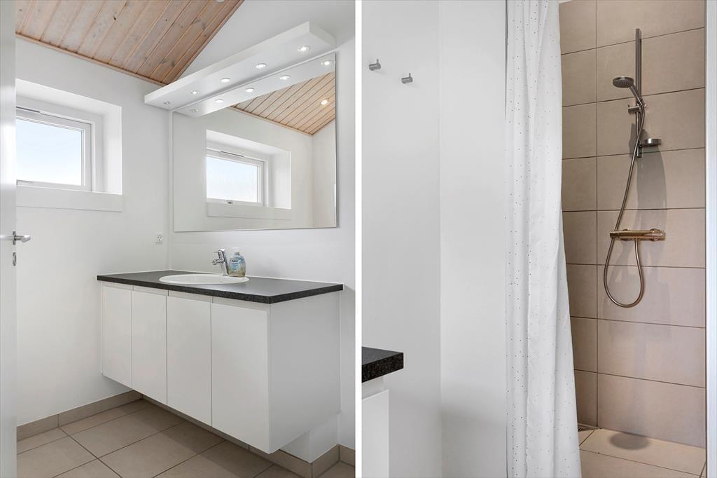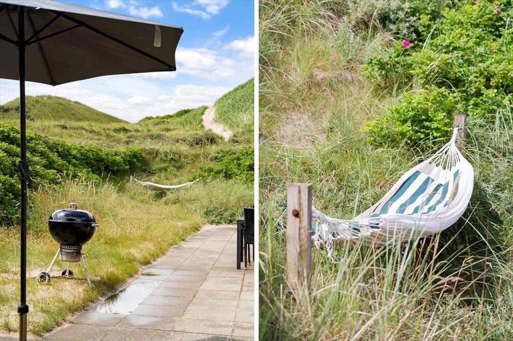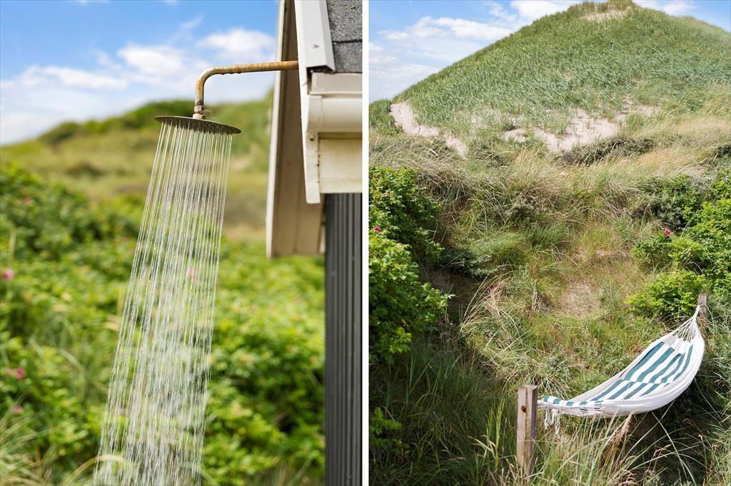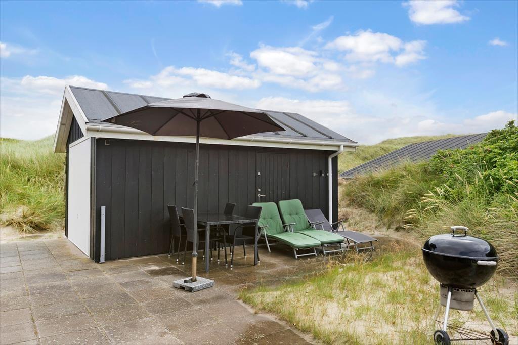Et stort, flisebelagt terrasseområde smyger sig rundt om både huset og det tilhørende skur, så der er mange gode lækroge og solrige opholdspladser at vælge imellem. En del af terrassen er også overdækket, hvis I foretrækker det – og ellers kan I placere parasollen ved liggestolene, hvis middagsluren helst skal være i skyggen. Bag skuret har I en udendørs bruser, så I nemt kan skylle saltvandet af jer og blive frisket op. Flere steder fra grunden er det muligt at se ud over Vesterhavet og grunden går direkte ned til havet - så tættere på kommer man ikke.
