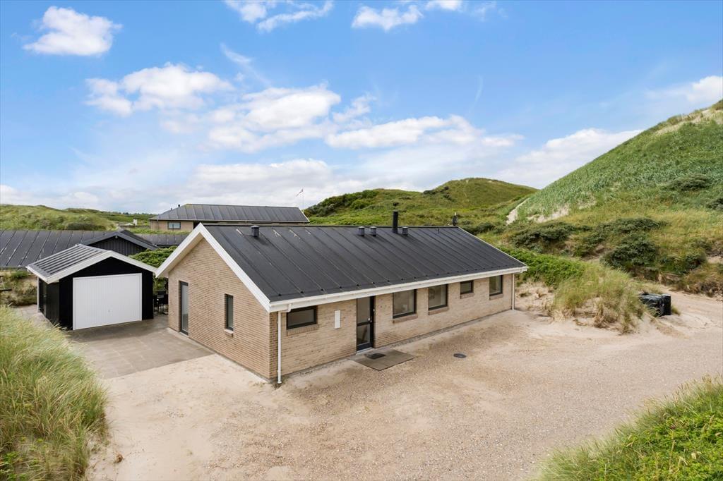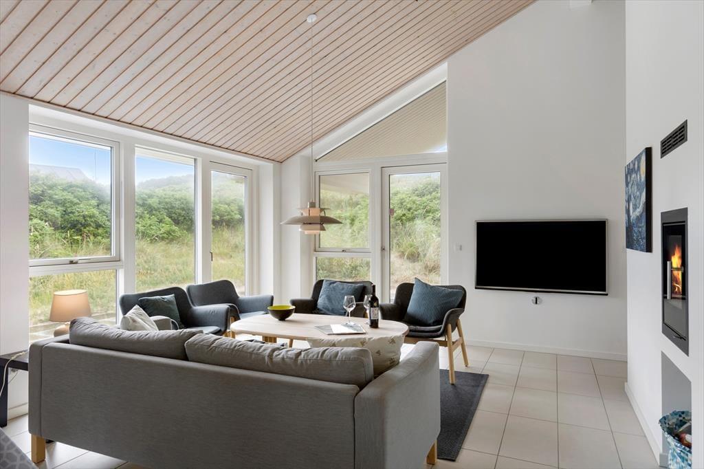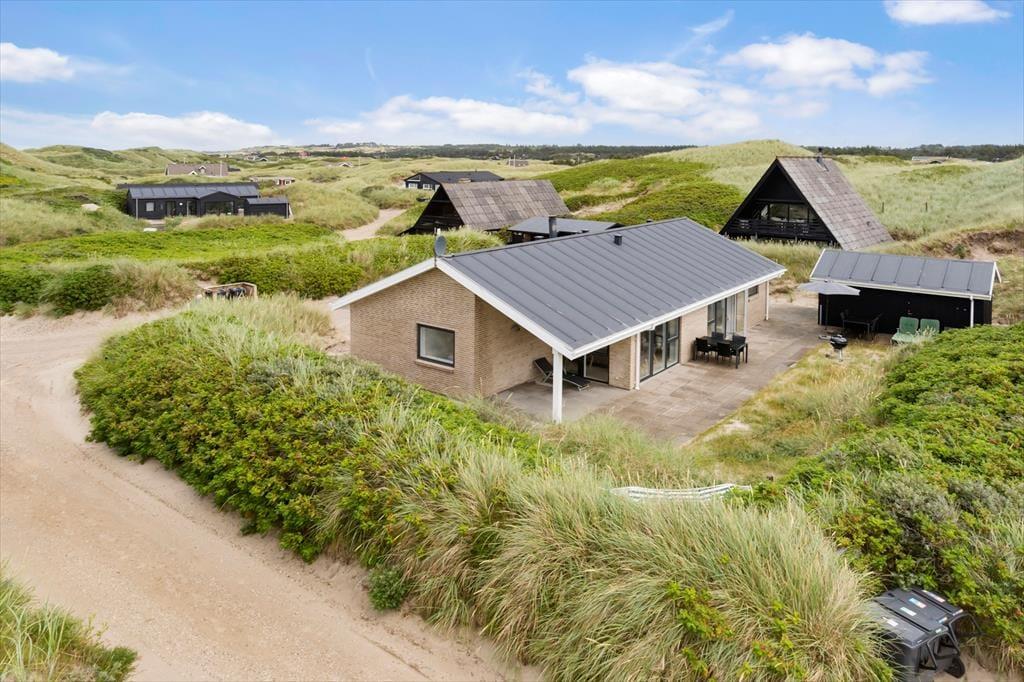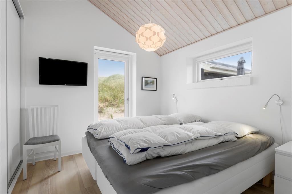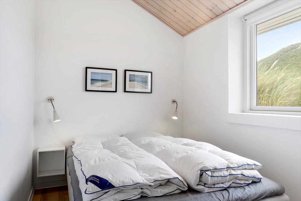 Sommerhuset er et moderne murstensbyggeri fra 2015, som passer godt ind i de naturskønne omgivelser. Indretningen er lys, let og luftig, og fra alle rum kan I se lige ud på det imponerende landskab med bløde klitter, marehalm og fint sand. De fire soveværelser giver i alt plads til otte personer, mens I alle kan samles i det rummelige opholdsrum, hvor stue og køkken er forenet. Om aftenen kan I tænde op i indbygningspejsen, slå jer ned i sofaerne og hygge jer med en god film på fladskærmen, og når solen skinner udenfor, kan I åbne havedørene og træde direkte ud på terrassen. Planløsningen fuldendes desuden af to badeværelser, hvoraf det ene er udstyret med både spa og sauna.