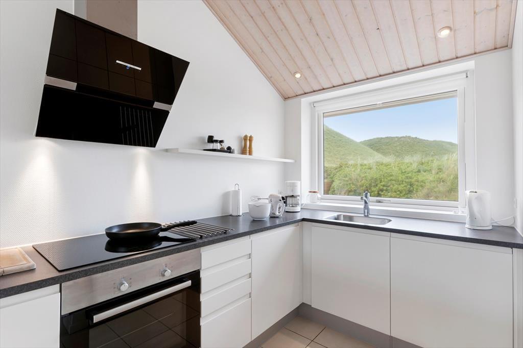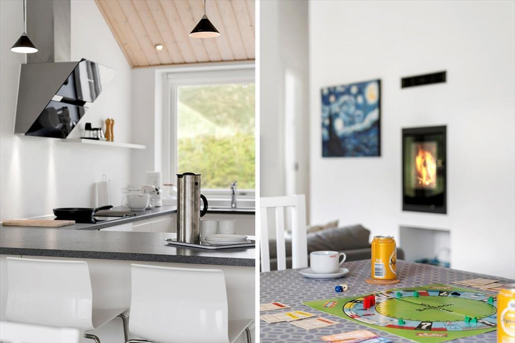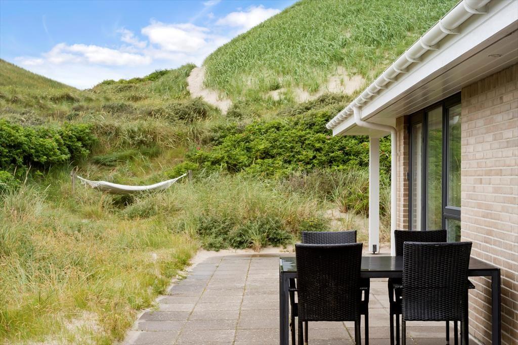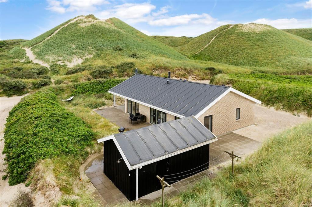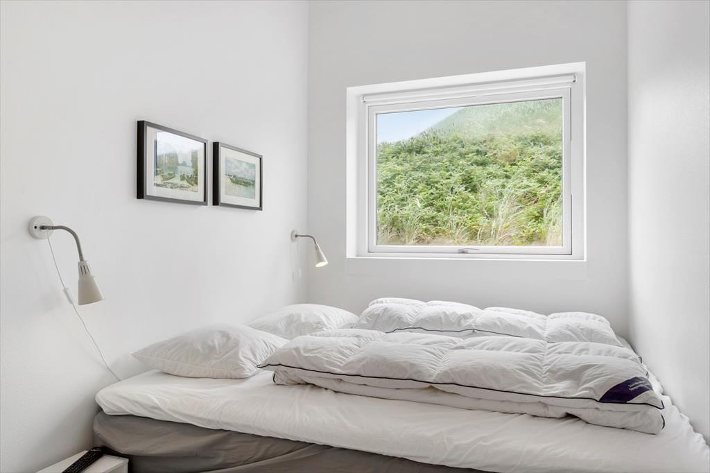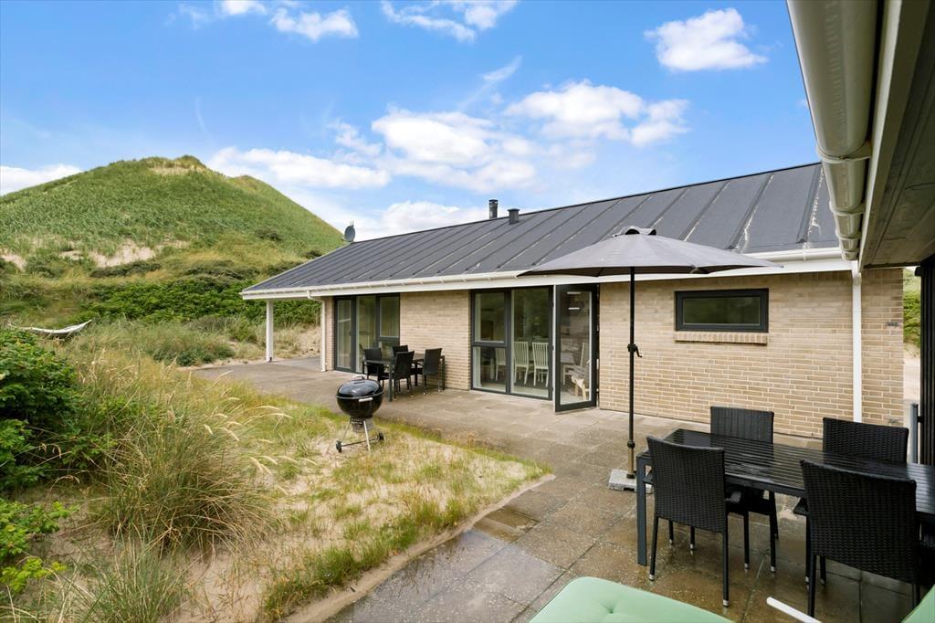Sommerhuset er et moderne murstensbyggeri fra 2015, som passer godt ind i de naturskønne omgivelser. Indretningen er lys, let og luftig, og fra alle rum kan I se lige ud på det imponerende landskab med bløde klitter, marehalm og fint sand. De fire soveværelser giver i alt plads til otte personer, mens I alle kan samles i det rummelige opholdsrum, hvor stue og køkken er forenet. Om aftenen kan I tænde op i indbygningspejsen, slå jer ned i sofaerne og hygge jer med en god film på fladskærmen, og når solen skinner udenfor, kan I åbne havedørene og træde direkte ud på terrassen. Planløsningen fuldendes desuden af to badeværelser, hvoraf det ene er udstyret med både spa og sauna.