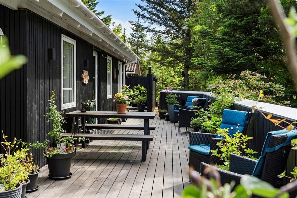 I kan glæde jer til at tilbringe masser af timer under åben himmel på den store lukkede terrasse, der omkranser huset. Her er mange gode kroge, hvor I kan sidde og nyde solen eller læse en god krimi i de fredfyldte rammer. Der er endvidere en udebruser i forlængelse af terrassen, hvor I kan tage opfriskende brusebade, når sommersolen bager. En del af terrassen er overdækket, og I kan tænde op i udepejsen, når aftenen falder på.