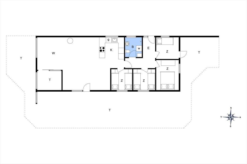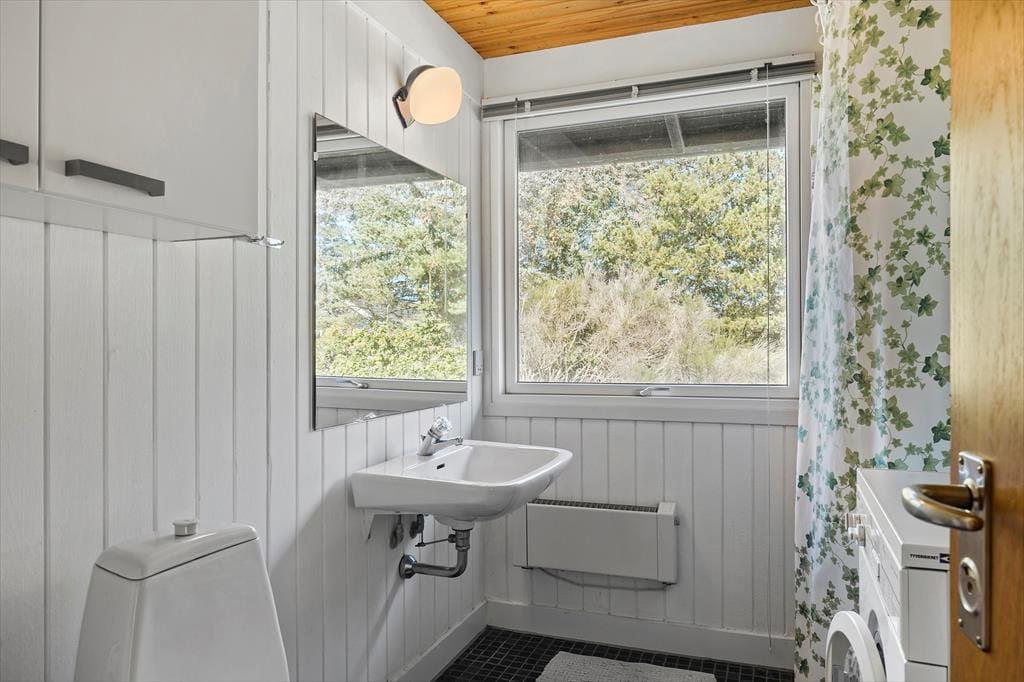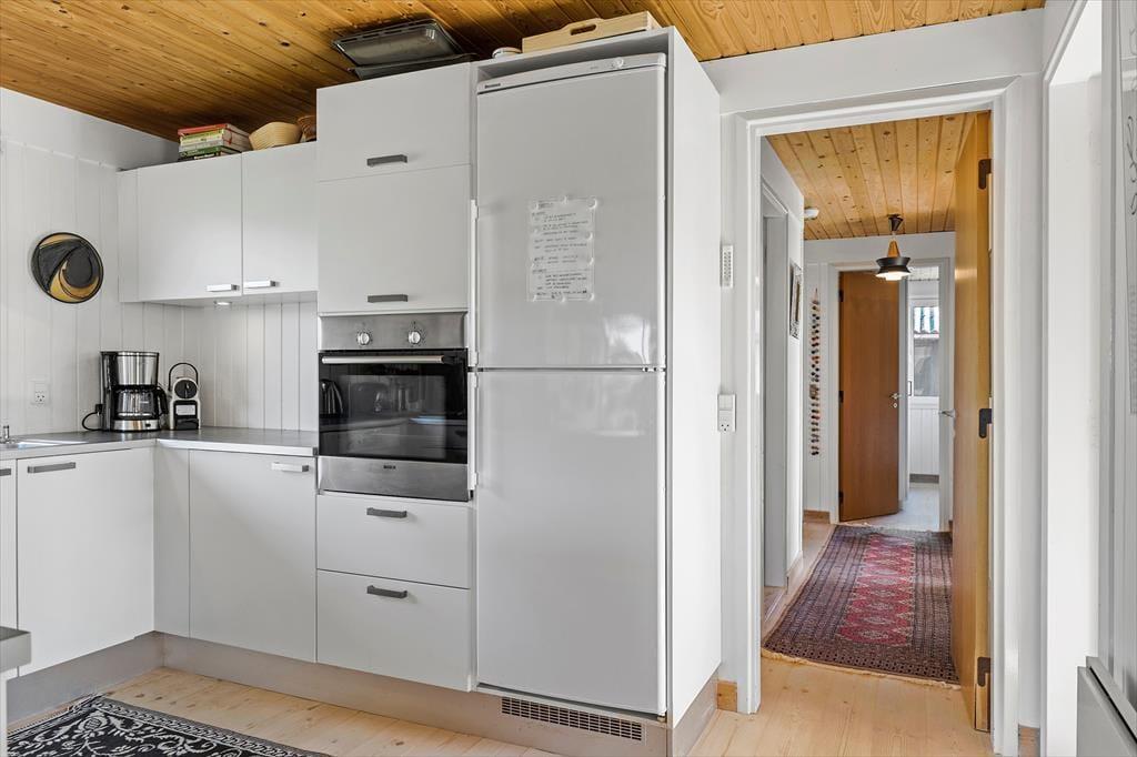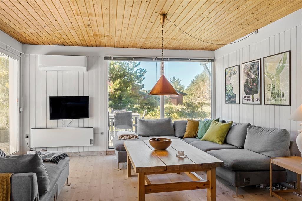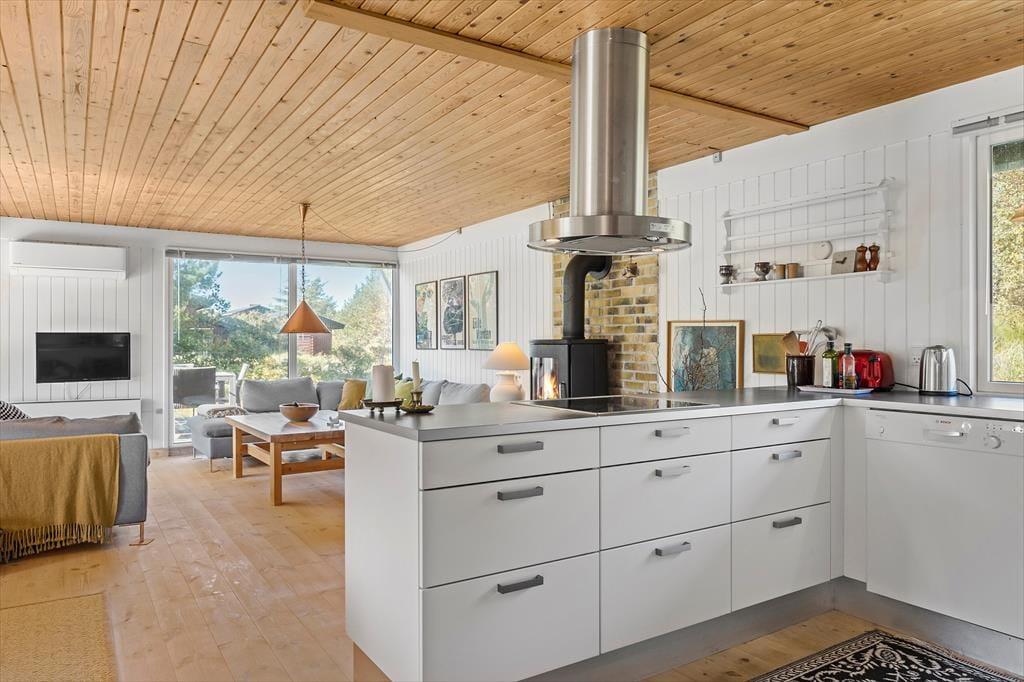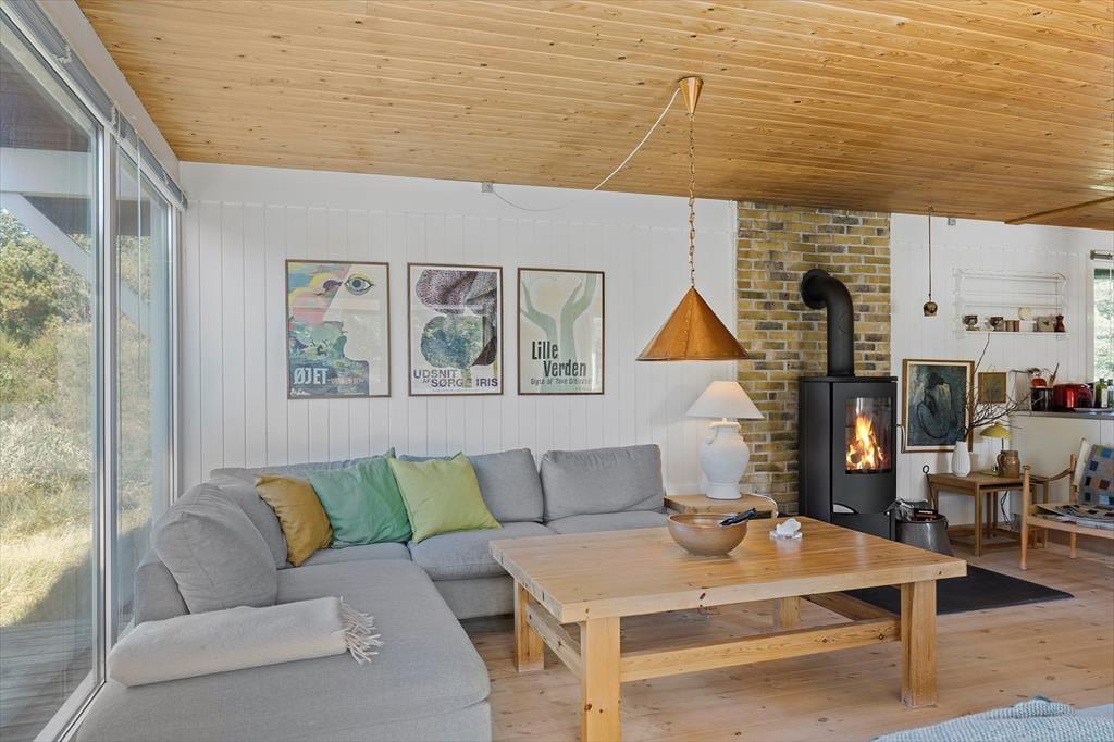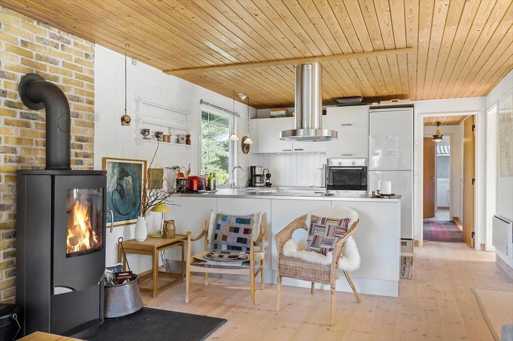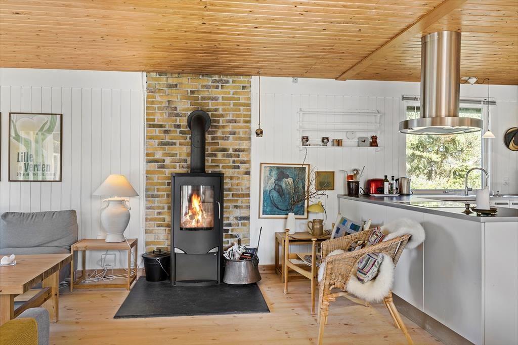 I sommerhuset har man formået at skabe en fin balance mellem retro og moderne, så de indendørs arealer virker både hyggelige og funktionelle. Farvetonerne er lyse, og de mange charmerende indretningsdetaljer giver det den helt rette sommerhusfornemmelse, der leder tankerne hen på endeløse feriedage uden faste planer. Har I lyst til at hygge jer inden døre, kan I samles i sommerhusets store opholdsrum, hvor stue og køkken er forenet. Her er der brændeovn til de kølige dage og aftner, og hvis sommersolen skinner, kan I hurtigt skyde havedørene til side, så der er direkte kontakt med terrassen. Uanset årstiden er det herligt at kunne sove, så længe I lyster på de fire soveværelser – og hvis I er utålmodige efter at komme af sted på udflugt, kan I hurtigt børste tænder og få et brusebad på badeværelset.