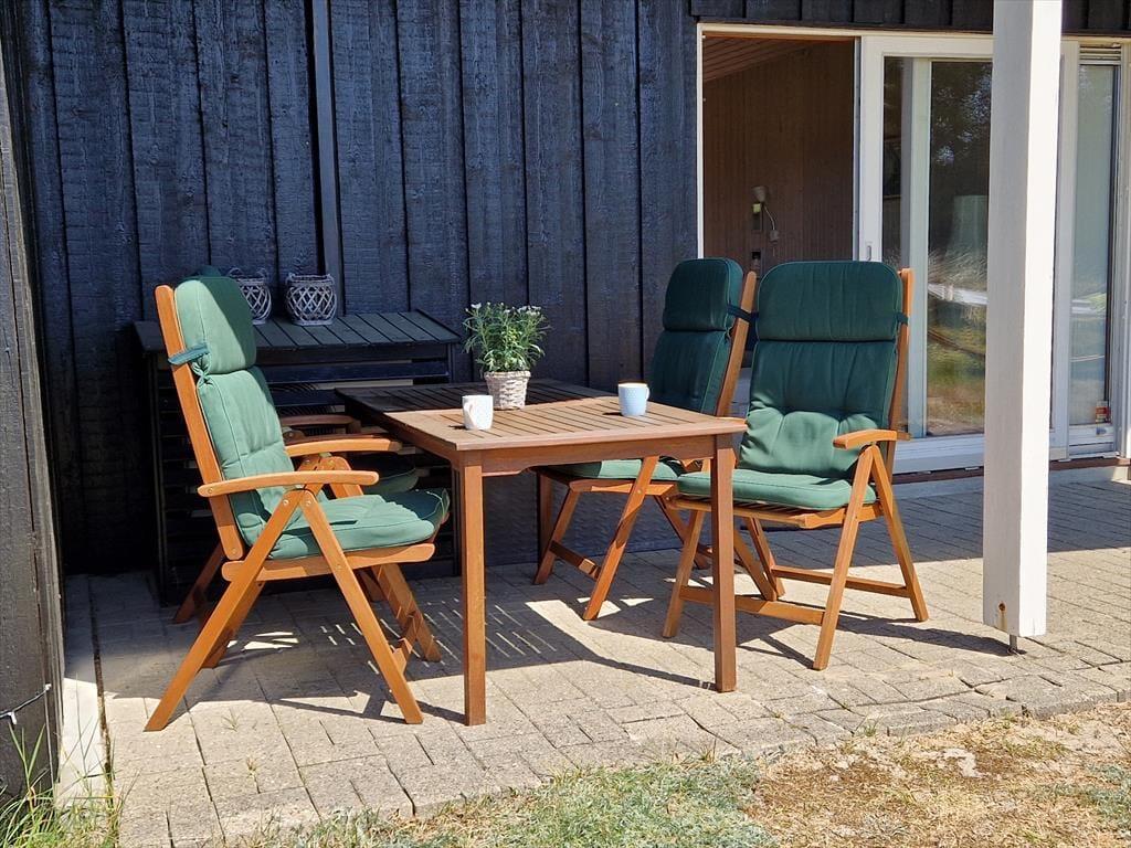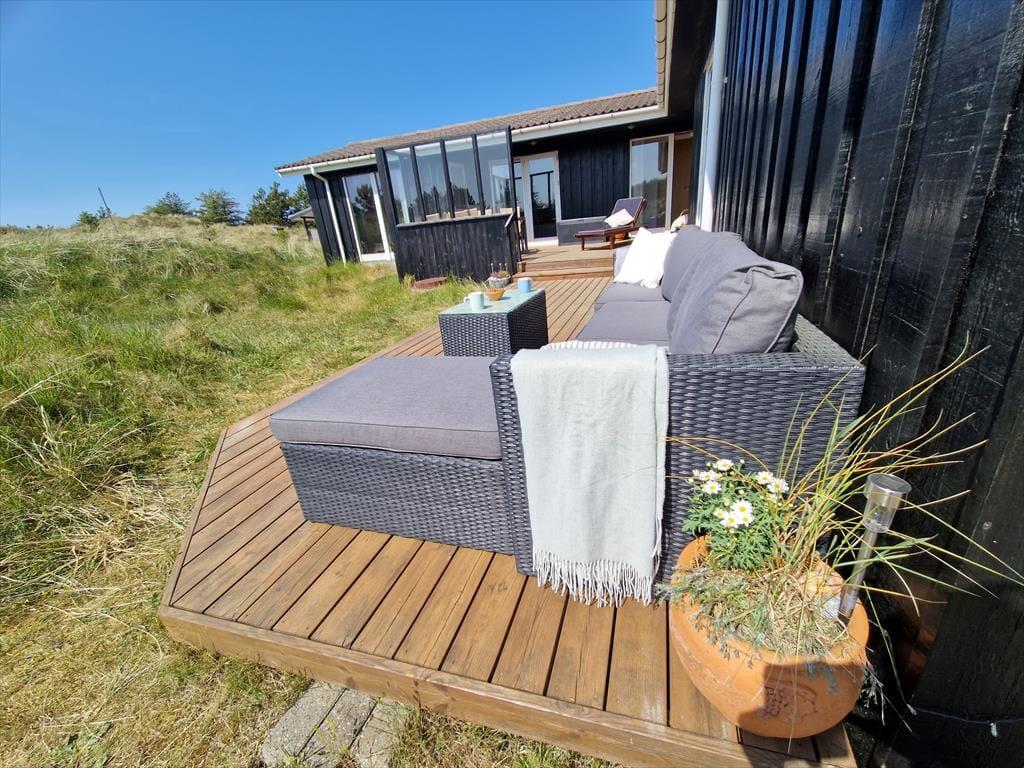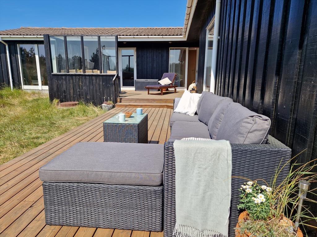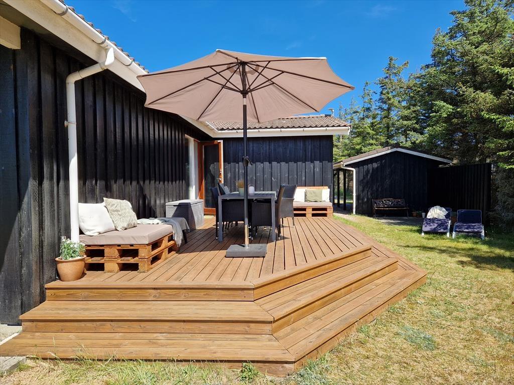 Feriens måltider og hyggestunder kan også foregå ude i det fri på sommerhusets terrasser, der er udstyret med havemøbler, liggestole, parasol og grill. Et af terrasseområderne er overdækket, mens et andet er delvist afskærmet, og resten er helt åbne – så med andre ord kan I udvælge den allerbedste siddeplads, inden I slår jer ned. Naturgrunden er stor og ligger dejligt ugeneret i bunden af en lukket vej, så her kan I lege, spille bold og sole jer på uforstyrret vis.