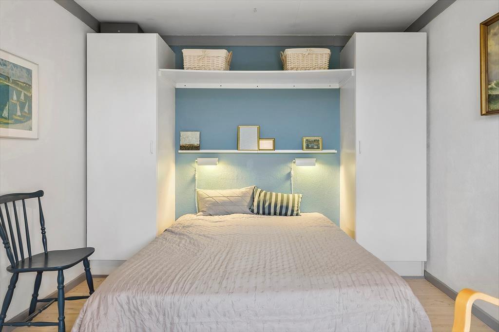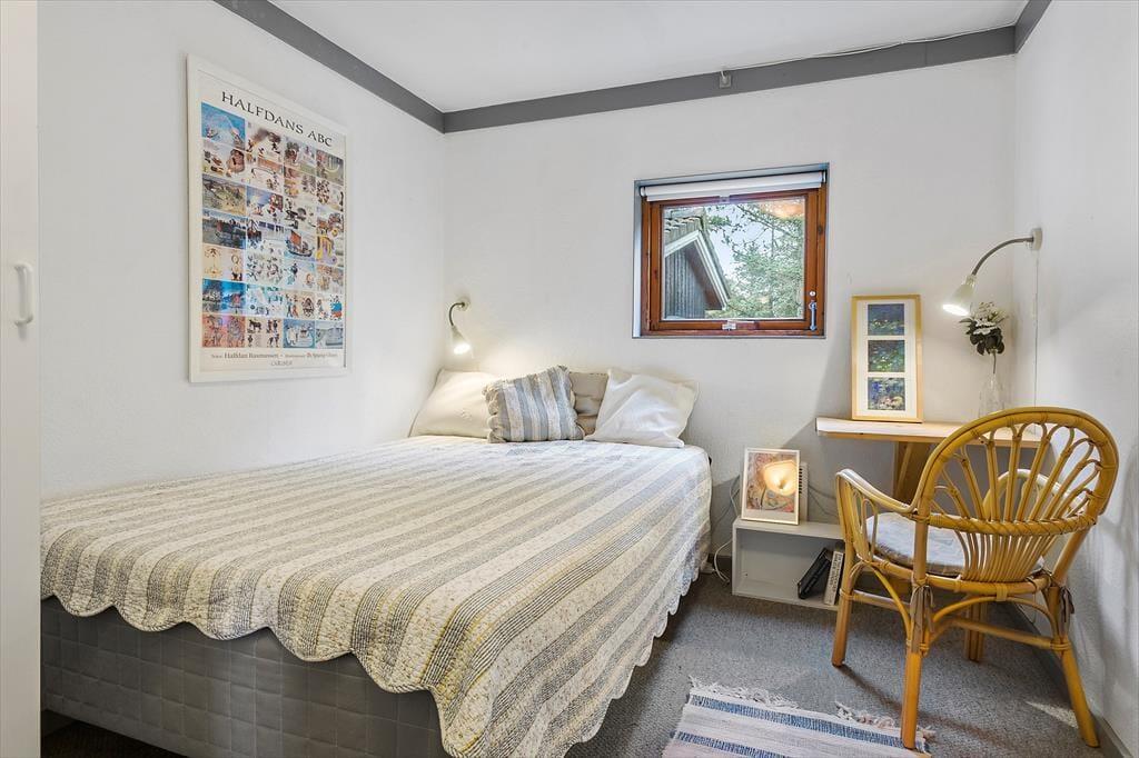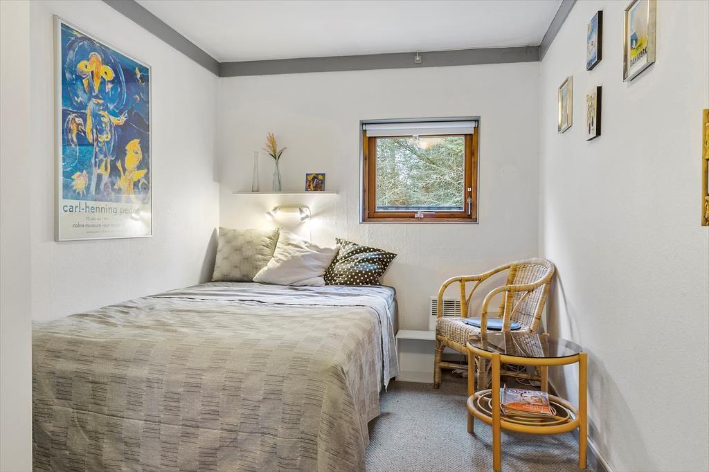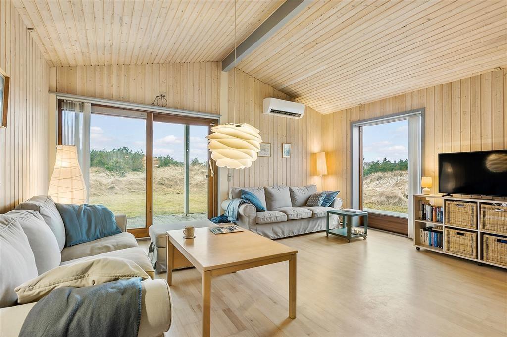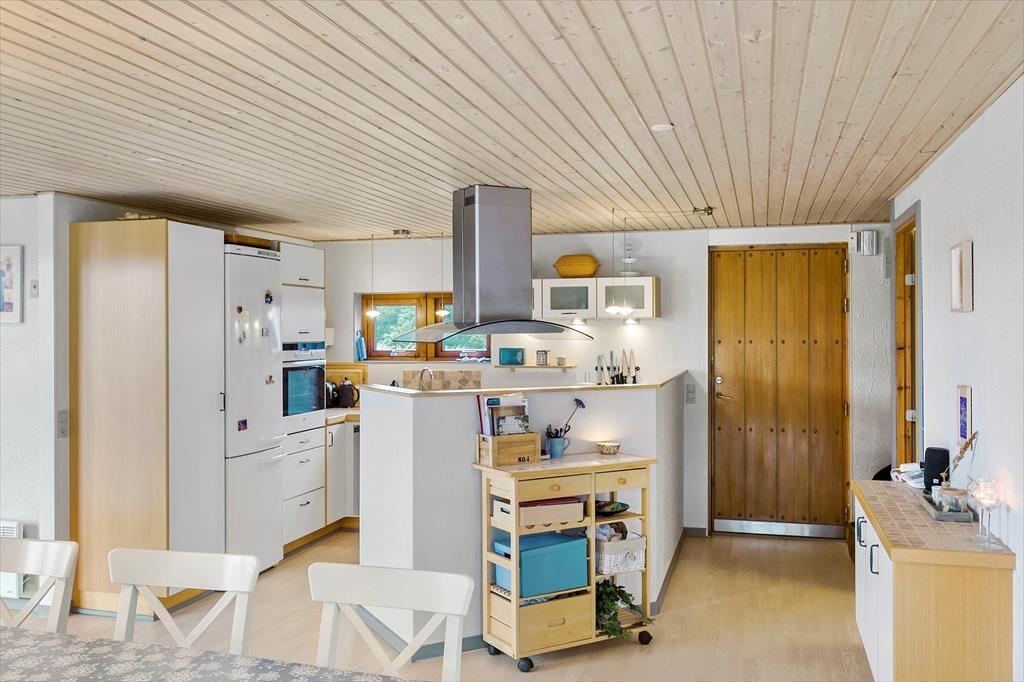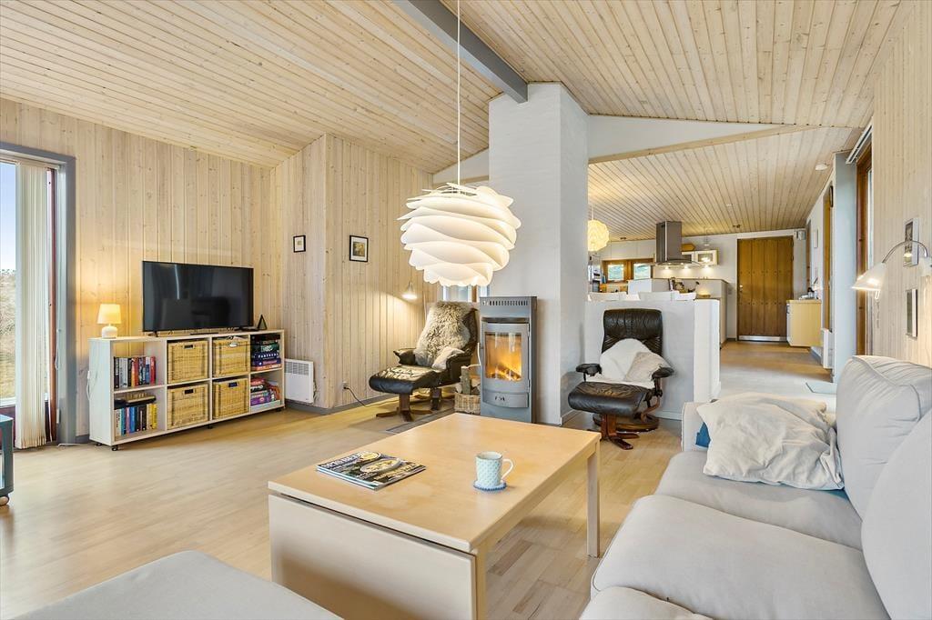 Med så naturskønne omgivelser er det oplagt at nyde ferielivet ude i det fri. Men der er nu også god grund til at slappe af og hygge sig inden døre i det 130 m2 store sommerhus, der med fire værelser og to badeværelser har en velfungerende indretning til otte personer. Rundt omkring finder I flere dejlige hyggekroge – for eksempel kan I sætte jer på det største af værelserne med en god bog og fri udsigt til naturgrunden. Naturen kan I også nyde synet af fra stuen, der er et charmerende opholdsrum med sofa, komfortable lænestole og tv med Chromecast. Fra stuen er der åben forbindelse og blot et par trin op til køkken-alrummet, der ligger midt i huset som et dejligt samlingspunkt, når det er tid til at lave mad eller spise.