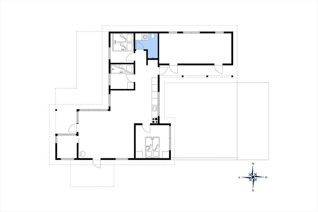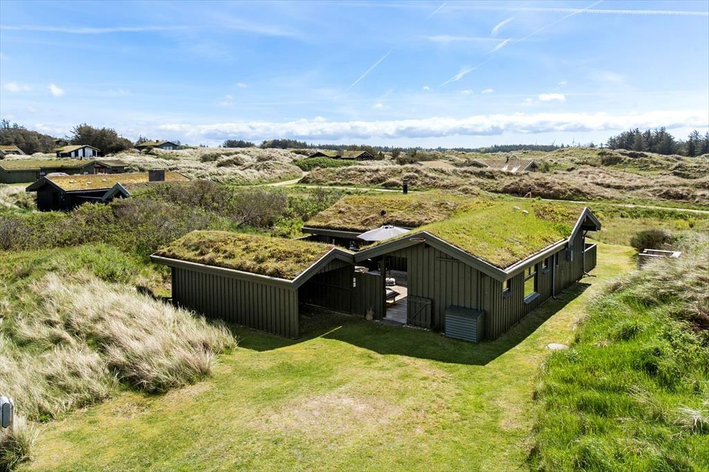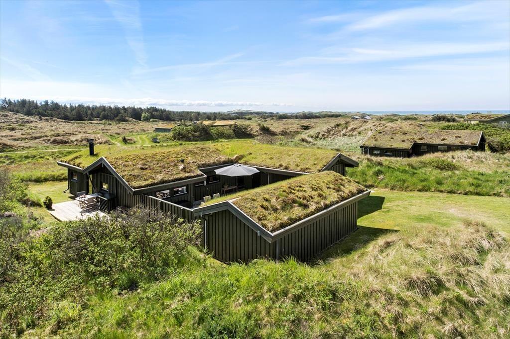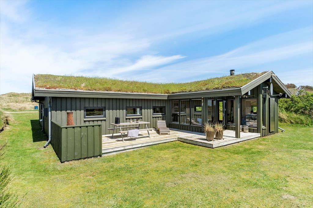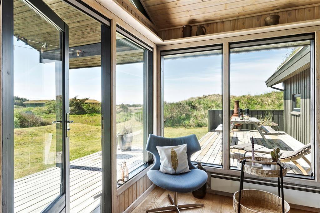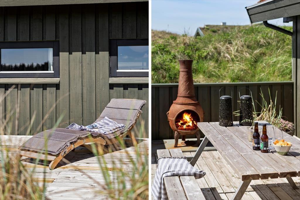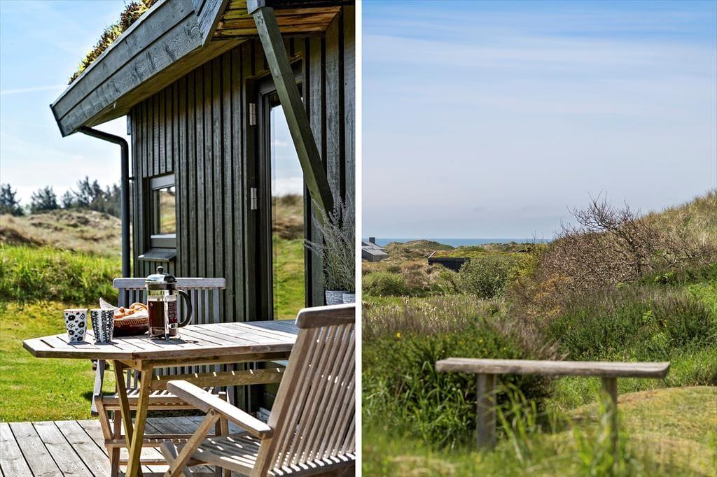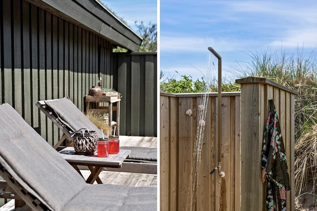 Rundt om sommerhuset er der anlagt flere terrasser, så det er nemt at finde en passende opholdsplads uanset solens placering på himlen. Imellem husets fløje og carporten er der ovenikøbet anlagt en lukket solgård: Her er der læ for vestenvinden, og selv på kølige dage føles det som en skøn oase. Derudover kan I efter en dukkert i Vesterhavet blive skyllet af under husets udebruser. Når I virkelig vil suge de skønne kystomgivelser til jer, er naturgrundens udsigtsbænk et perfekt sted at slå sig ned.
