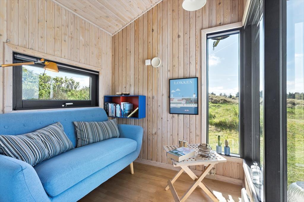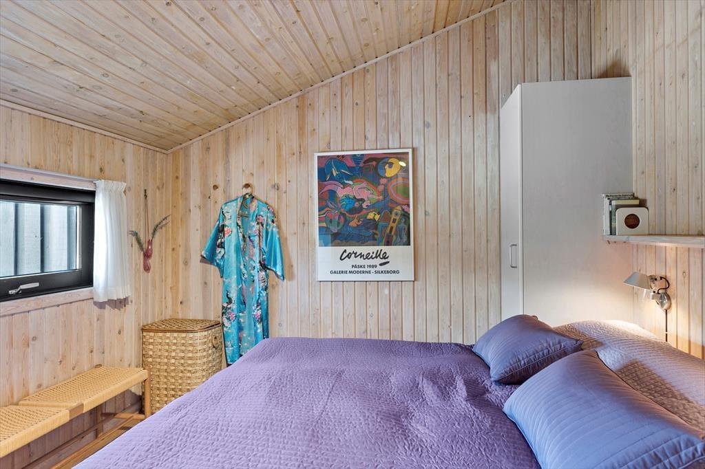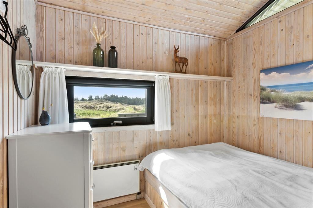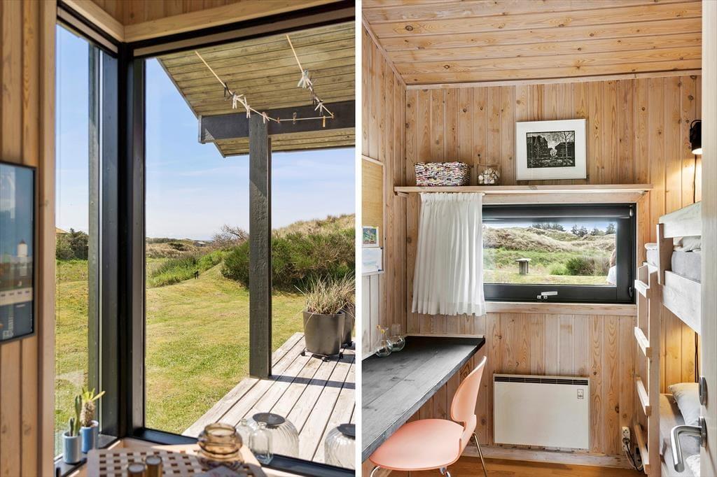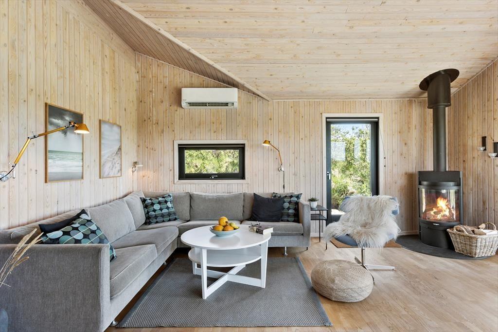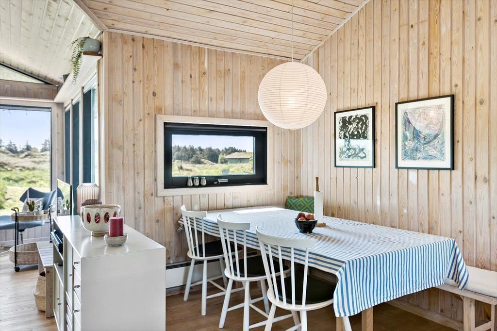 Saltums smukke naturomgivelser får I stor glæde af, selv når I opholder jer inde i sommerhuset. De store vinduespartier giver nemlig frit udsyn over det frodige, kuperede landskab – og der er endda havkig fra stuen. I det store opholdsrum, som netop består af stuen og et stort køkken i åben forbindelse, er vinduerne orienteret mod alle verdenshjørner, og det er med til at gøre rumfornemmelsen ekstra lys og luftig. I det flot renoverede hus er der træbeklædte vægge og loft til kip, ikke bare i opholdsrummet, men også på de tre gode soveværelser. Et badeværelse hører også med til planløsningen, og her er der blandt andet vaskemaskine, så I nemt kan få frisket feriegarderoben op.
