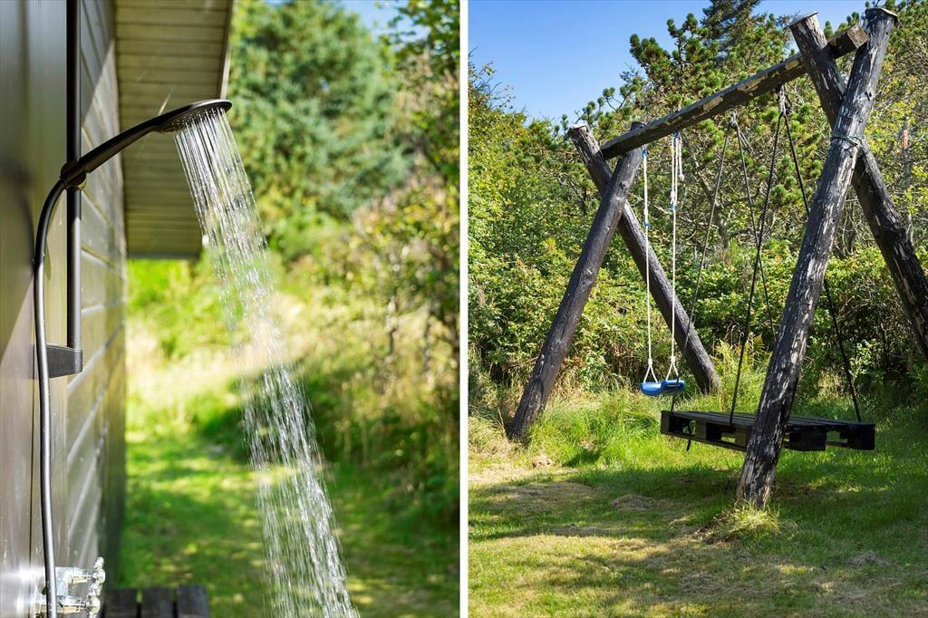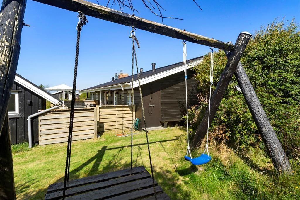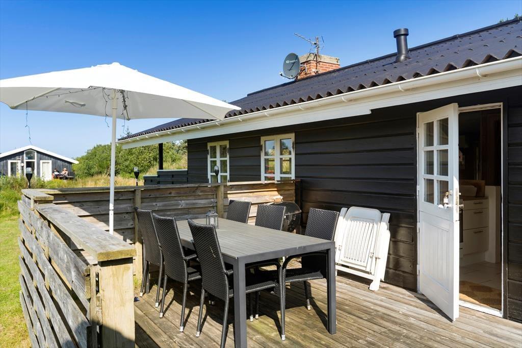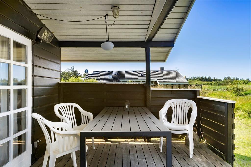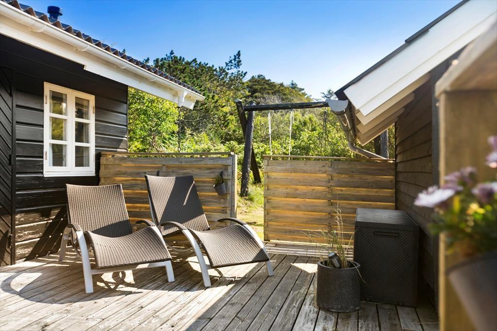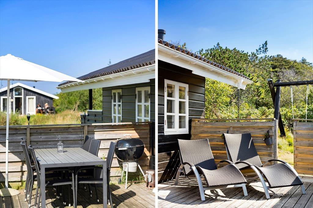 Sommerhusets to træterrasser er lige der, hvor sommerlivet skal nydes: Den ene er åben og sydvendt, så der er sol det meste af dagen, og mod vest ligger den anden, som med delvis overdækning er perfekt til lange aftener med grillmiddage og hyggesnak. En græsplæne omkranser huset, og den tætte randbeplantning er med til at skærme grunden af på kønneste vis.