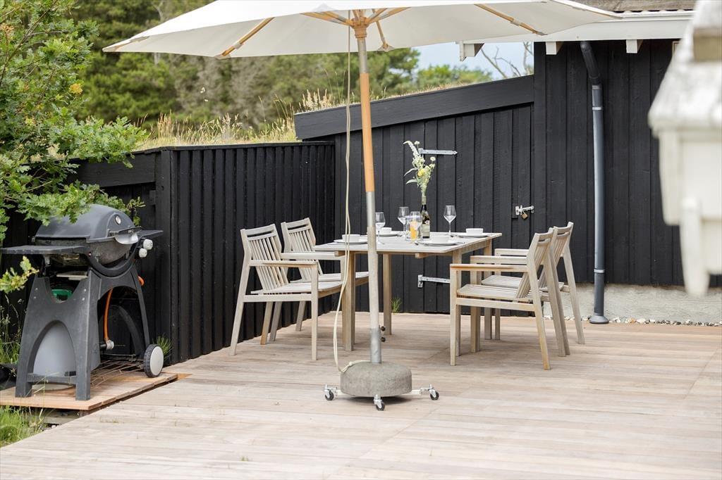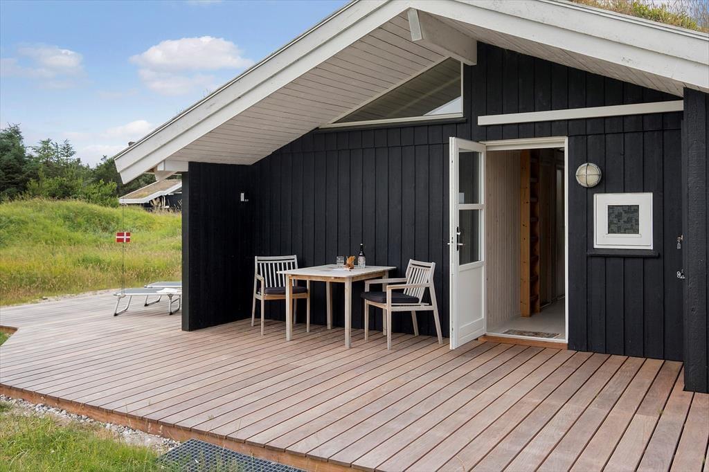 Ved sommerhuset er der anlagt en skøn terrasse, som er delvis åben og desuden har et mindre overdækket område. Man kan fra den østlige terrasse nyde morgensolen, og fra den vestvendte terrasse er der sol fra midt på dagen til solnedgang. Sommerhuset er placeret på en dejlig naturgrund, som giver den helt rette stemning når man sidder ude.