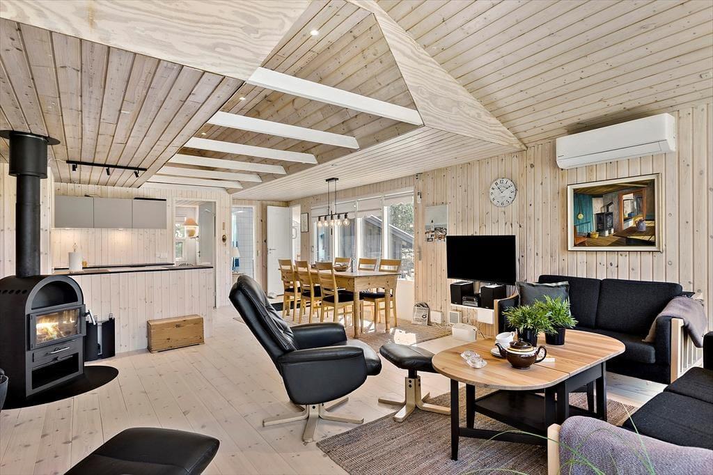Brændeovnen og de lyse trælister på væggene er nogle af de klassiske charmetræk her i sommerhuset, som har en fornuftig planløsning til fem personer. Den hyggespredende brændeovn står i stuen, som desuden er udstyret med store vinduespartier, der inviterer dagslyset indenfor og giver udsigt til naturgrunden. Som endnu en rar detalje er der åben forbindelse til køkkenet, så når der skal laves mad eller vaskes op, kan I samtidig hyggesnakke og nyde at være tæt på familien. Planløsningen byder i øvrigt på tre soveværelser samt et badeværelse med bruser og gulvvarme.