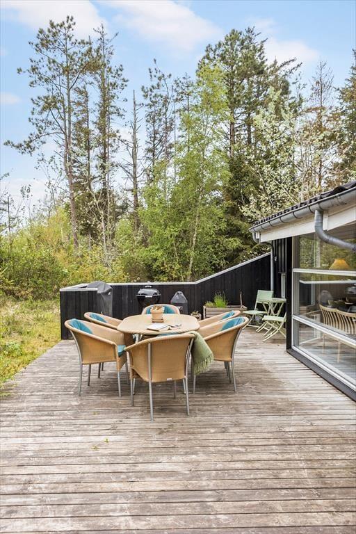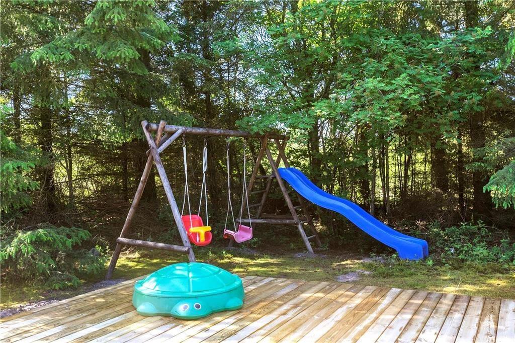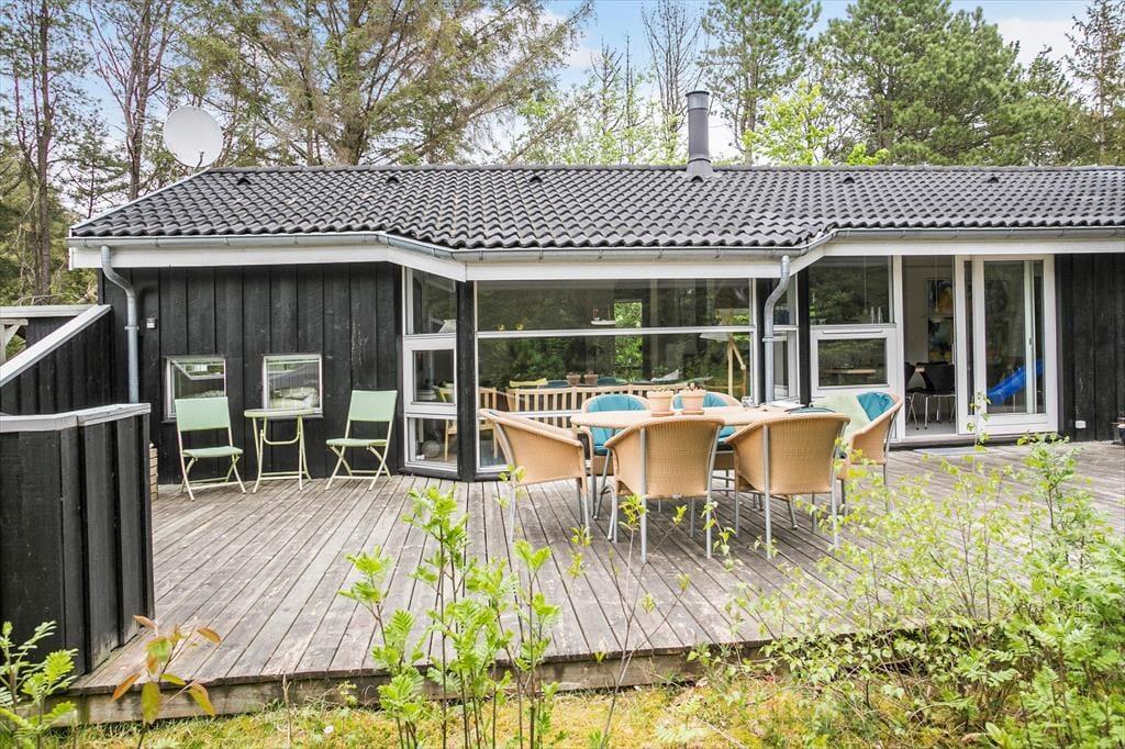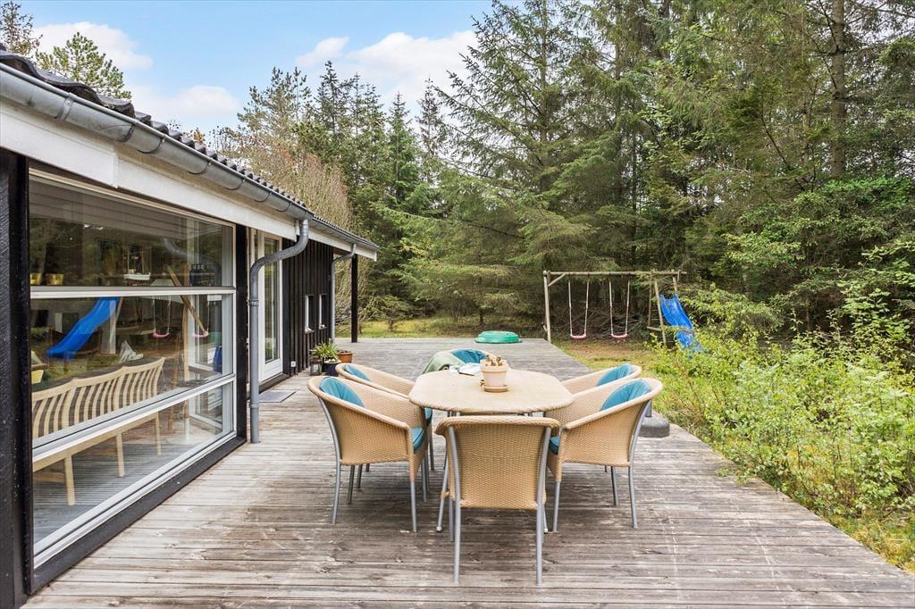 Den store naturgrund ligger dejligt ugeneret og er delvist lukket af træer, så man kan opholde sig udendørs i fred og ro. Den flotte træterrasse løber på tre sider af sommerhuset og har en lille overdækket del, så der er virkelig gode muligheder for at få det bedste ud af den danske sommer.