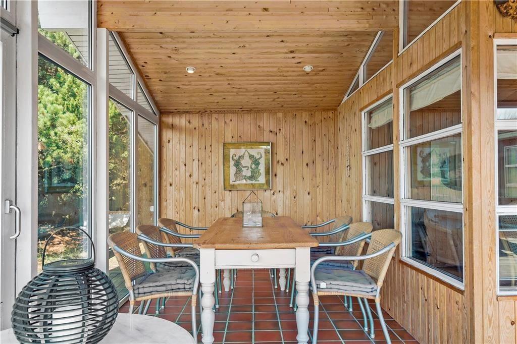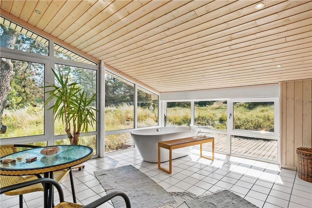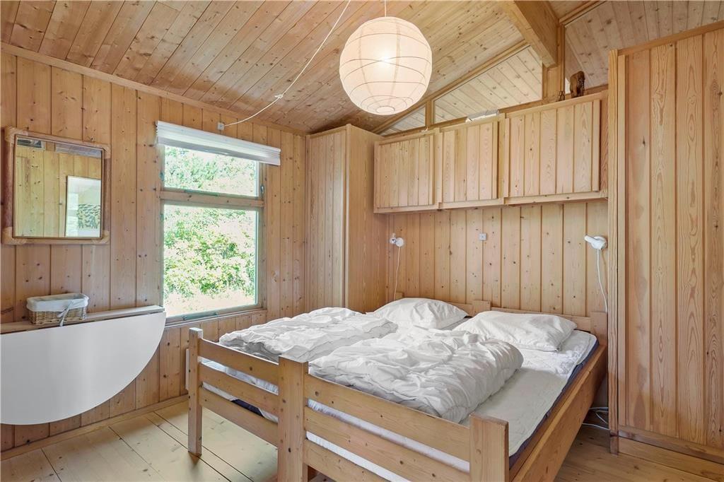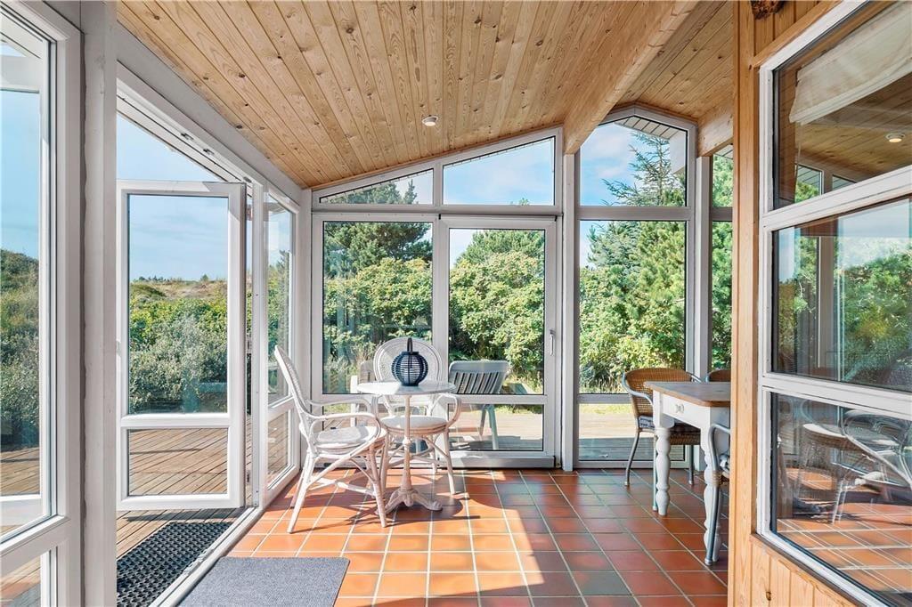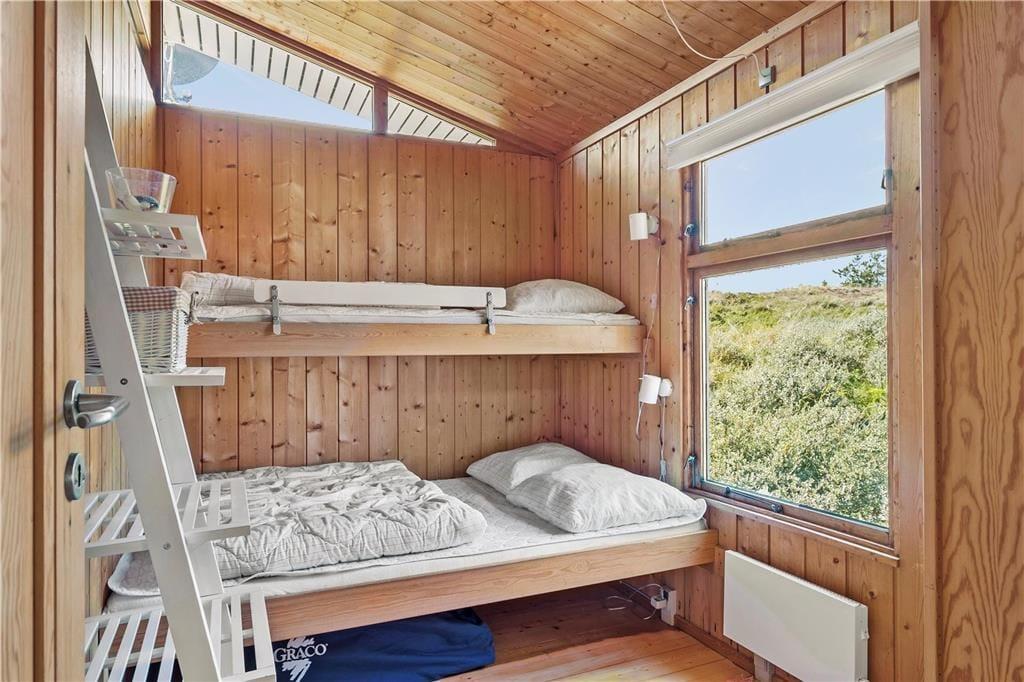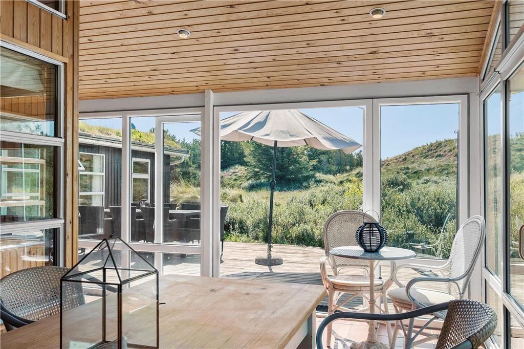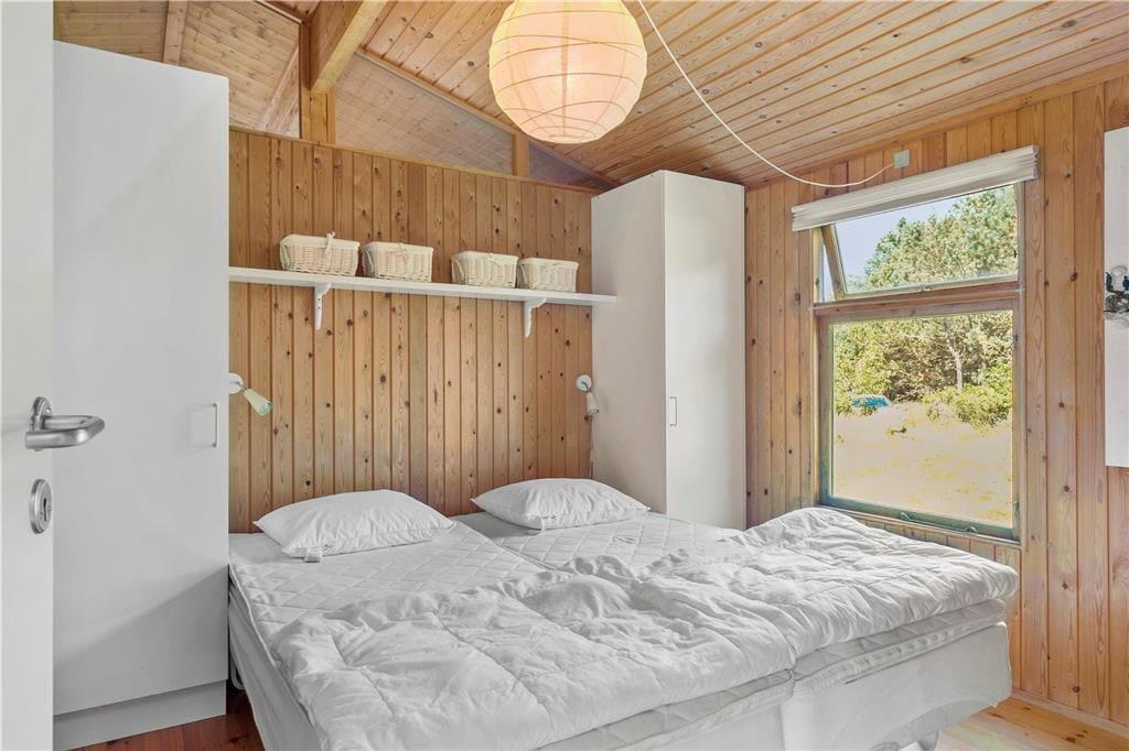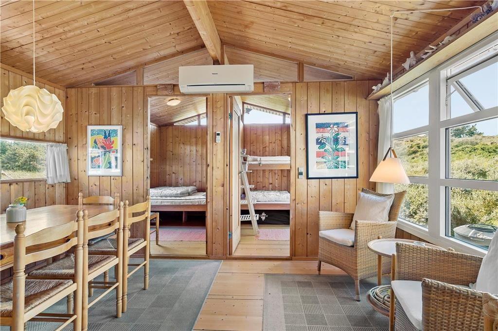 Sommerhuset har en god fordeling af rum og en praktisk indretning med fire værelser og to badeværelser hvoraf der på det ene er et lækkert badekar. Dette gør at man sagtens kan være to familier her på samme tid og alligevel trække sig lidt tilbage, hvis man trænger til at være sig selv. Her er indrettet med lyst træ, loft til kip og mange vinduer, som lukker dejligt meget lys ind i rummene. Midt i sommerhuset ligger køkkenet med spisekrog med bænk og adgang til bryggers med fryser, vaskemaskine og tørretumbler; i det hele taget er her rigt udstyret med hårde hvidevarer og andre hjælpemidler, så man kan få så afslappende en ferie som overhovedet muligt. I stuen kan der hygges foran brændeovnen, i gyngestolen med en god bog eller med tabletten logget på det trådløse internet Eller man kan søge ud i den store og lyse udestue, hvor solen hurtigt varmer rummet op. Fra de fleste rum kan man kigge ud på den charmerende klitgrund, og er man heldig spankulerer der ofte et dådyr eller nogle fasaner forbi helt tæt på huset.