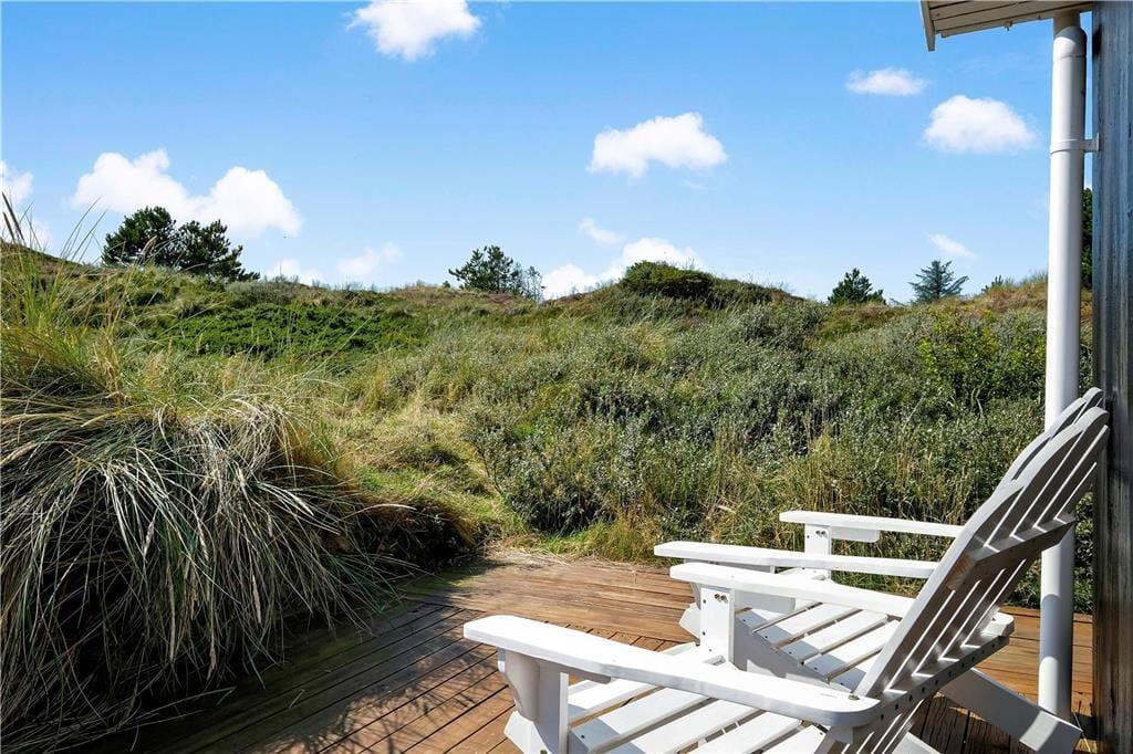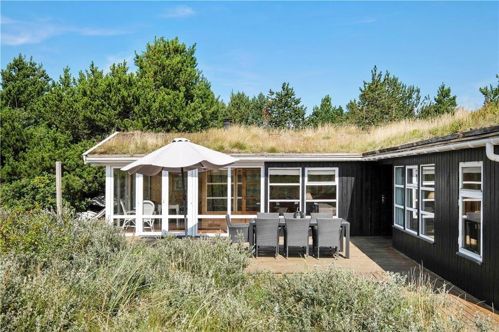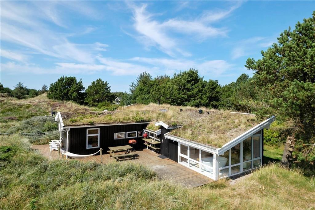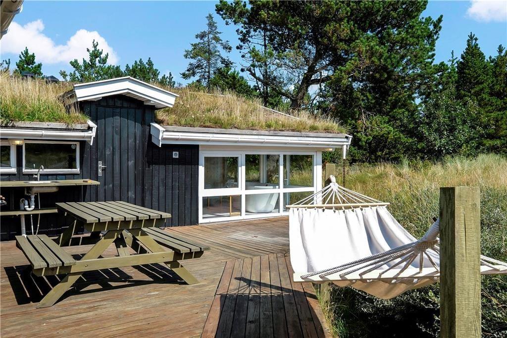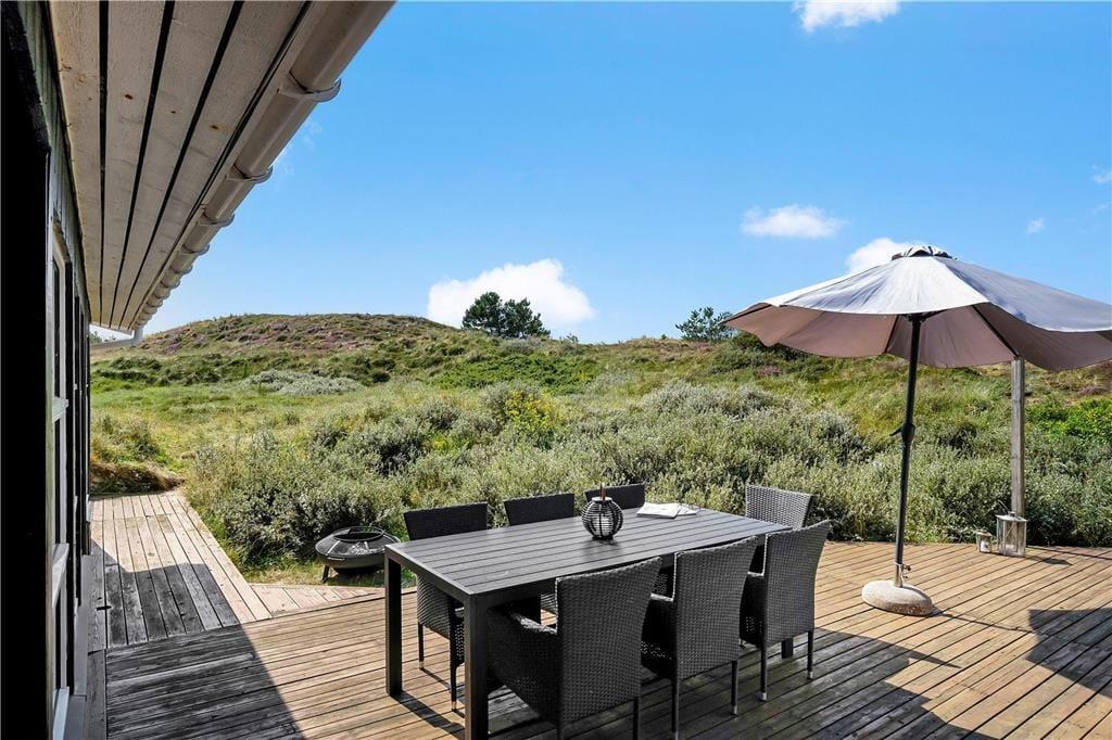 Udendørsfaciliteterne er absolut nogle af de skønneste i hele området. Sommerhuset ligger for foden af et klitområde, så man har alle muligheder for at tumle i bakkerne eller lege i nogle af de mange træer, som ligger på forsiden af grunden. På de tre store terrasser finder man mange små kroge med læ for vinden, hvor man kan nyde solen om dagen og spise måltider lavet på grillen om aftenen.