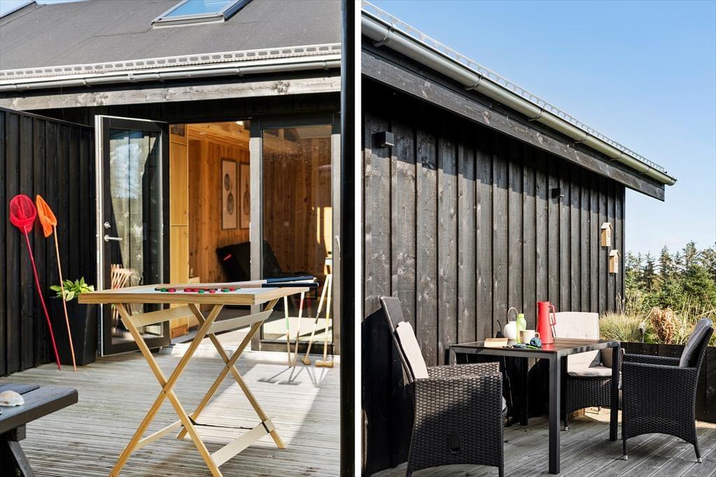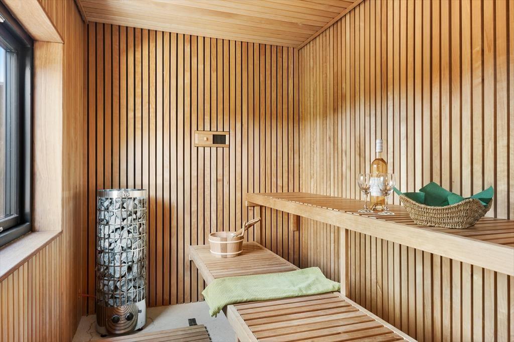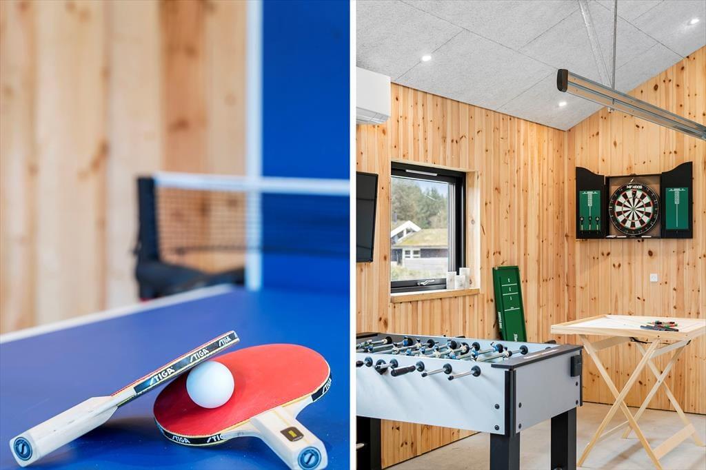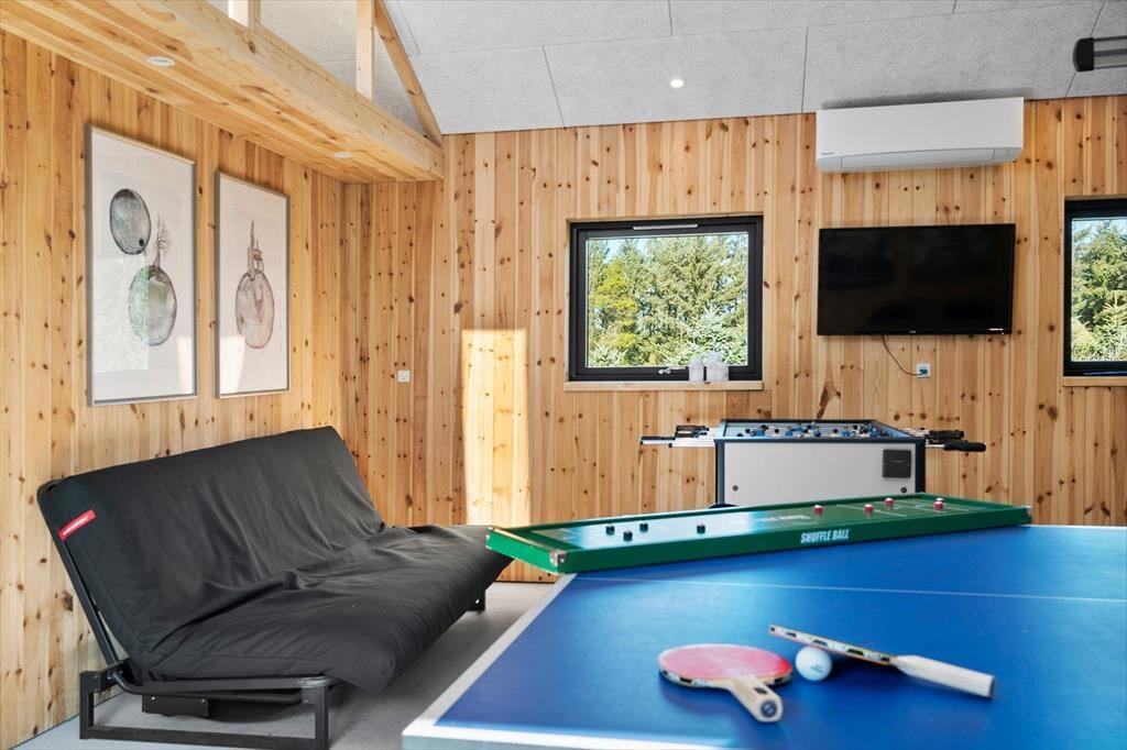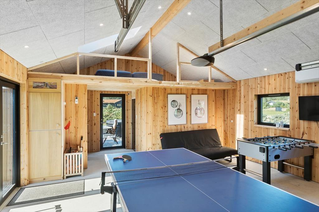 Indenfor venter en lys og moderne indretning, der indbyder til afslapning og hygge. Det rummelige opholdsrum er indrettet med en stilfuld kombination af klassisk sommerhusstemning og moderne design. Her kan I nyde hyggelige aftener foran brændeovnen, spille brætspil ved spisebordet eller lade jer underholde af en god film i sofaen. Det nye anneks er en sand fornøjelse for både børn og voksne. Her finder I et aktivitetsrum, der byder på bordtennis, bordfodbold, dart og meget mere. Efter en dag fuld af sjov kan I forkæle jer selv med en tur i den store sauna, der er designet til at give ren afslapning og velvære.