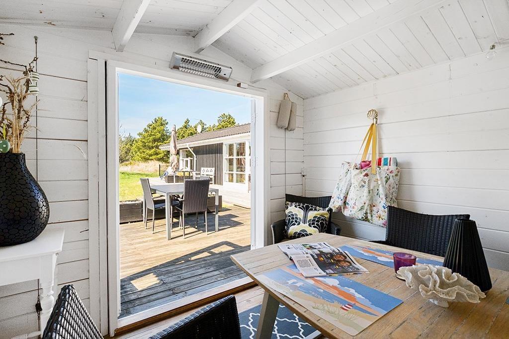 Der er terrasse rundt om det meste af sommerhuset, også en overdækket og afskærmet del med udgang fra stuen; her er ideelt om aftenen, når duggen falder. De smukke naturomgivelser med høje træer og de bakkede klitter er helt fantastiske, her kan man virkelig koble helt af fra hverdagens stress.