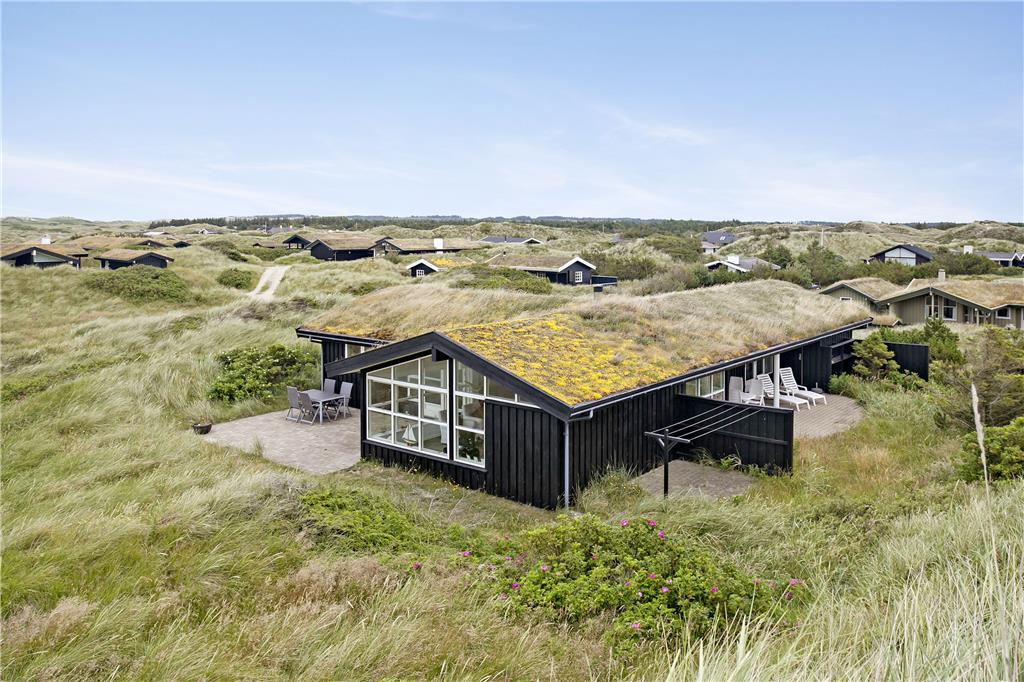 Sommerhuset ligger på en stor og kuperet klitgrund med højt græs, marehalm og lidt buske. Taget er dækket med græstørv og huset falder dermed helt naturligt ind i omgivelserne, mens bilen kan stå godt beskyttet for salt og sand i garagen. Terrasserne ligger på flere sider af sommerhuset, og man har derfor altid mulighed for at finde en ugeneret plads i solen. Om aftenen kan man forlænge dagen lidt på den overdækkede terrasse med et godt glas vin og lyden af Vesterhavet i baggrunden. Dansk sommer når den er bedst!