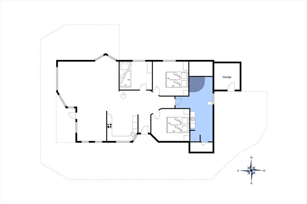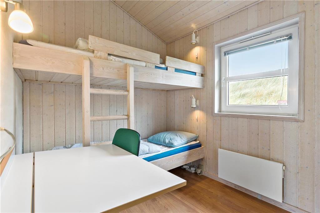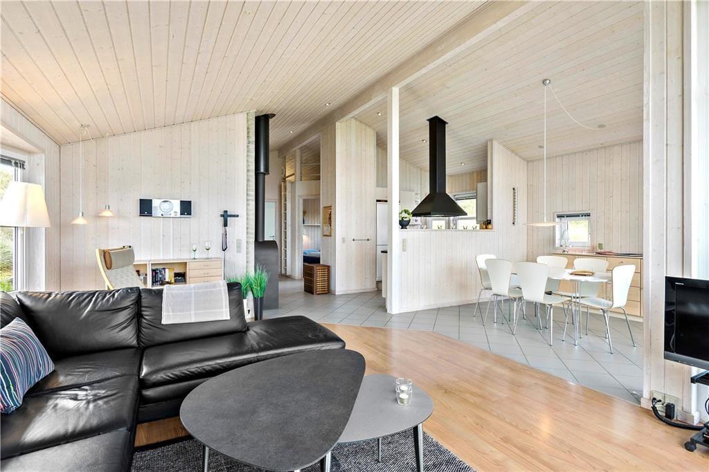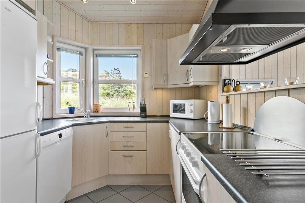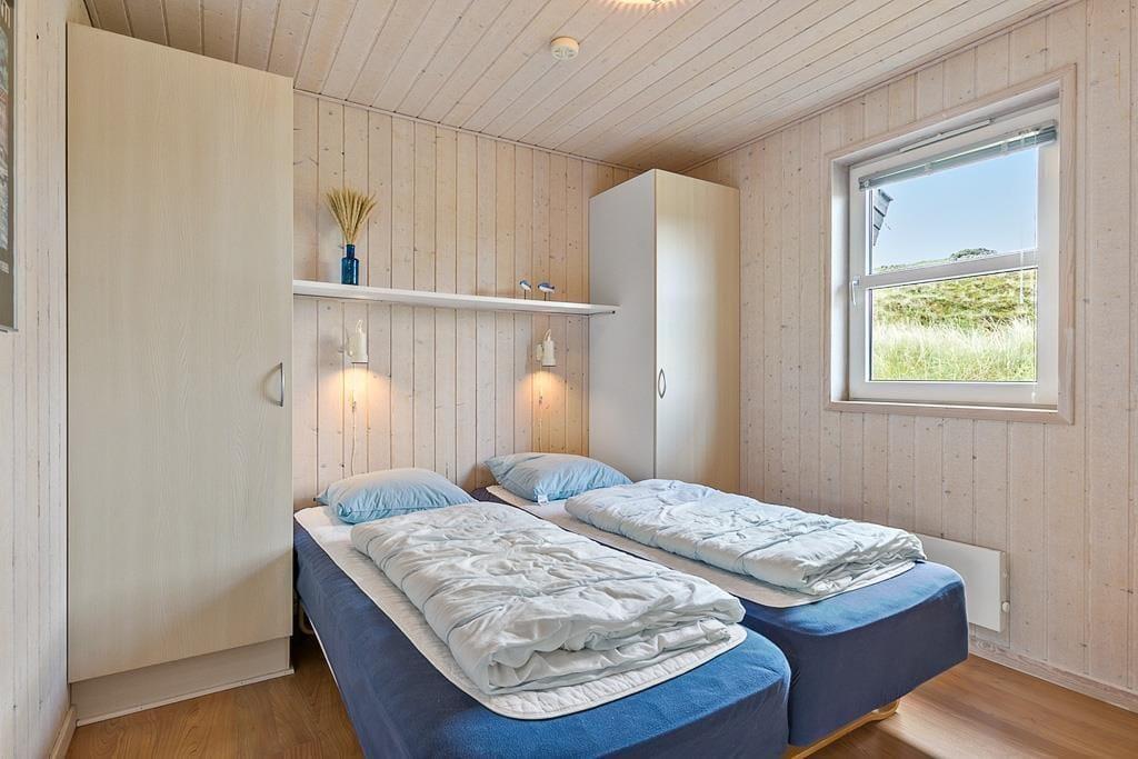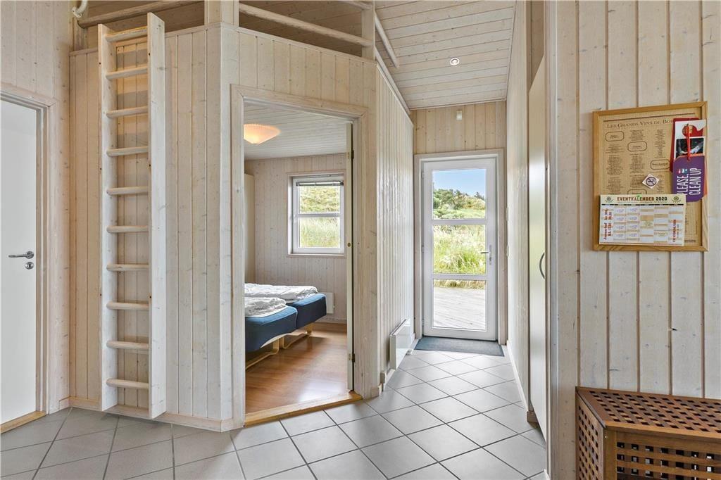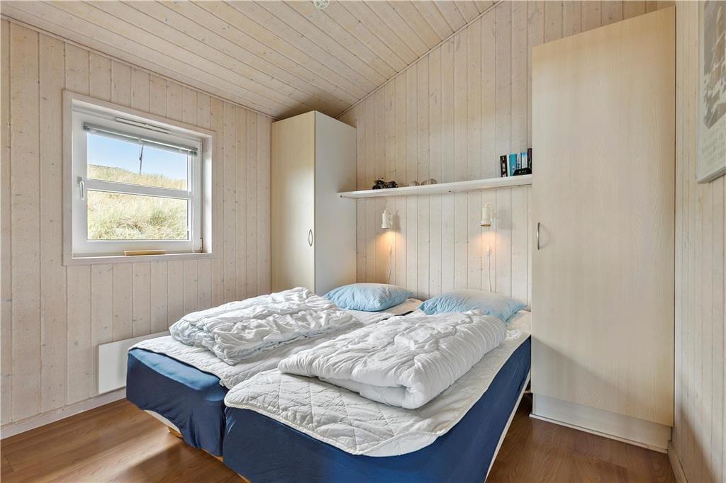 Sommerhuset har alt, hvad man kan drømme om for at få en vellykket ferie med familien; kig til havet, smagfuld og stilren indretning i høj kvalitet, masser af udstyr og hjælpemidler, egen wellnessstemning i form af spabad og sauna og moderne faciliteter som gratis, trådløst internet og parabol med danske og tyske kanaler. Huset er delt praktisk op med værelser og badeværelse til højre for indgangen og det åbne køkken-alrum med stue og brændeovn til venstre. Huset ligger højt, og gennem panoramavinduerne i stuen og spisestuen har man en skøn udsigt til klitområdet med Vesterhavet i baggrunden, som ligger små 500 meter væk. Med seks sengepladser, hvoraf de to er en køjeseng, danner sommerhuset de perfekte rammer for en lille familie eller for to par, som ønsker at holde ferie sammen.